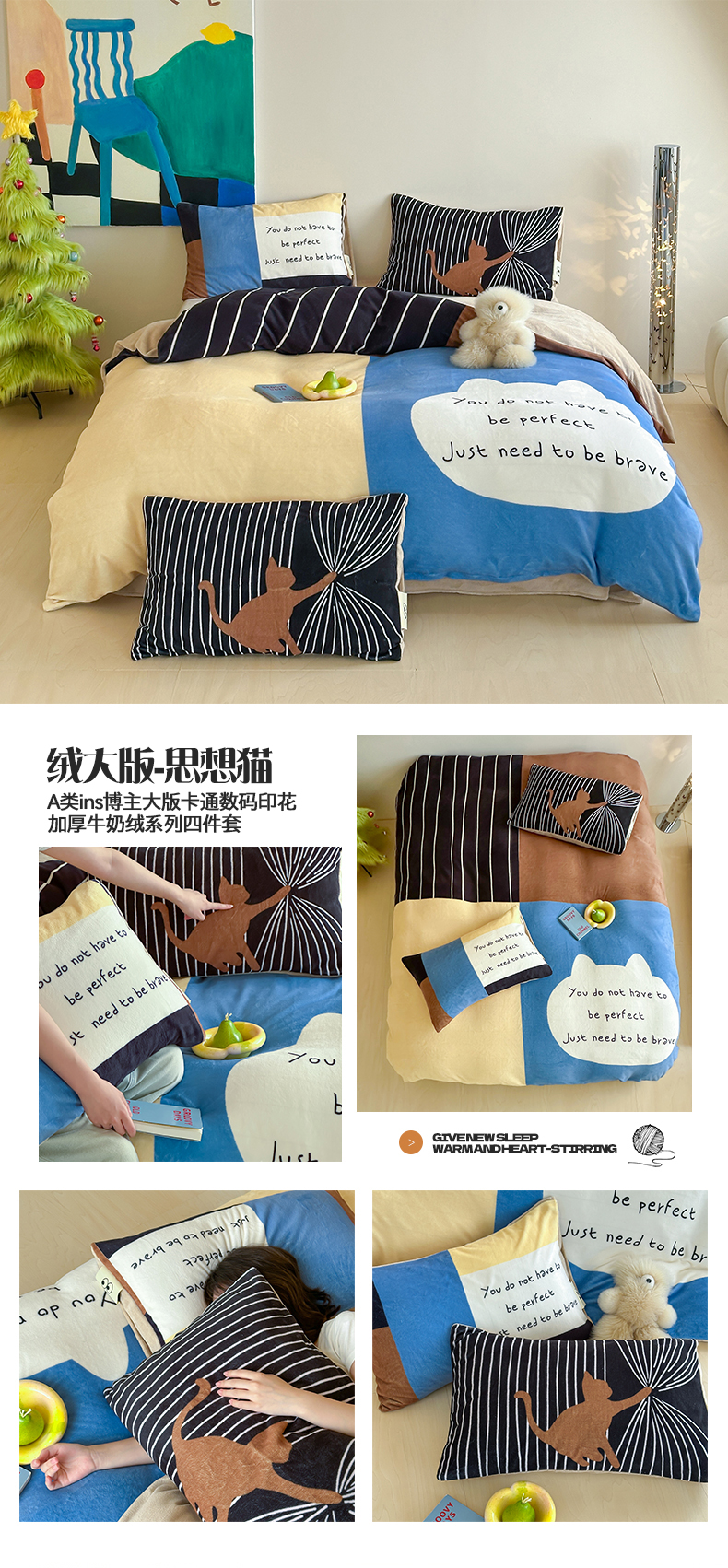桃子家居 2025新品A类ins博主大版卡通数码印花加厚牛奶绒系列四件套 绒大版-粉格蕾丝喵