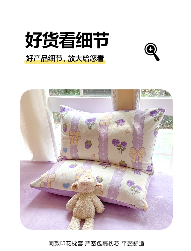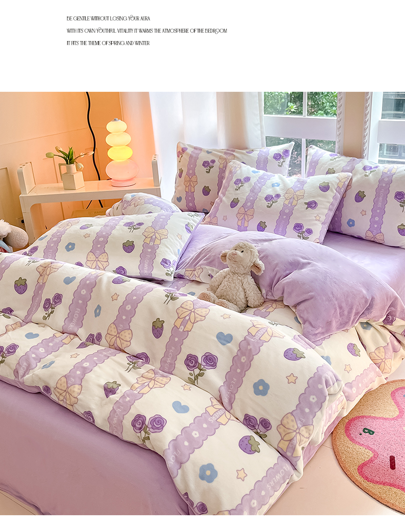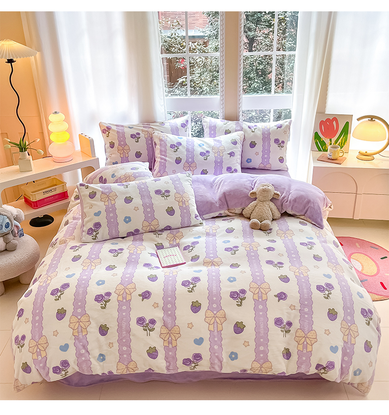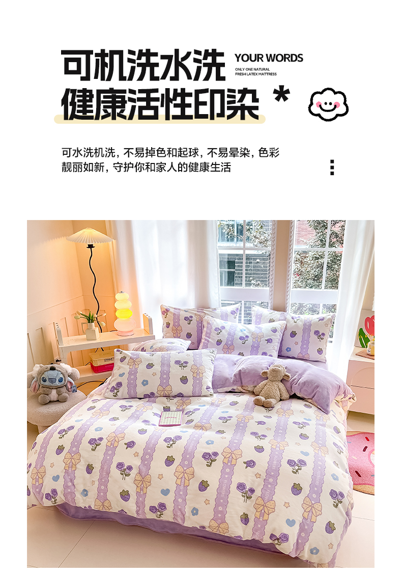 当前位置: 91家纺网 > 商品网购 > 床品套件 > 四件套 > 牛奶绒四件套 > 佳汐蓝家纺 2025新款190克高克重牛奶绒印花四件套 甜蜜草莓-紫