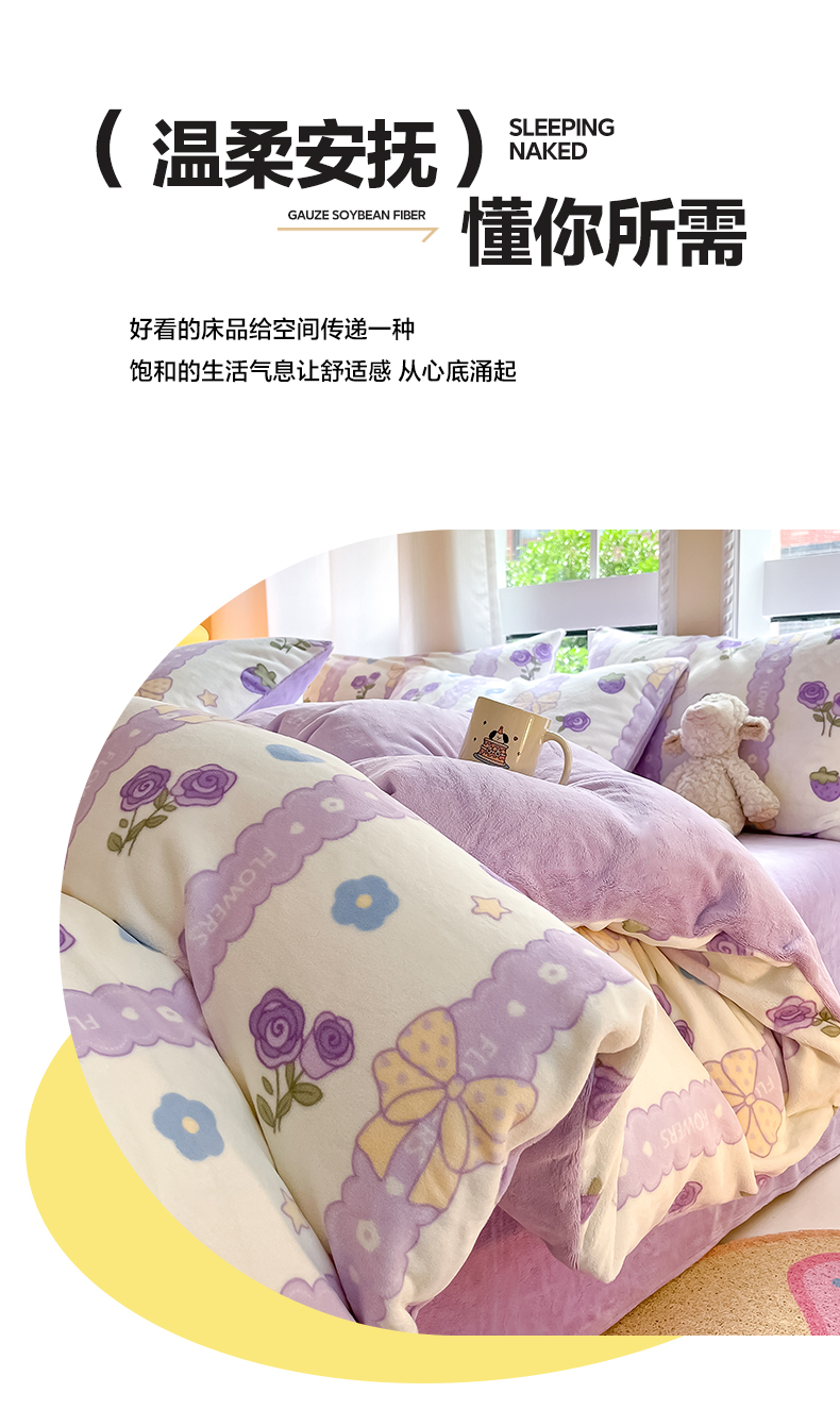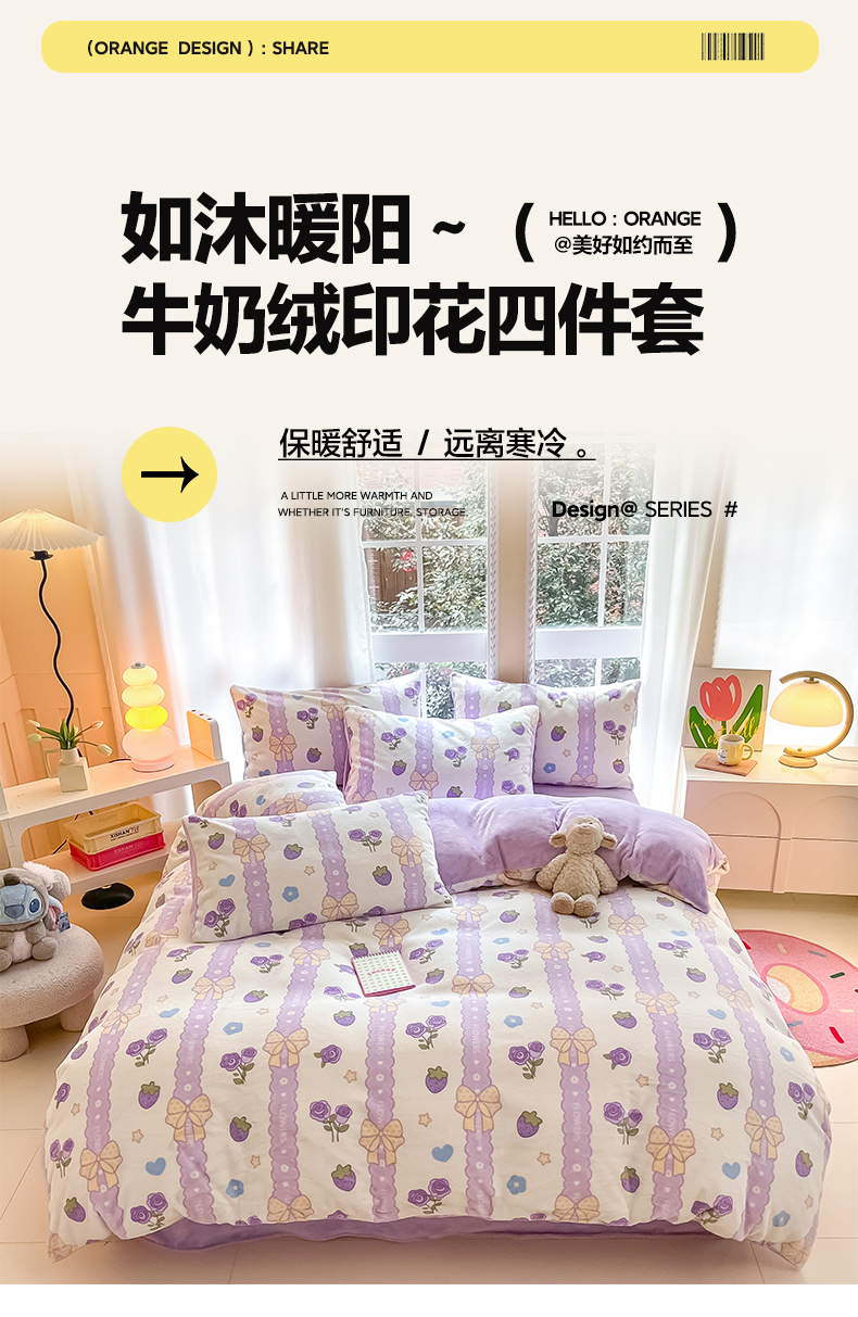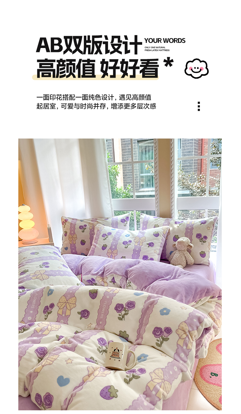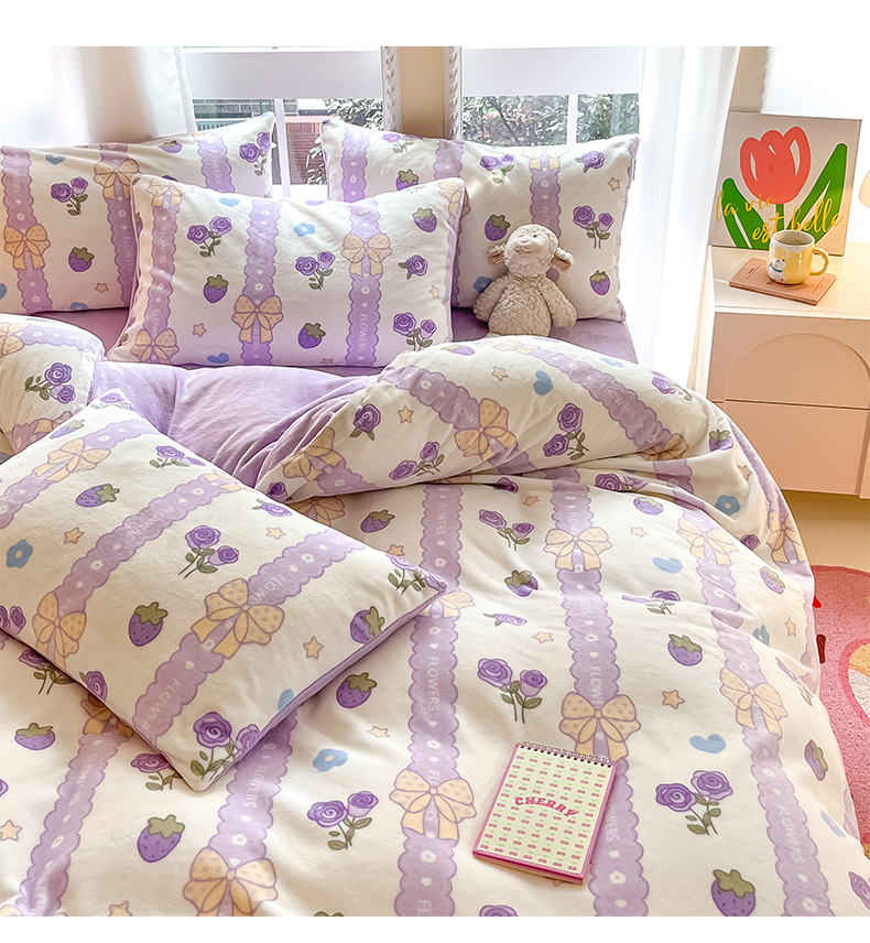 当前位置: 91家纺网 > 商品网购 > 床品套件 > 四件套 > 牛奶绒四件套 > 佳汐蓝家纺 2025新款190克高克重牛奶绒印花四件套 甜蜜草莓-紫