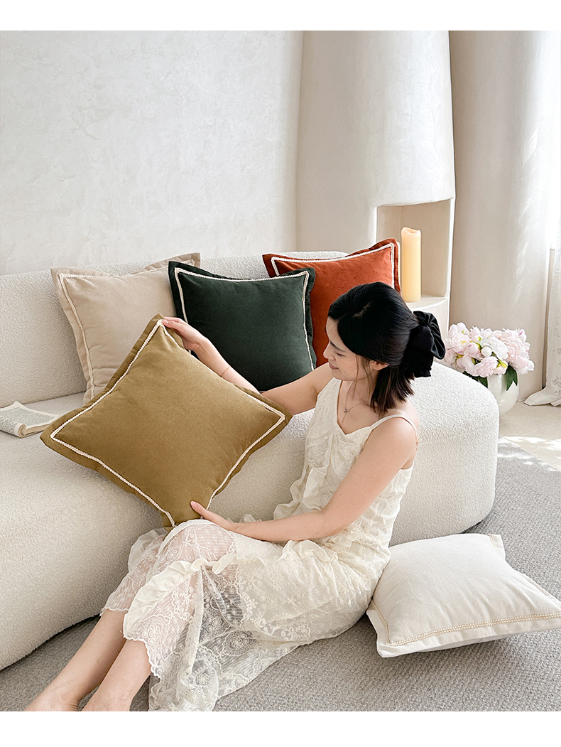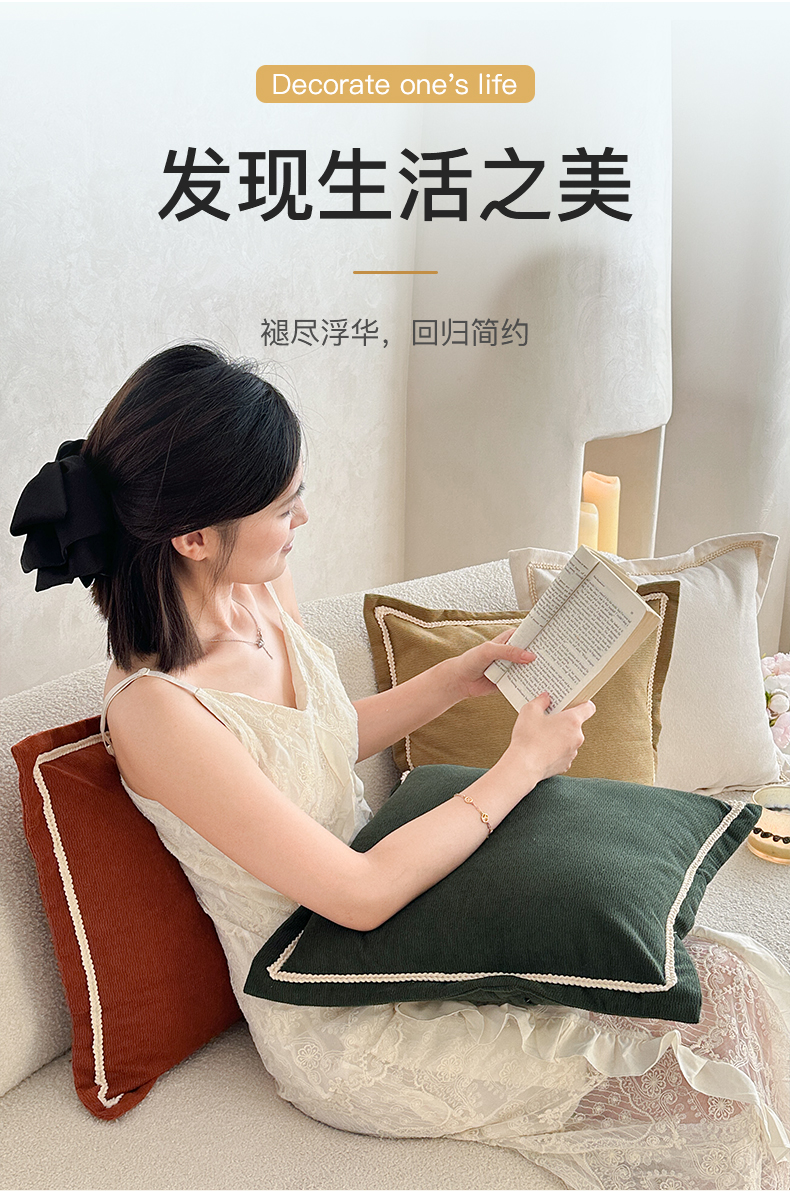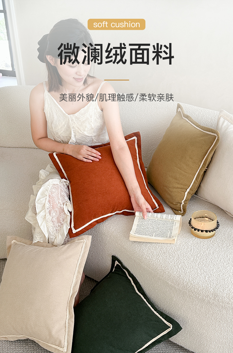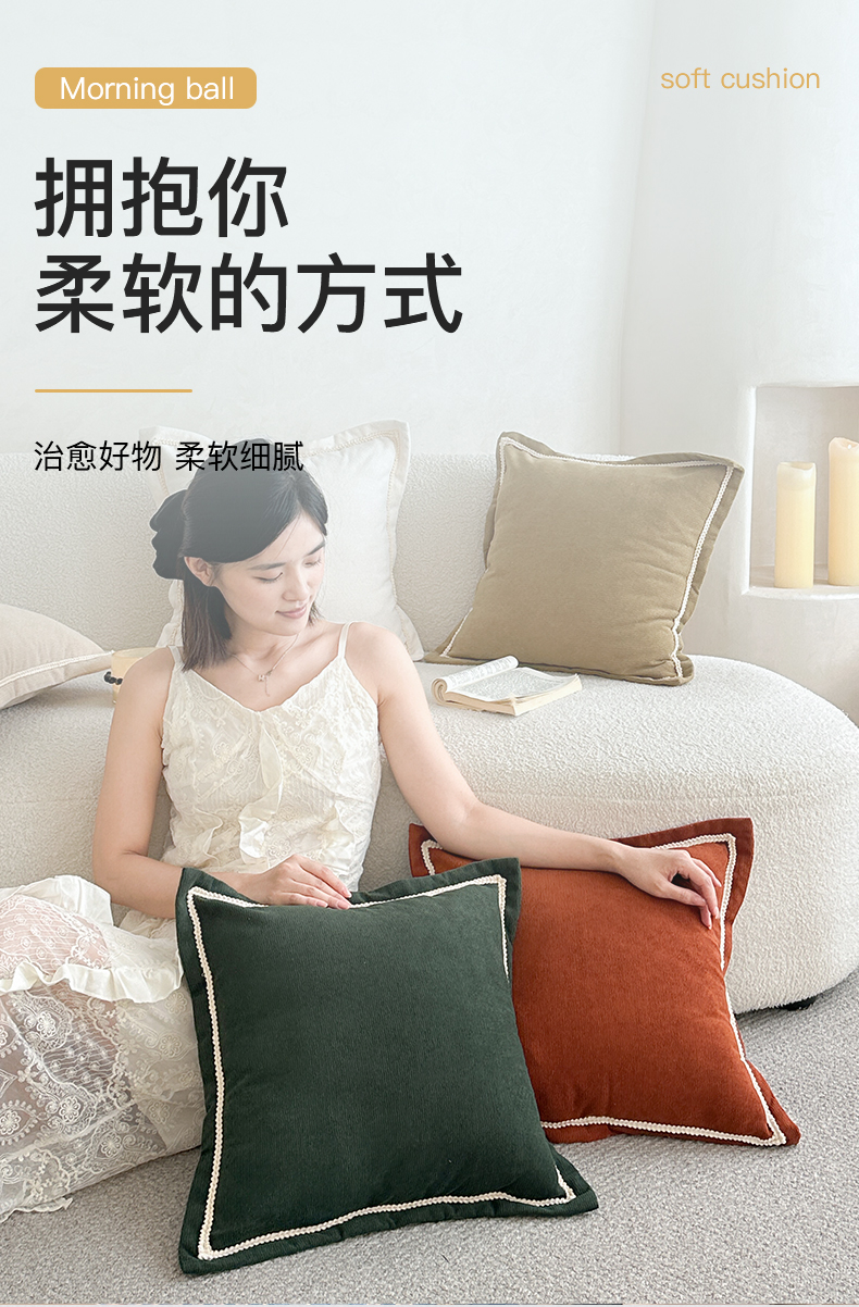 (总)美茉家居 2025新款加厚高端沙发布雪尼尔滚边方枕抱枕,缎面红,孔雀绿,南瓜橘,烟雨灰,珍珠白