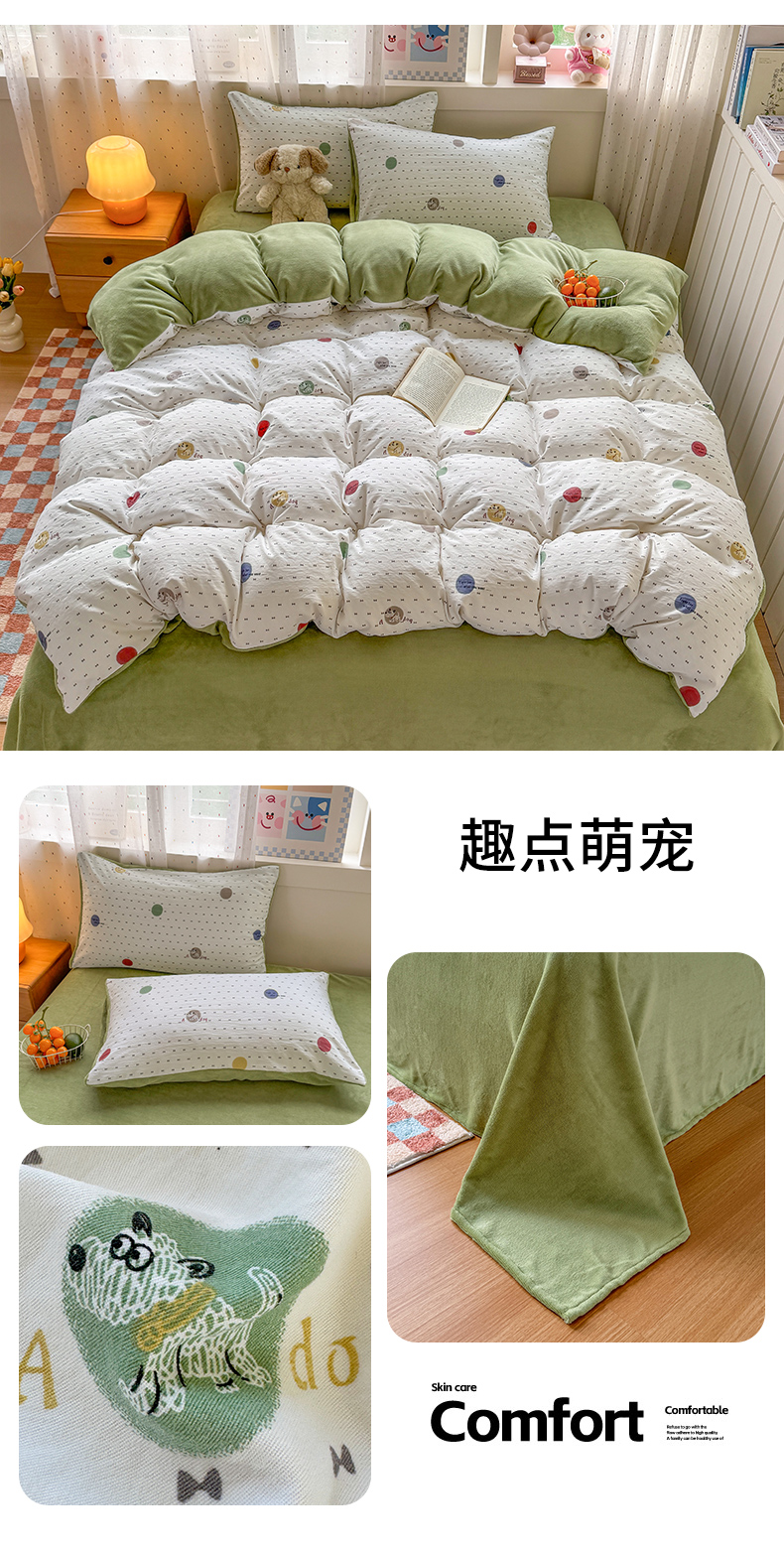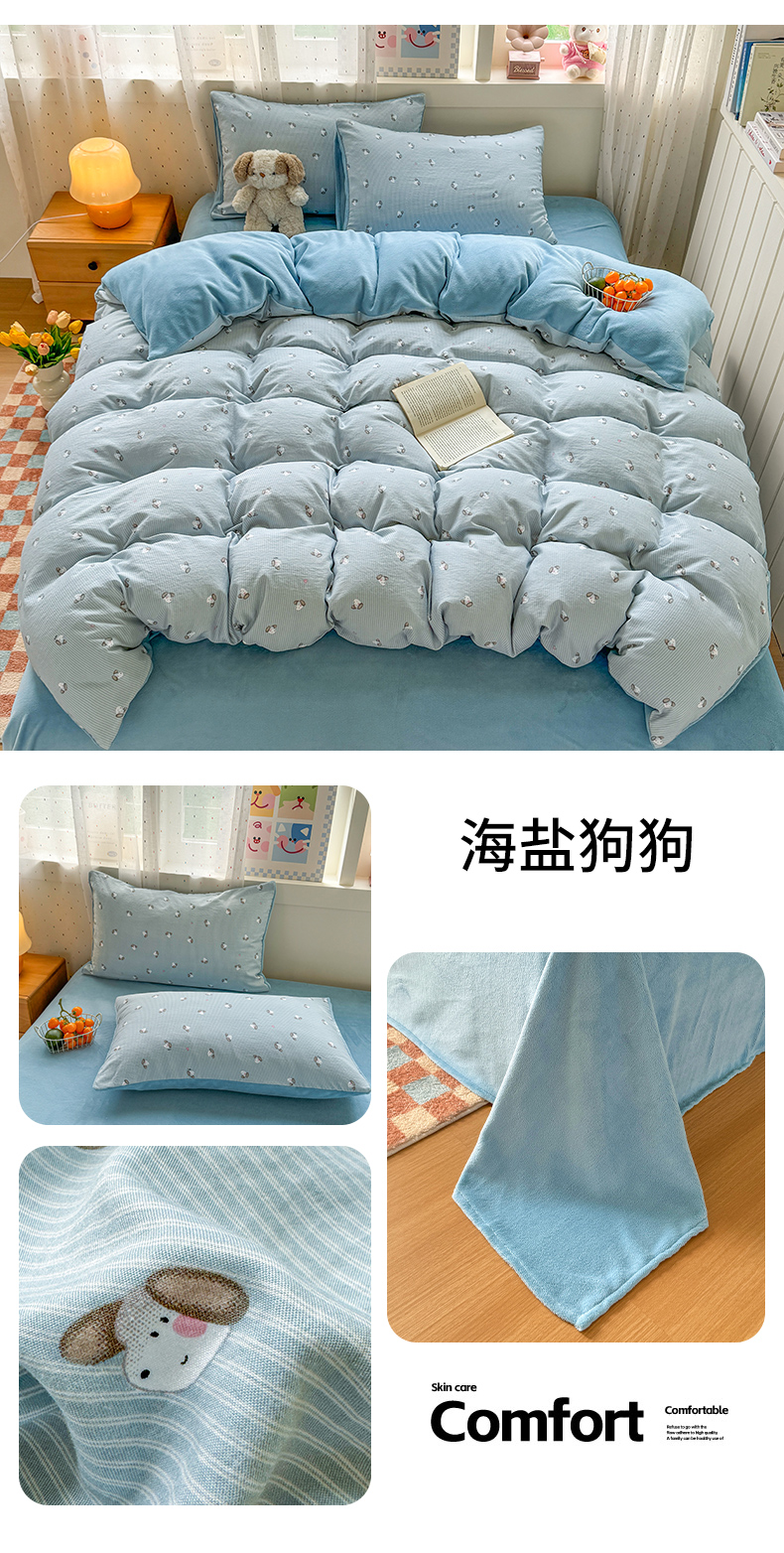 商品名称:十一家居 2025年新款A类云斜棉+牛奶绒春秋冬正反两用四件套—星漾系列 星漾-海盐狗狗