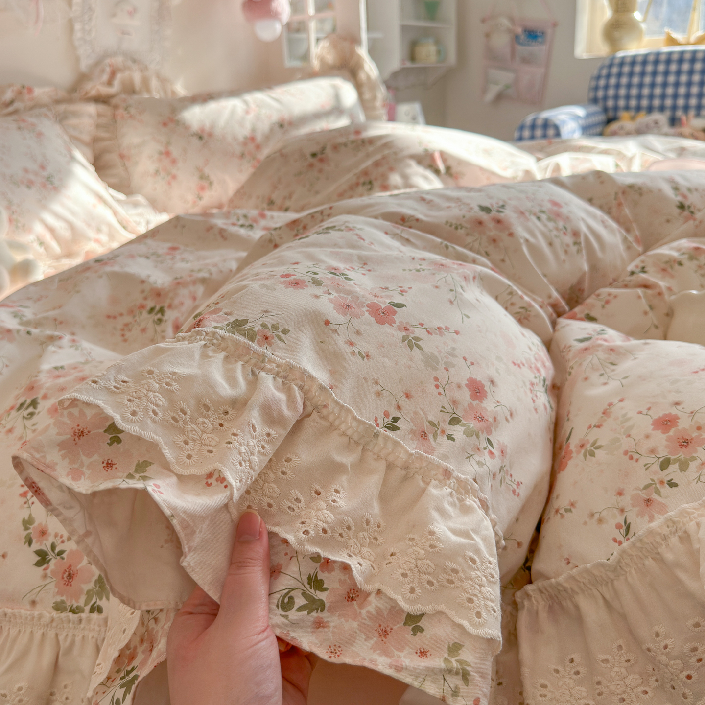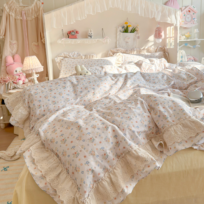 锦彩家居 2026新款全棉数码印花小碎花花边款三件套四件套INS小红书博主风(提供买家秀) 栀子花信