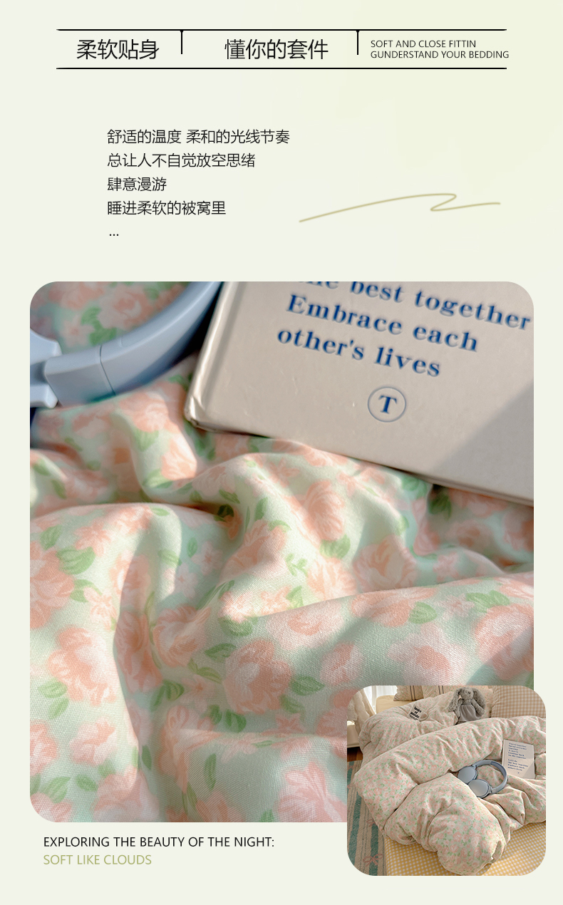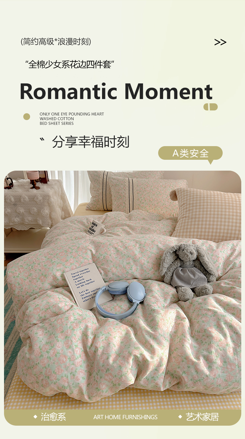 (总)三朵家纺 2026新款A类云柔水洗棉韩版法式花边云朵棉四件套,春夕集,罗逸维绿,如漫,惜花灰绿,赫拉
