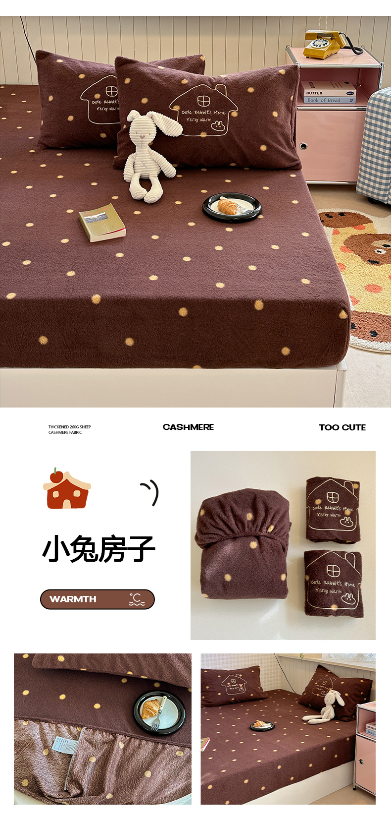 (总)暖生活 2026新款羊咩绒刺绣款床笠三件套,组合,小兔房子,电话机,面包袋,小饼干,小花瓶,小台灯