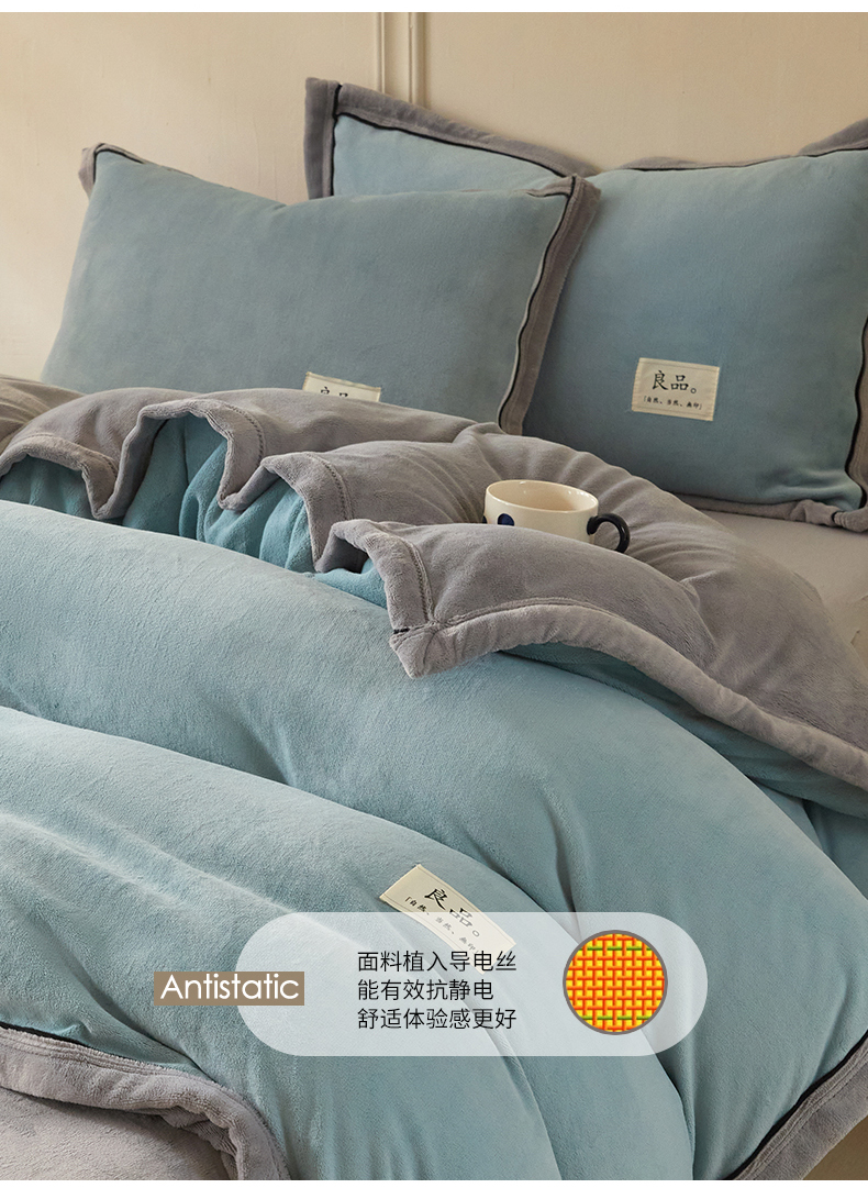 商品名称:慕木家纺 2025新款高克重简约无印风牛奶绒双拼四件套 宾利蓝+浅灰