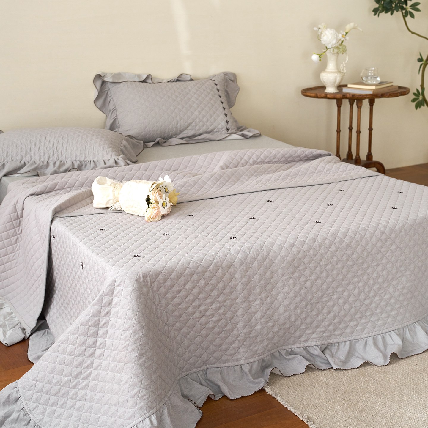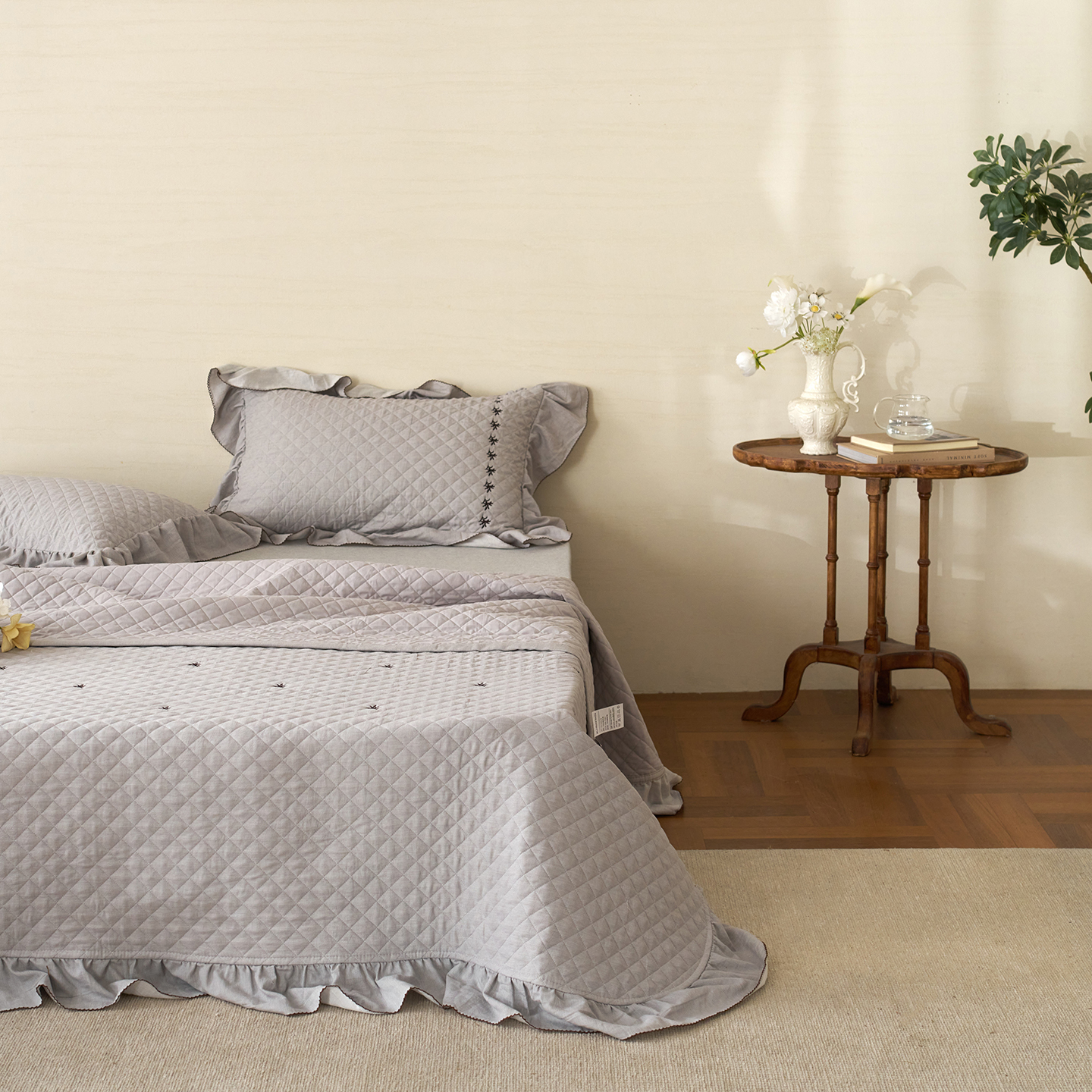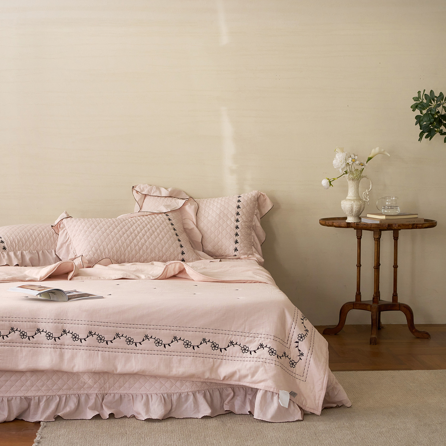 (总)上喜 2026新款棉麻小花刺绣款床盖多功能被子系列,麻本色,麻粉色