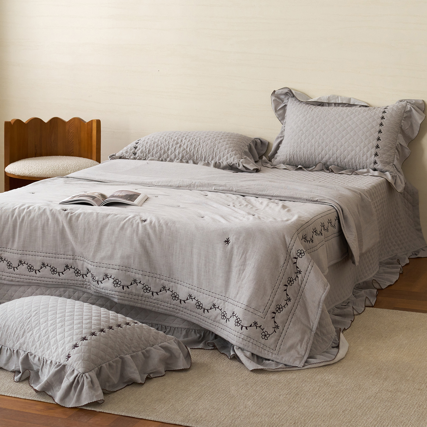 (总)上喜 2025新款全棉砂洗床盖新升级第五代,白色,湖蓝,奶油米,深灰,深咖
