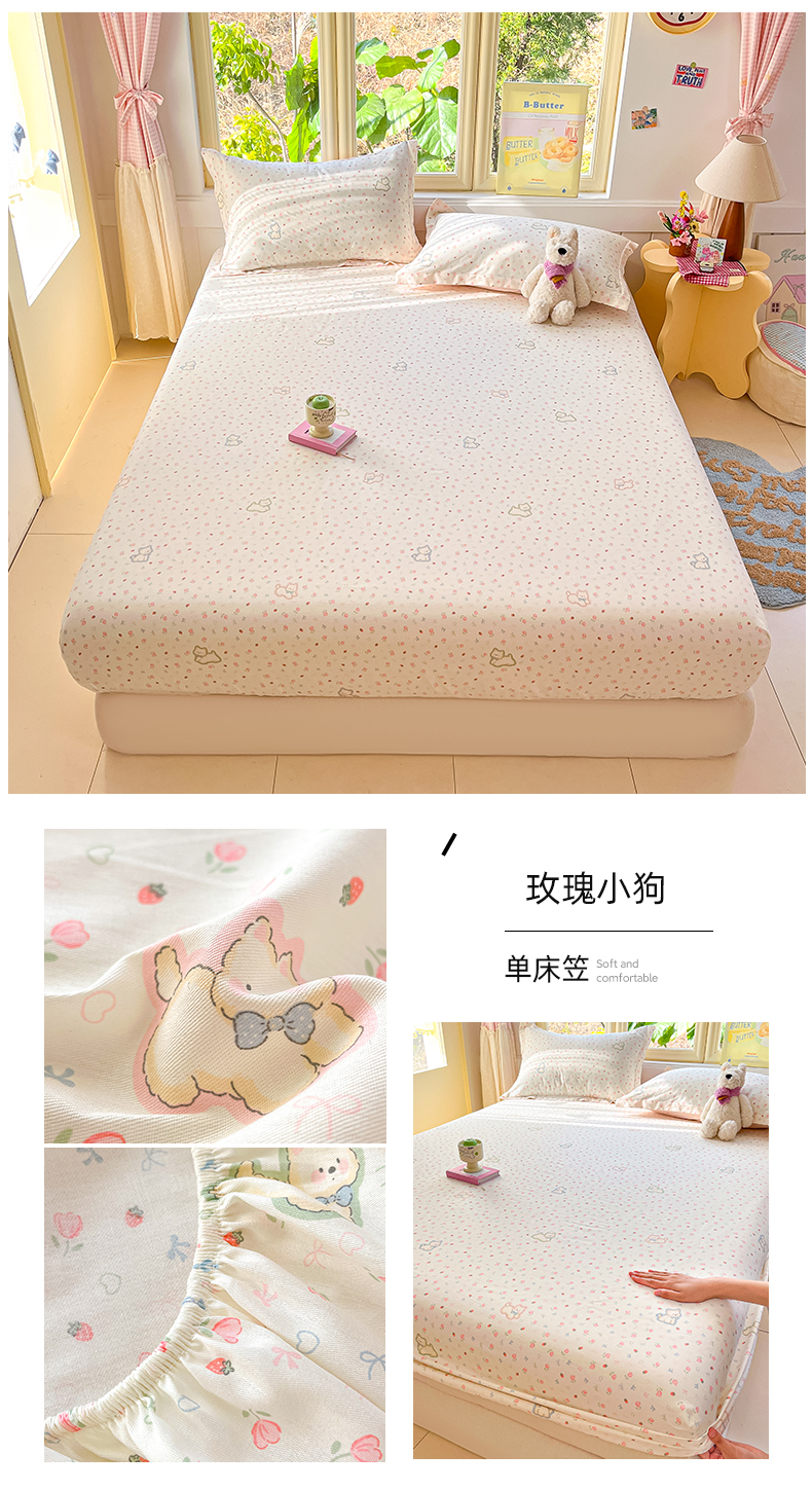 莱通家纺 2026春夏新款全棉12868印花四件套单品系列-单床笠 玫瑰小狗