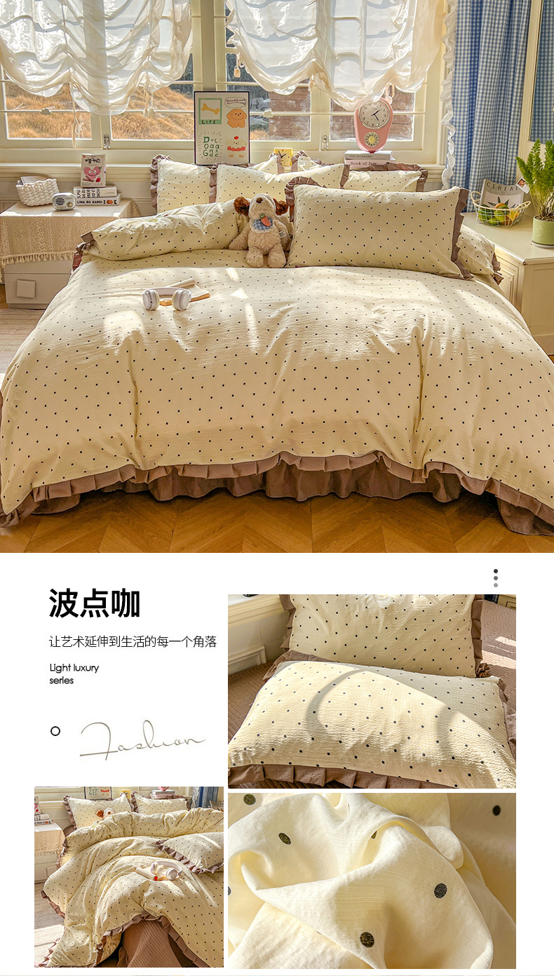 (总)美梦家纺 2025新款亲肤舒适全棉13372床盖款四件套,波点-咖,蝴蝶结-咖