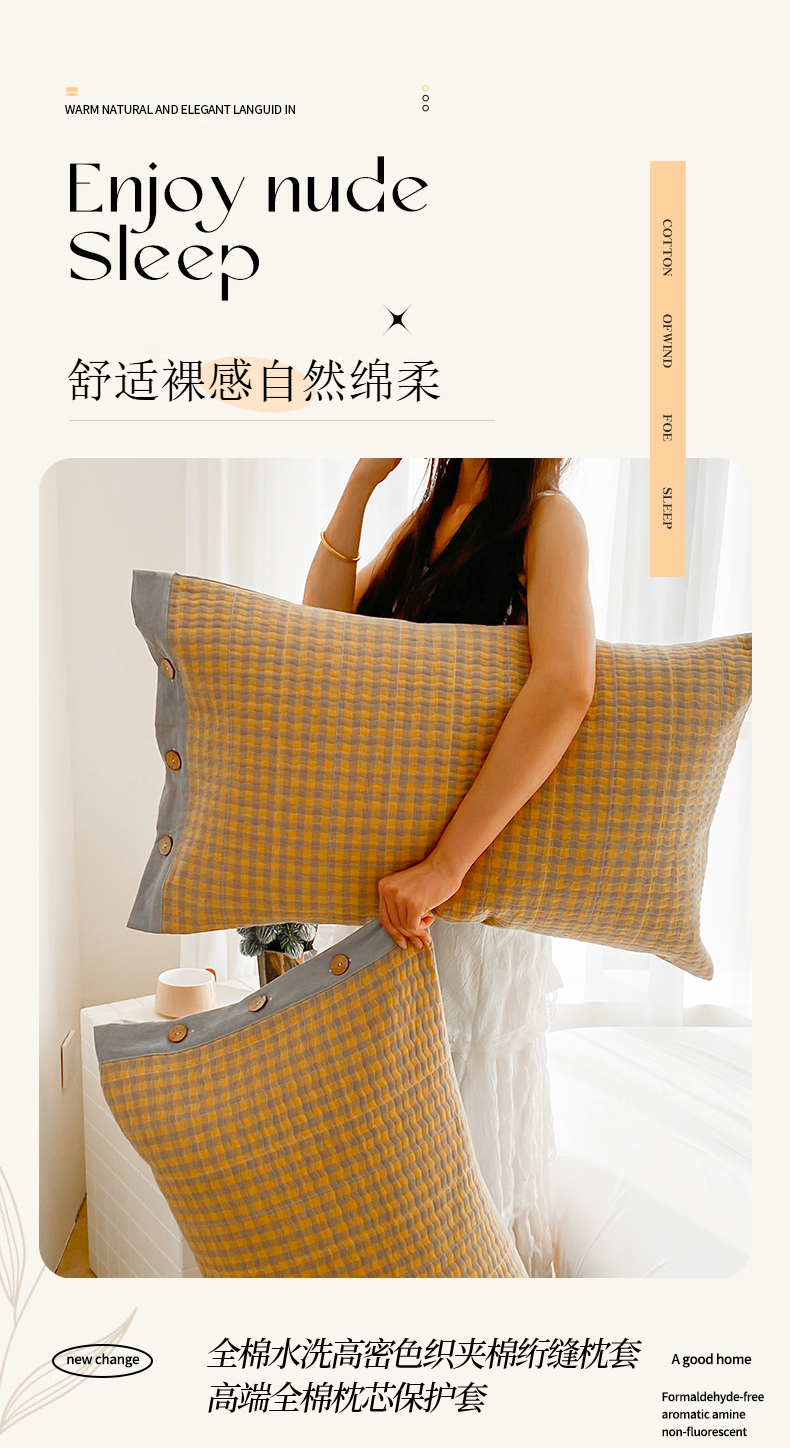 (总)美宜家 2026新款全棉水洗高密色织夹棉纺缝枕套高端全棉枕芯保护套