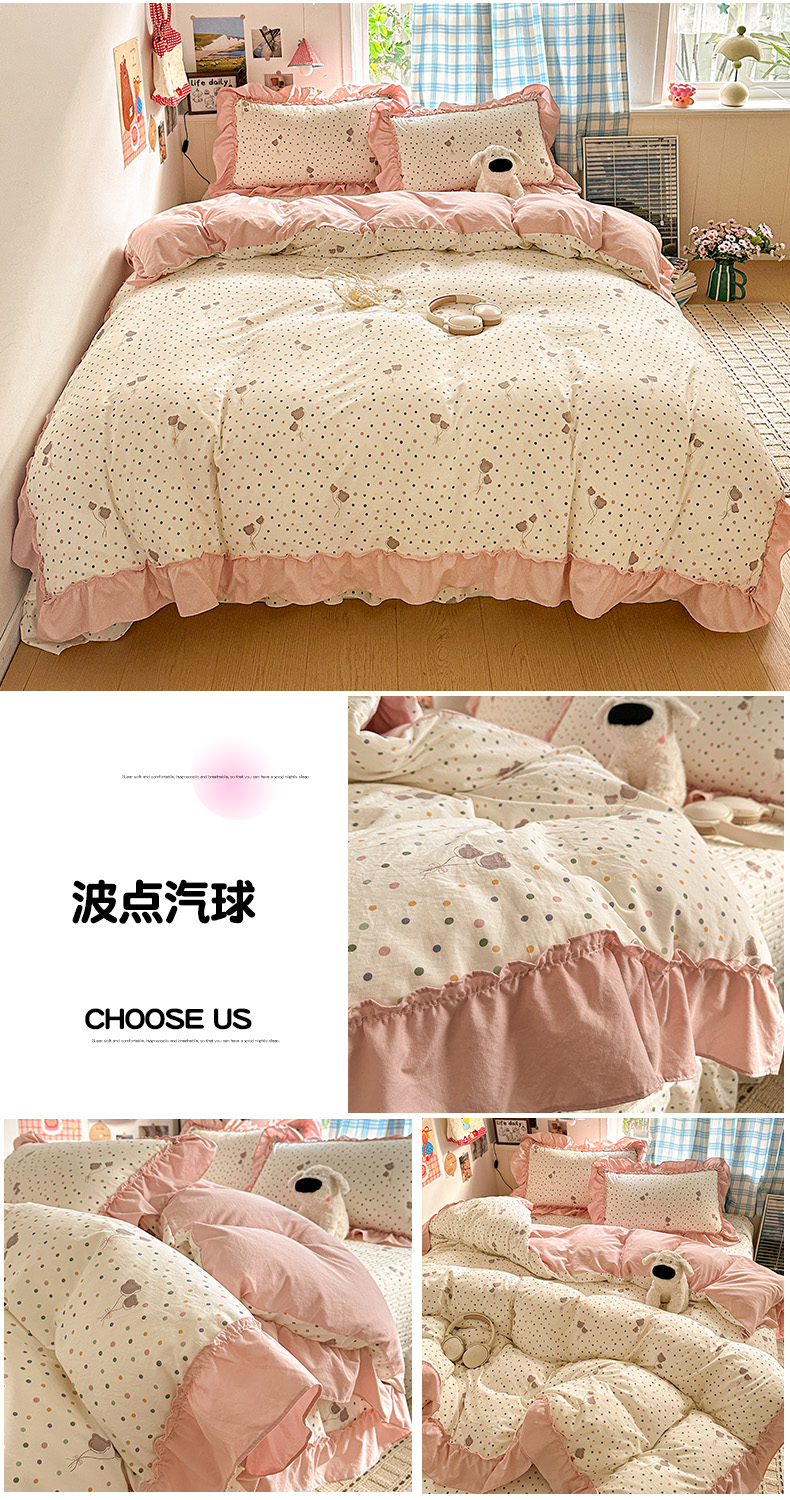 当前位置: 91家纺网 > 商品网购 > 床品套件 > 四件套 > 其它四件套 > 富米莱(原臻工厂) 2026春夏新款仿棉A类韩系大花边床盖床裙四件套 波点汽球