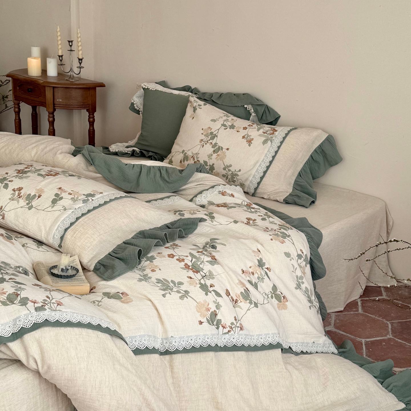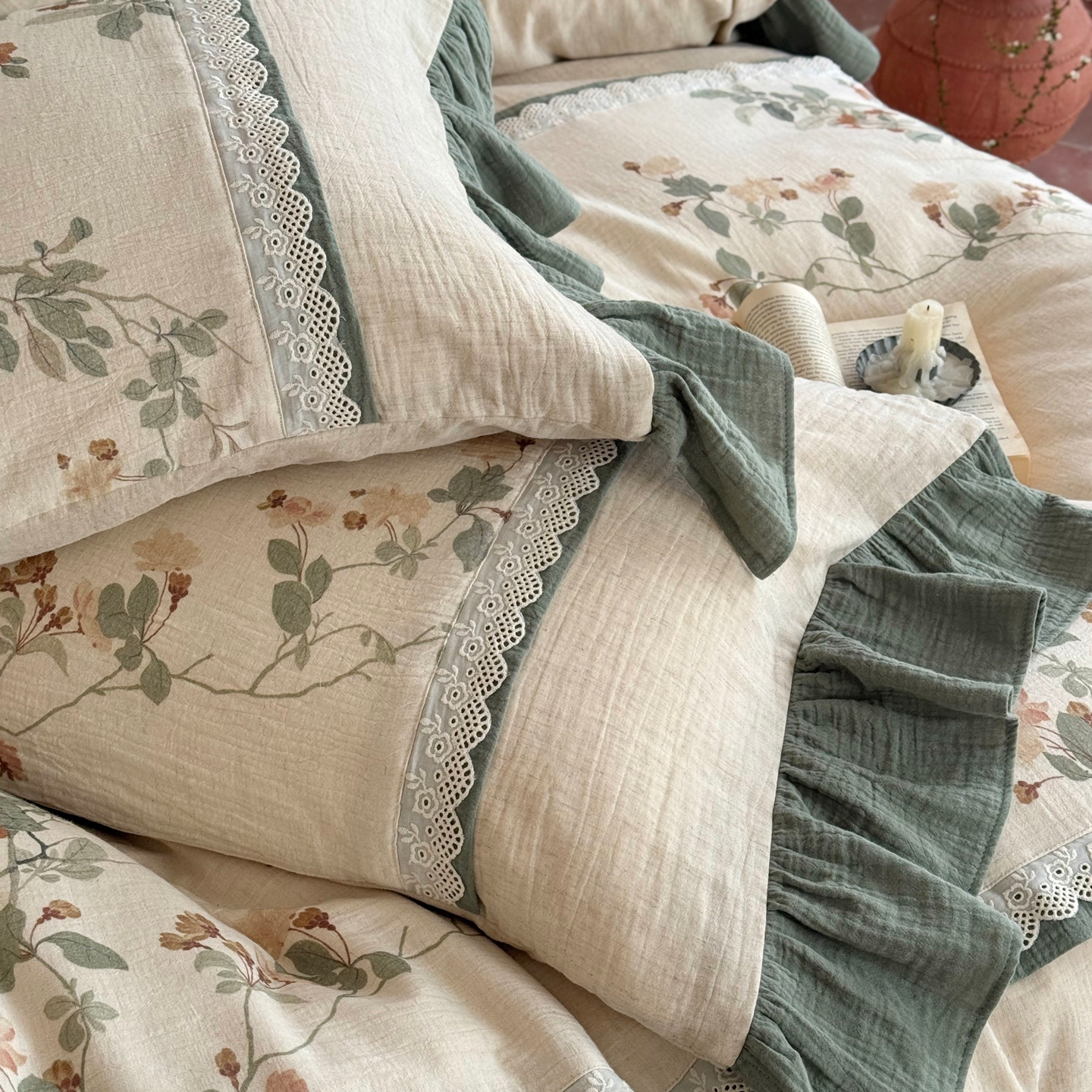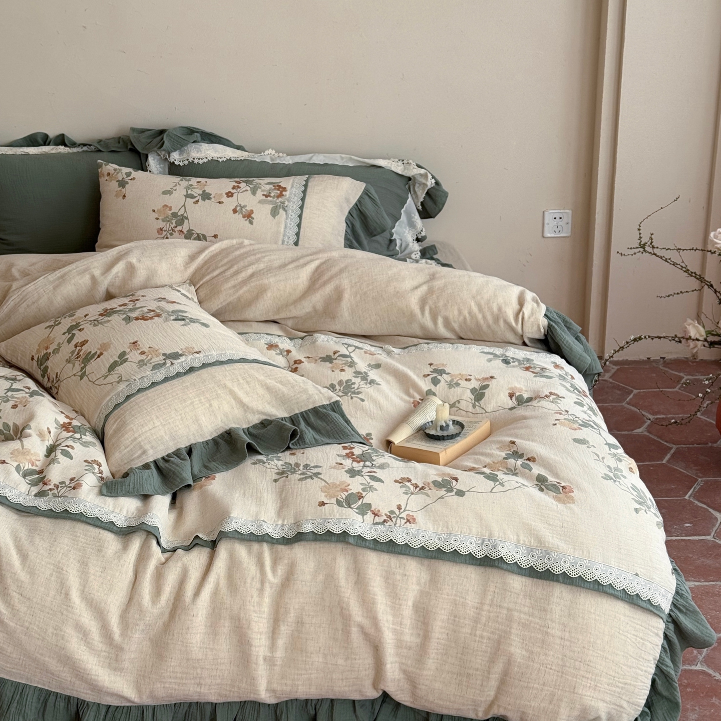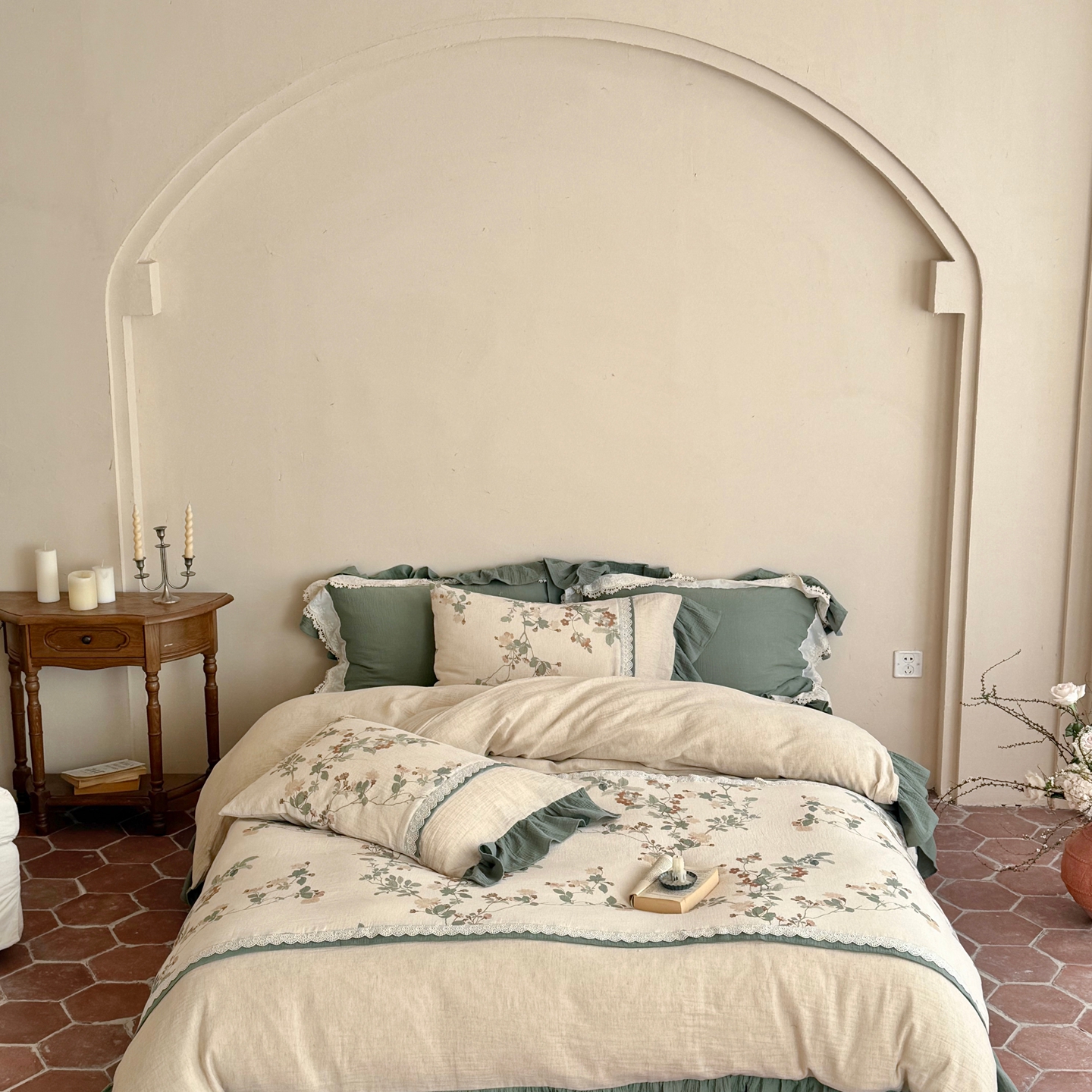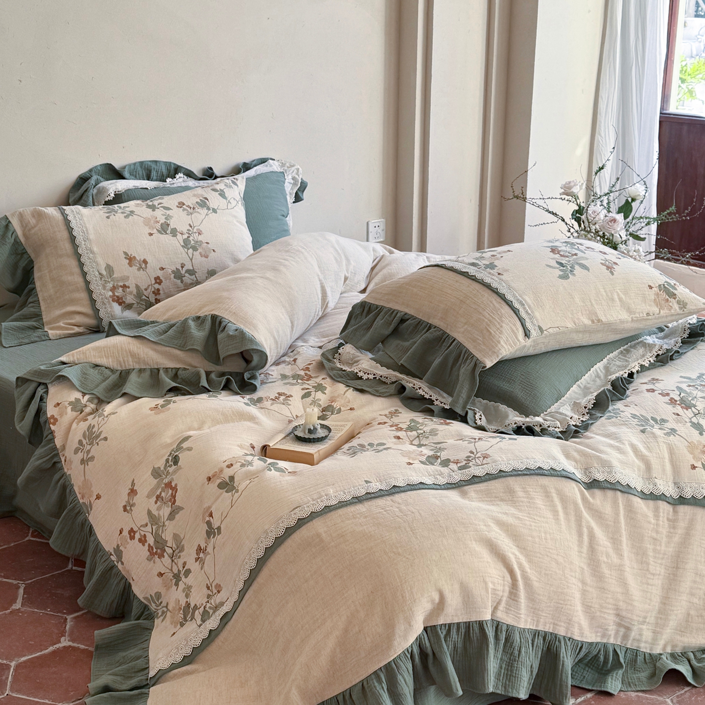 佳汐蓝家纺 2026春夏新款棉麻皱皱双层纱四件套-栀子茉莉 控价:卷后不低于398 栀子茉莉-绿色床单