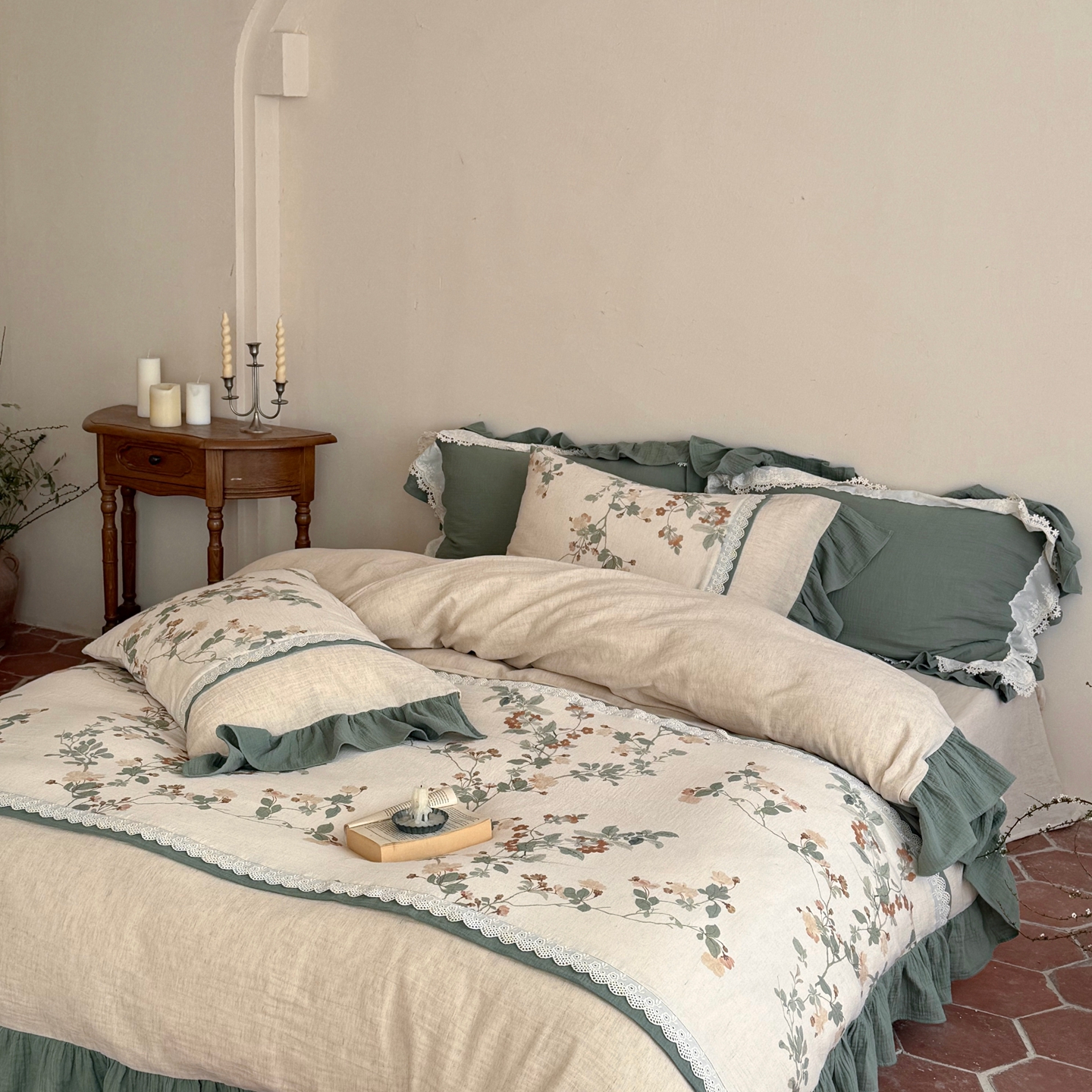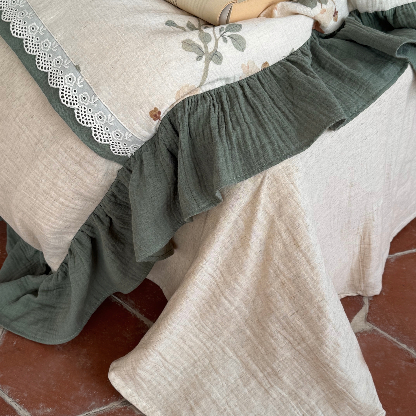 (总)佳汐蓝家纺 2026春夏新款棉麻皱皱双层纱四件套-栀子茉莉 控价:卷后不低于398,栀子茉莉-绿色床单,栀子茉莉-麻色床单