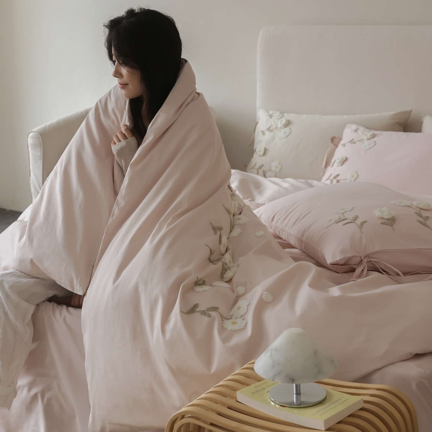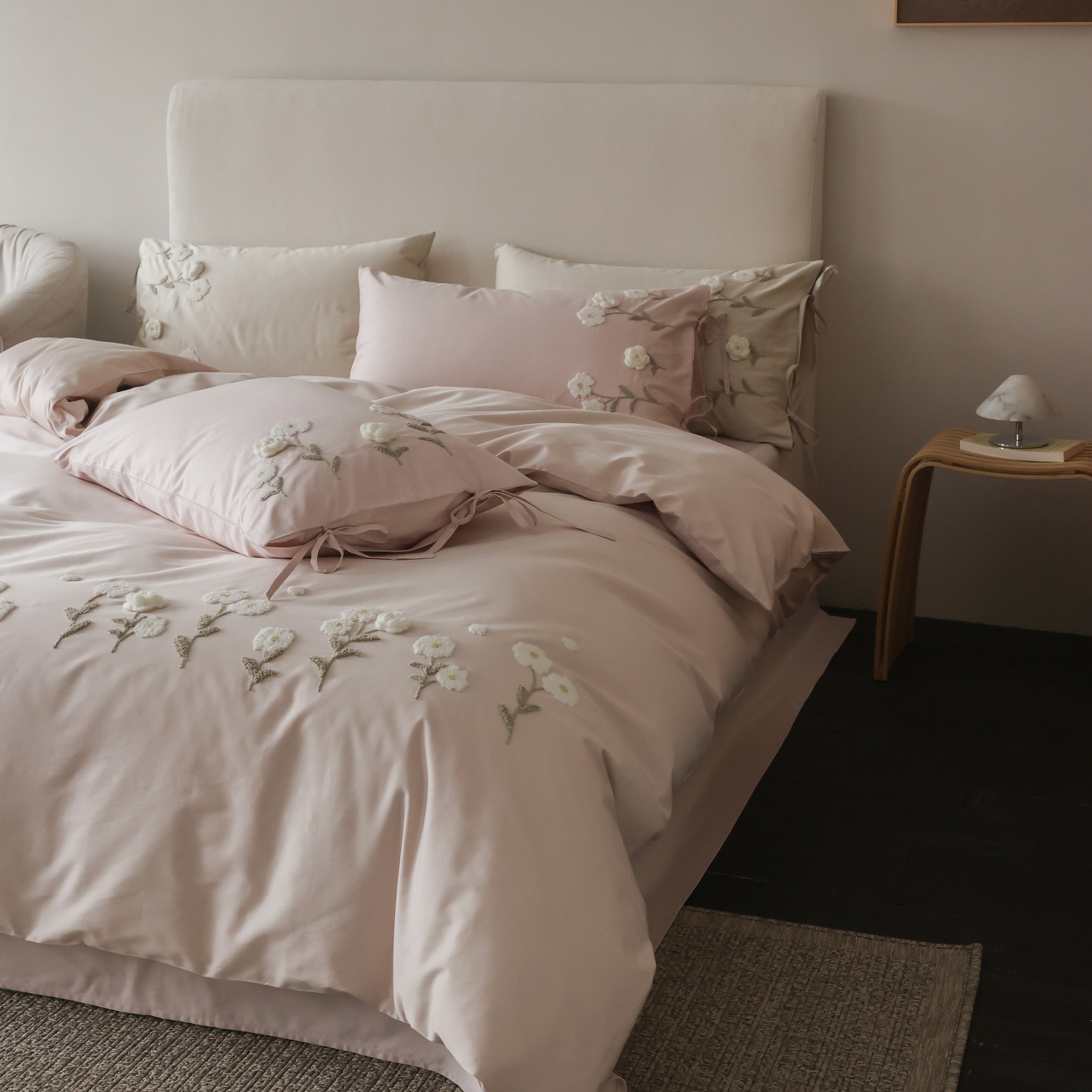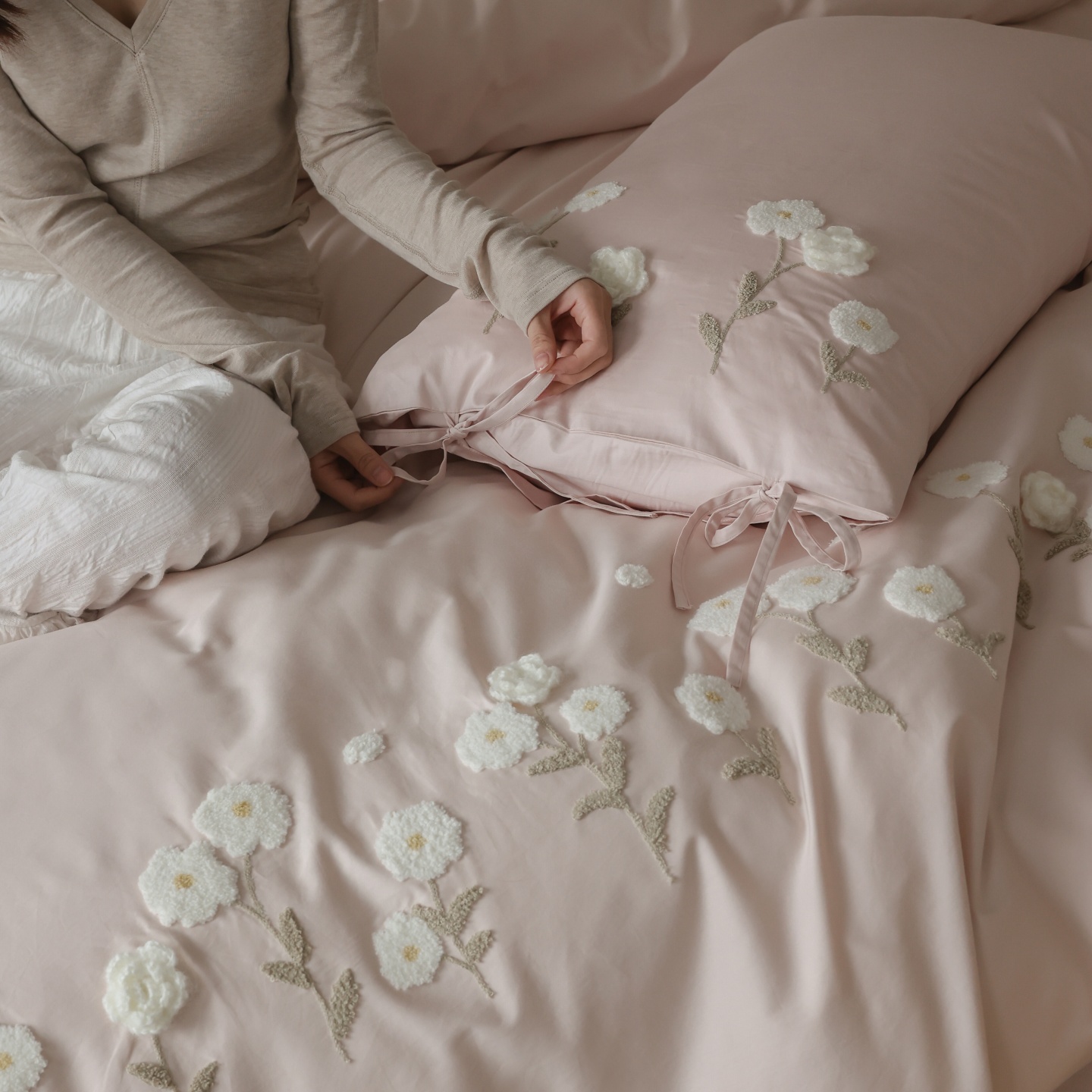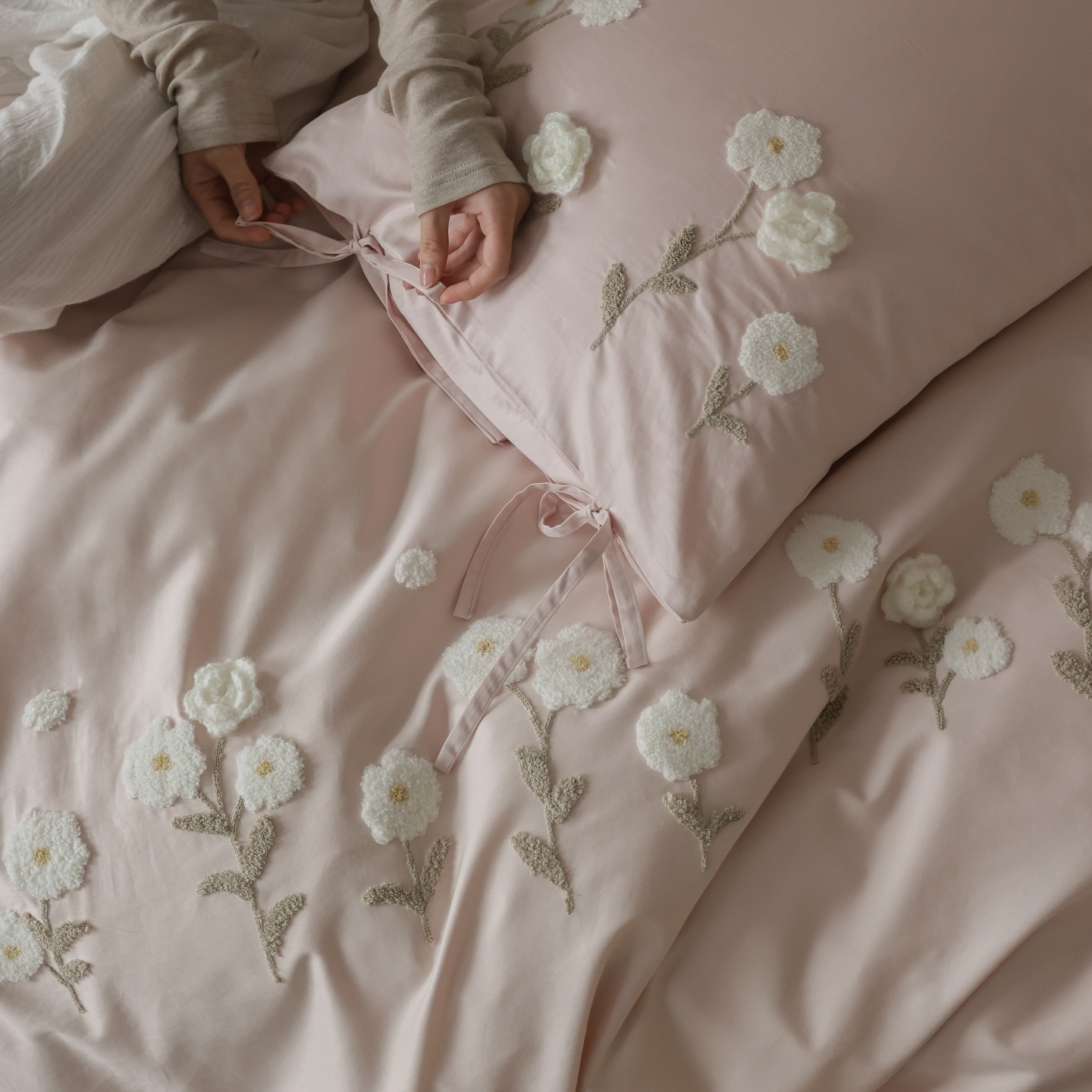 (总)初拾 2026新款贡缎全棉打褶“miu感”绣花四件套-欢乐颂(会员减20,控价 日常券后不低于368元),欢乐颂-钢琴白,欢乐颂-浅樱紫,欢乐颂-山茶粉,欢乐颂-星夜灰