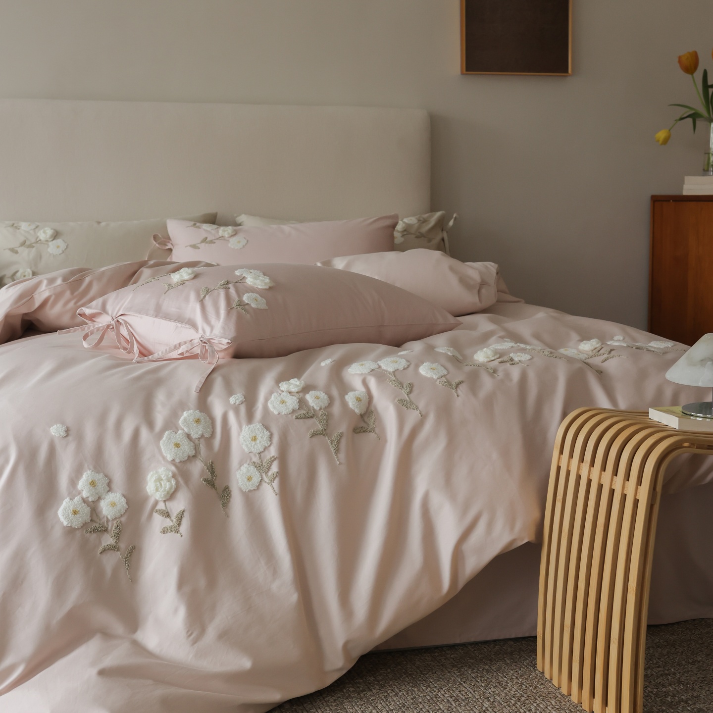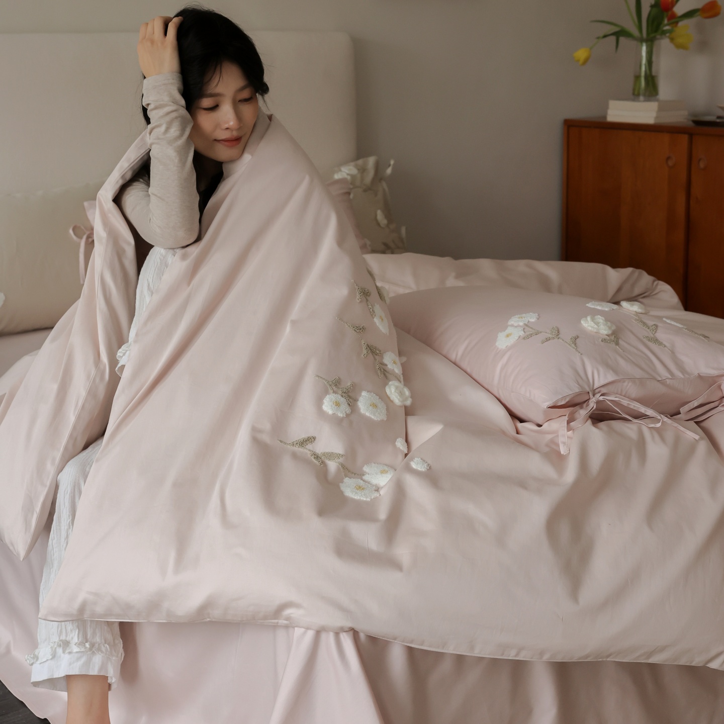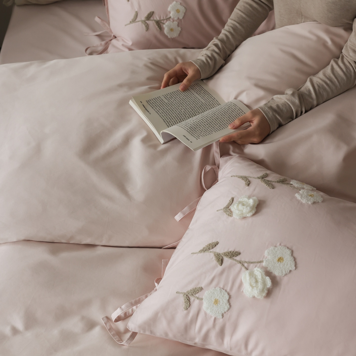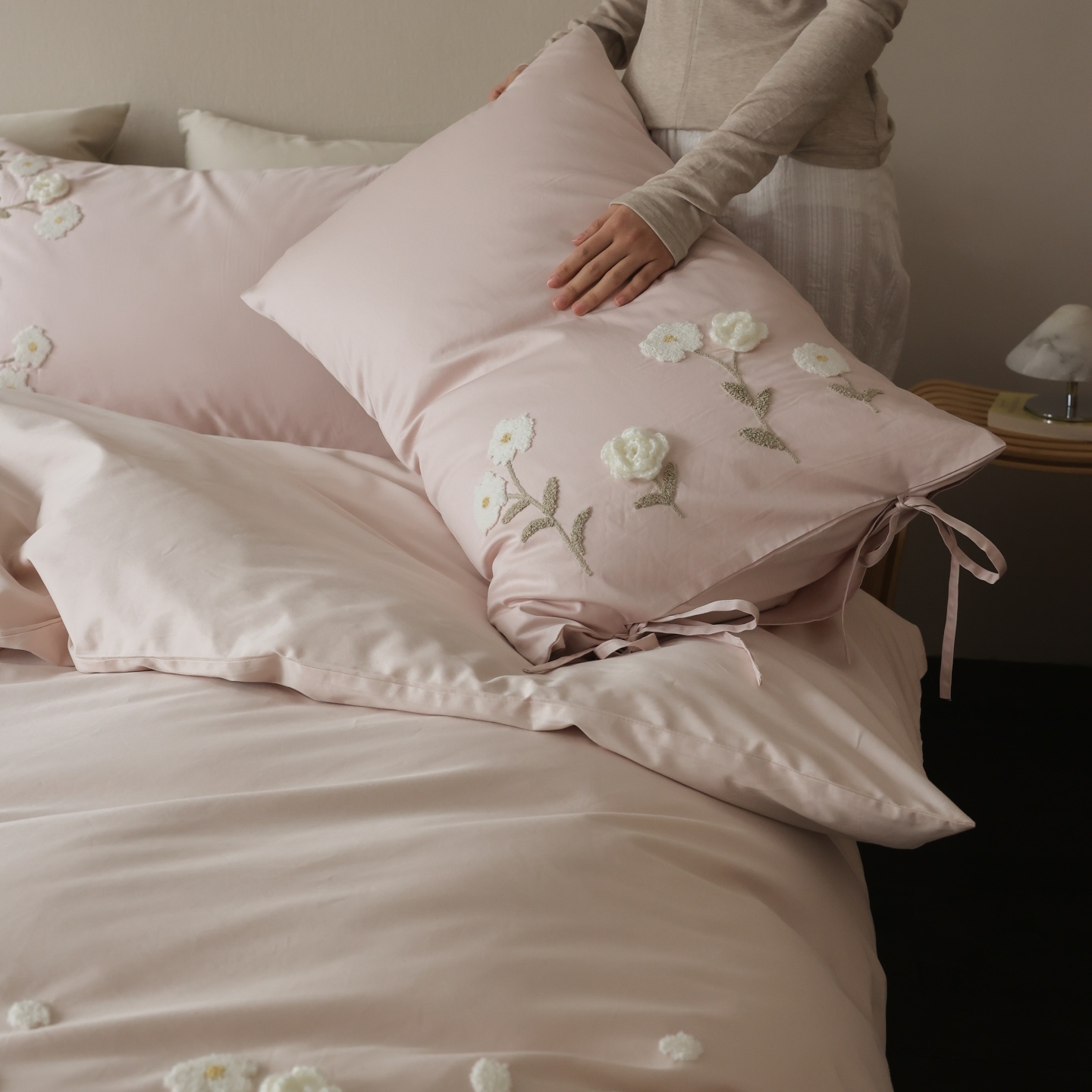 (总)初拾 2026新款贡缎全棉打褶“miu感”绣花四件套-欢乐颂(会员减20,控价 日常券后不低于368元),欢乐颂-钢琴白,欢乐颂-浅樱紫,欢乐颂-山茶粉,欢乐颂-星夜灰