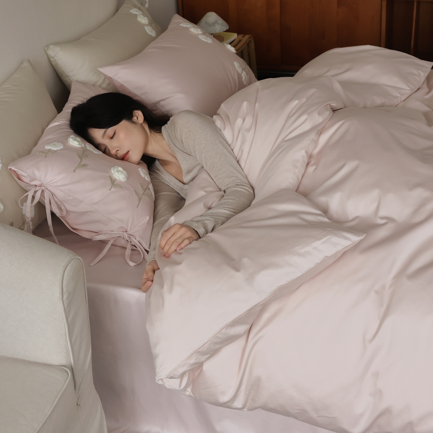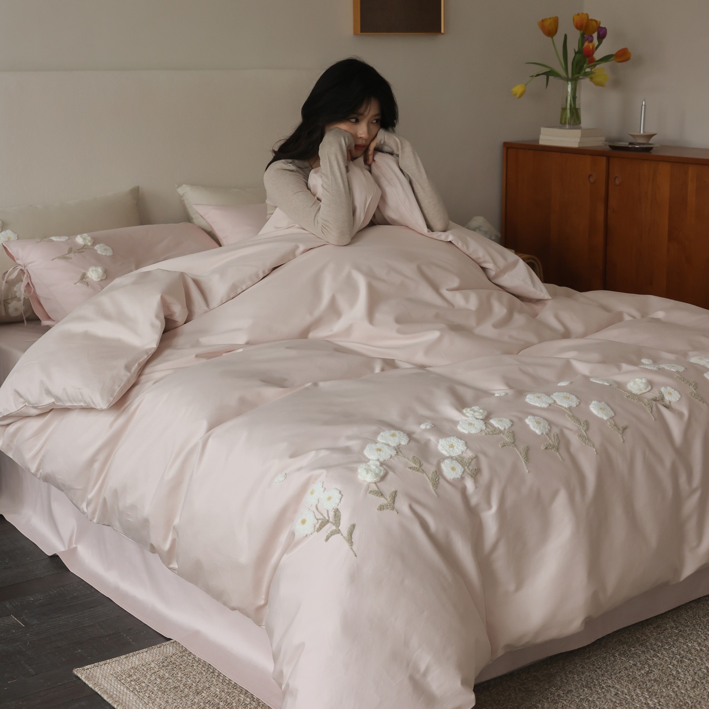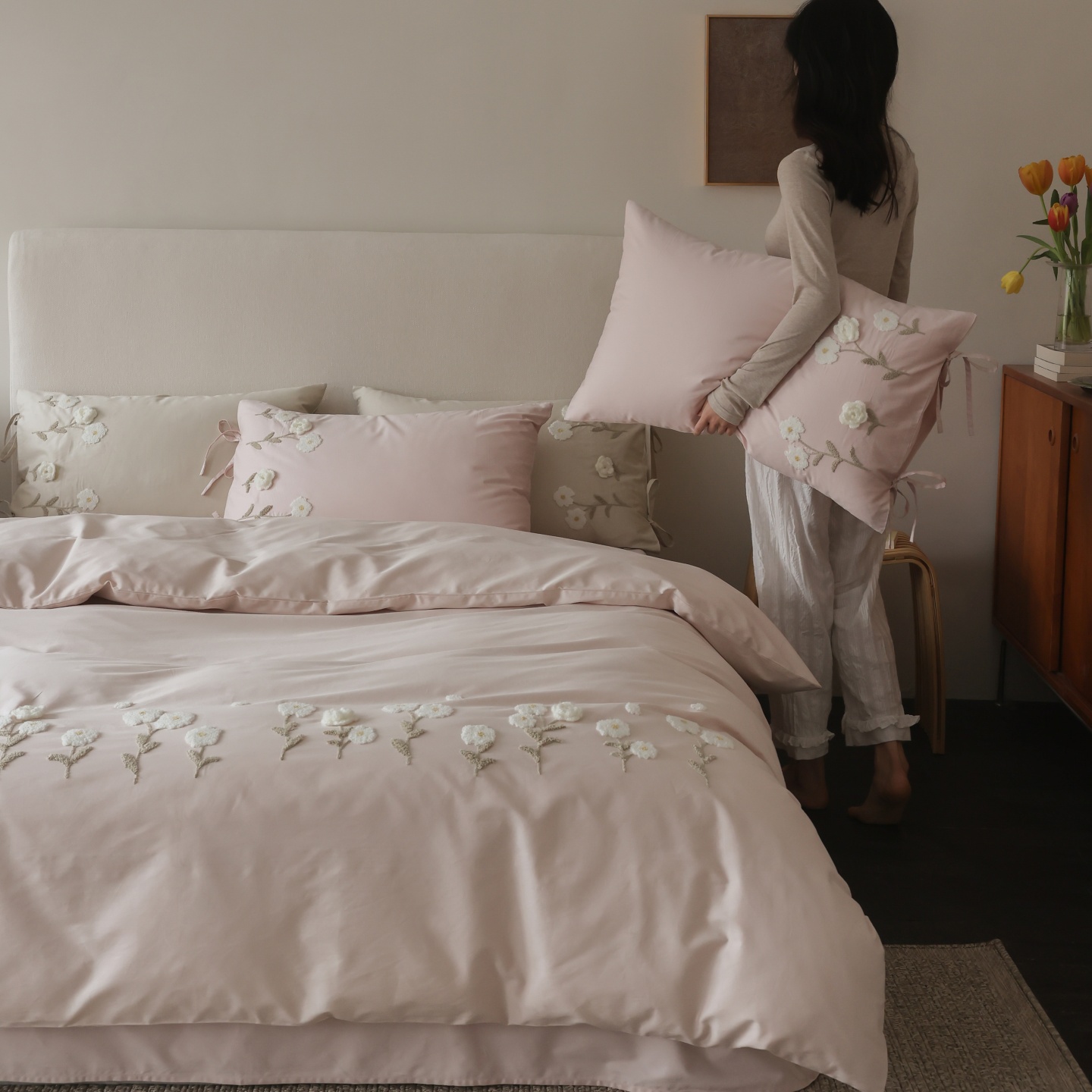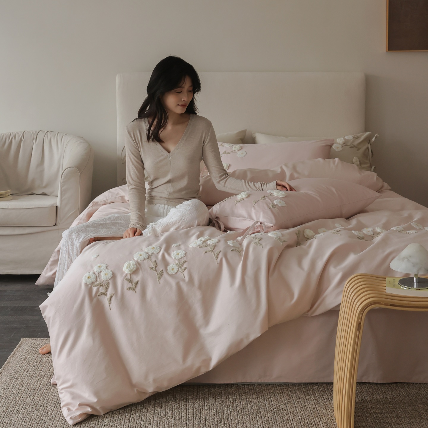 (总)初拾 2026新款贡缎全棉打褶“miu感”绣花四件套-欢乐颂(会员减20,控价 日常券后不低于368元),欢乐颂-钢琴白,欢乐颂-浅樱紫,欢乐颂-山茶粉,欢乐颂-星夜灰