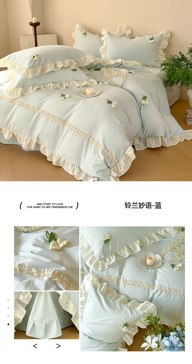 商品名称:庭笙 2026新款古法水洗棉感法式立体花韩版花边四件套-铃兰妙语 铃兰妙语-蓝