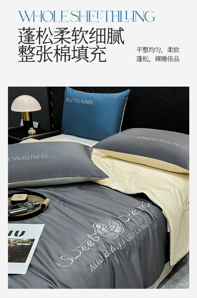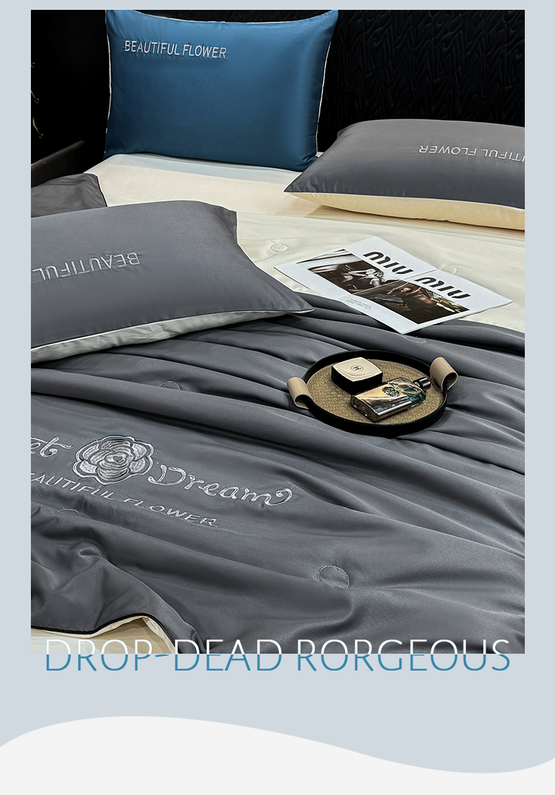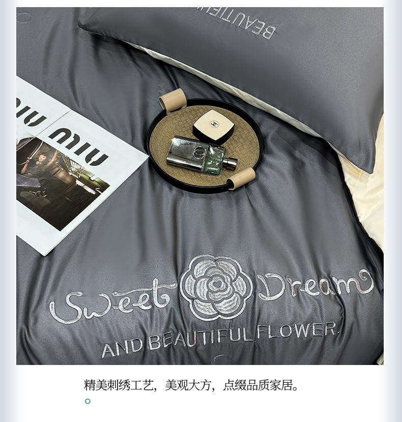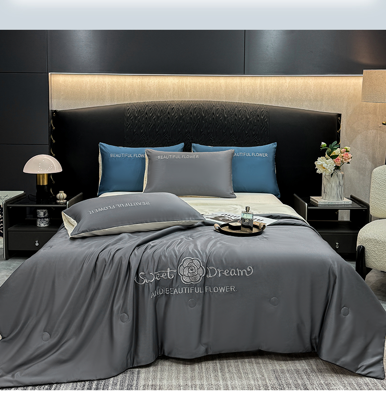 当前位置: 91家纺网 > 商品网购 > 被子 > 夏被 > 欢乐季 2026新款A类水洗冰丝山茶花刺绣夏被夏凉被空调被四件套 高级灰+奶茶