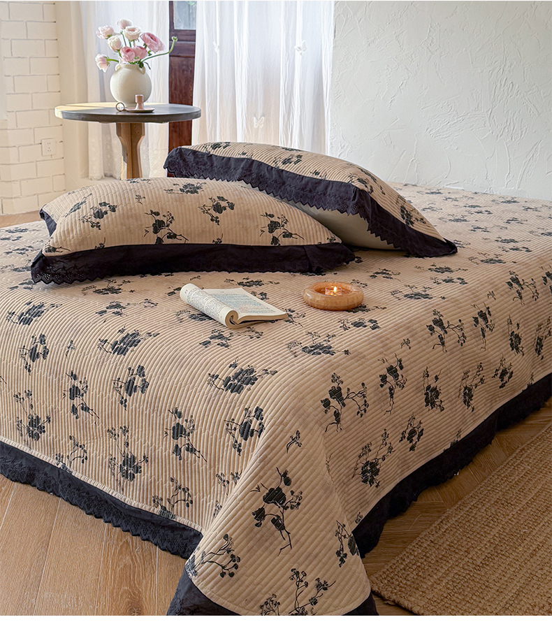 桃子家居 2026新款韩版纯棉花边法式花卉碎花水洗原生态纯棉棉麻多功能床盖三件套 棉麻床盖-拾穗咖
