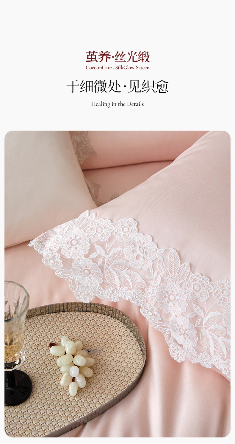 商品名称:金奇达家纺 2026新款茧养丝光缎四件套-蕾丝小姐【标准号全网控价(折后券后)不低于299元 会员-40元】 蕾丝小姐-烟霞