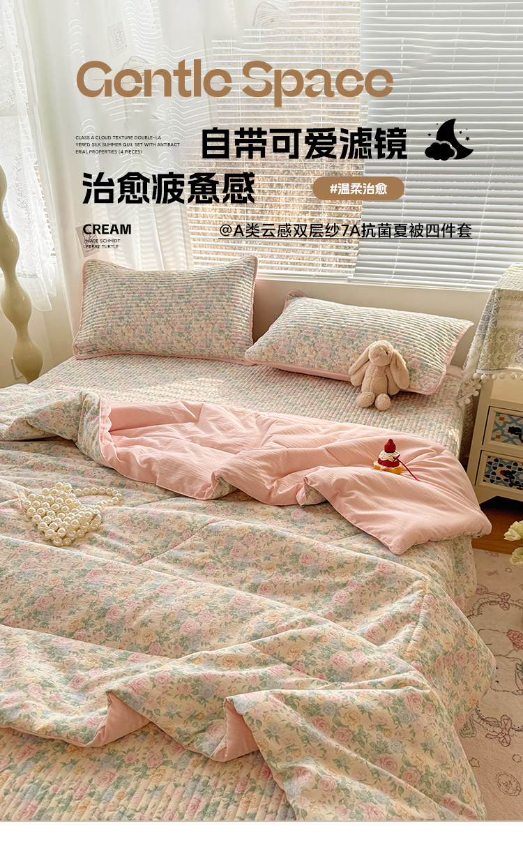 当前位置: 91家纺网 > 商品网购 > 床品套件 > 四件套 > 夏被四件套 > 玉海棠家纺 2026新款A类云感双层纱7A抗菌夏被夏凉被空调被四件套 蓝屿花室
