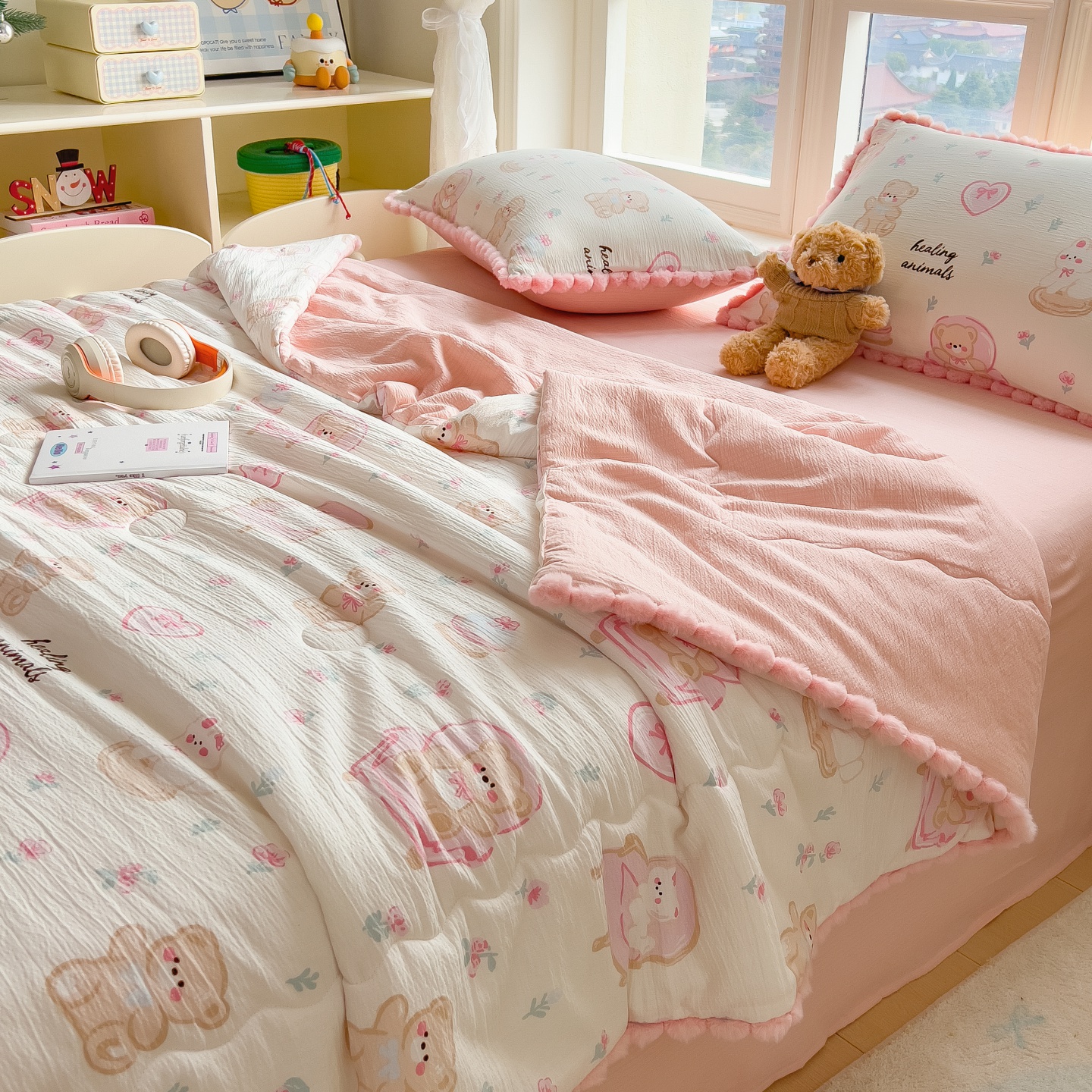 • 91家纺网 家纺一手货源 找家纺 (总)梵克保罗 2026春夏新款10A抗菌毛球花边皱皱纱夏被单夏被空调被夏被四件套,花乡小熊,蓝星狗,乐趣,萌兔花园,沐春,素锦纹,雾格马