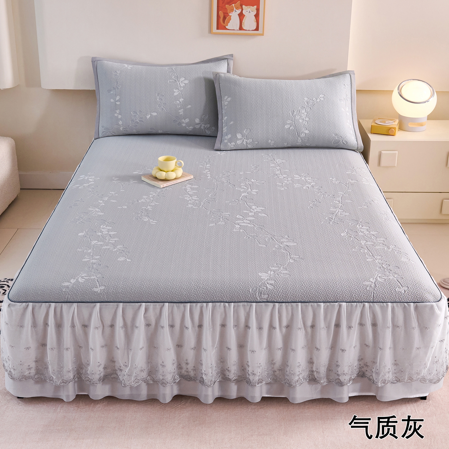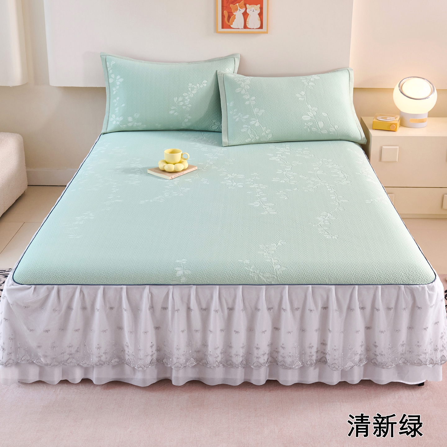 (总)梵克保罗 2026春夏新款高分子复合凉感提花蕾丝双层床裙款凉席三件套花语系列,床裙花语-粉,床裙花语-灰,床裙花语-蓝,床裙花语-绿
