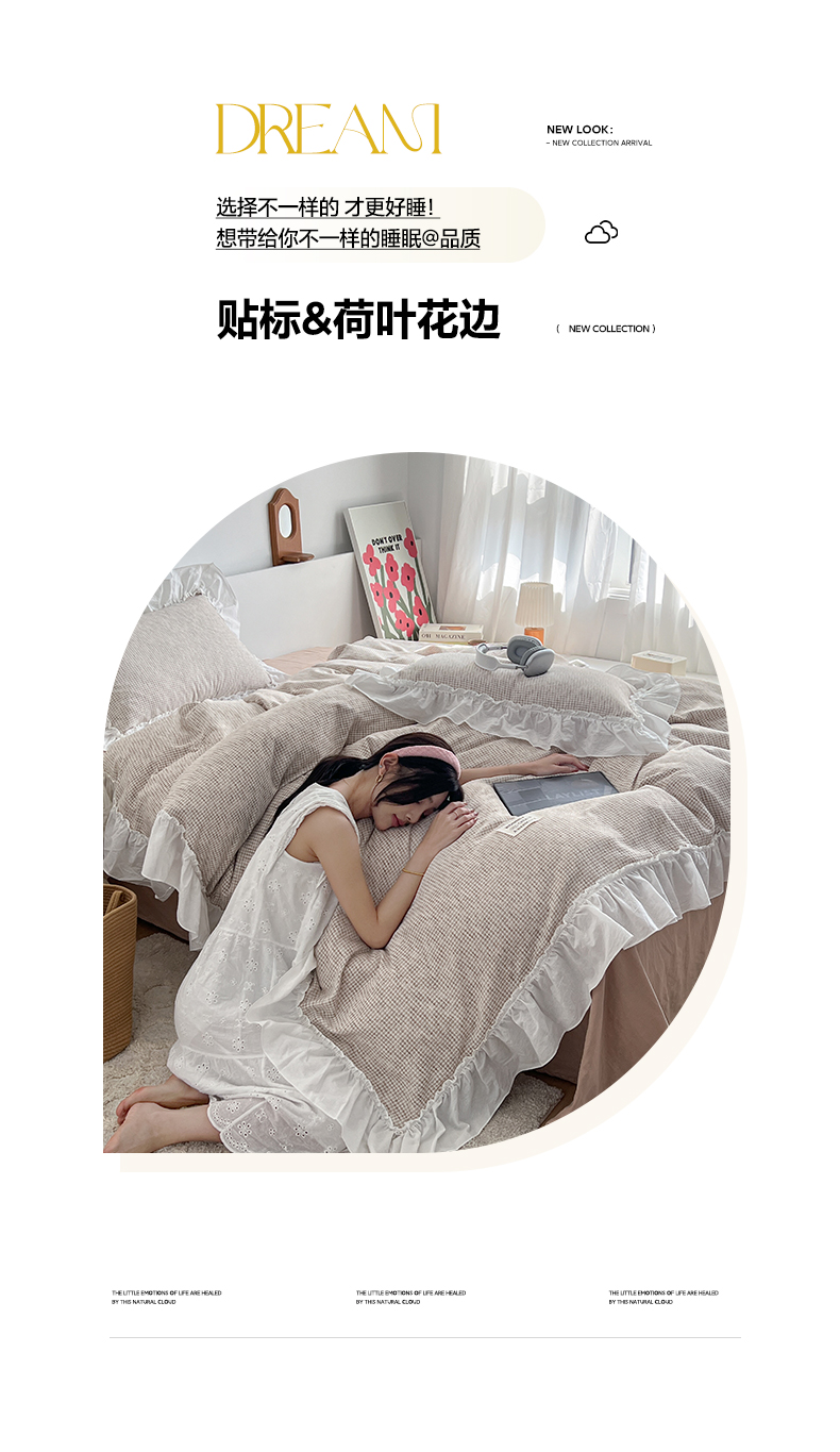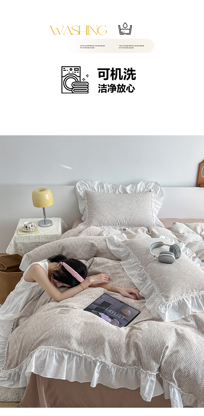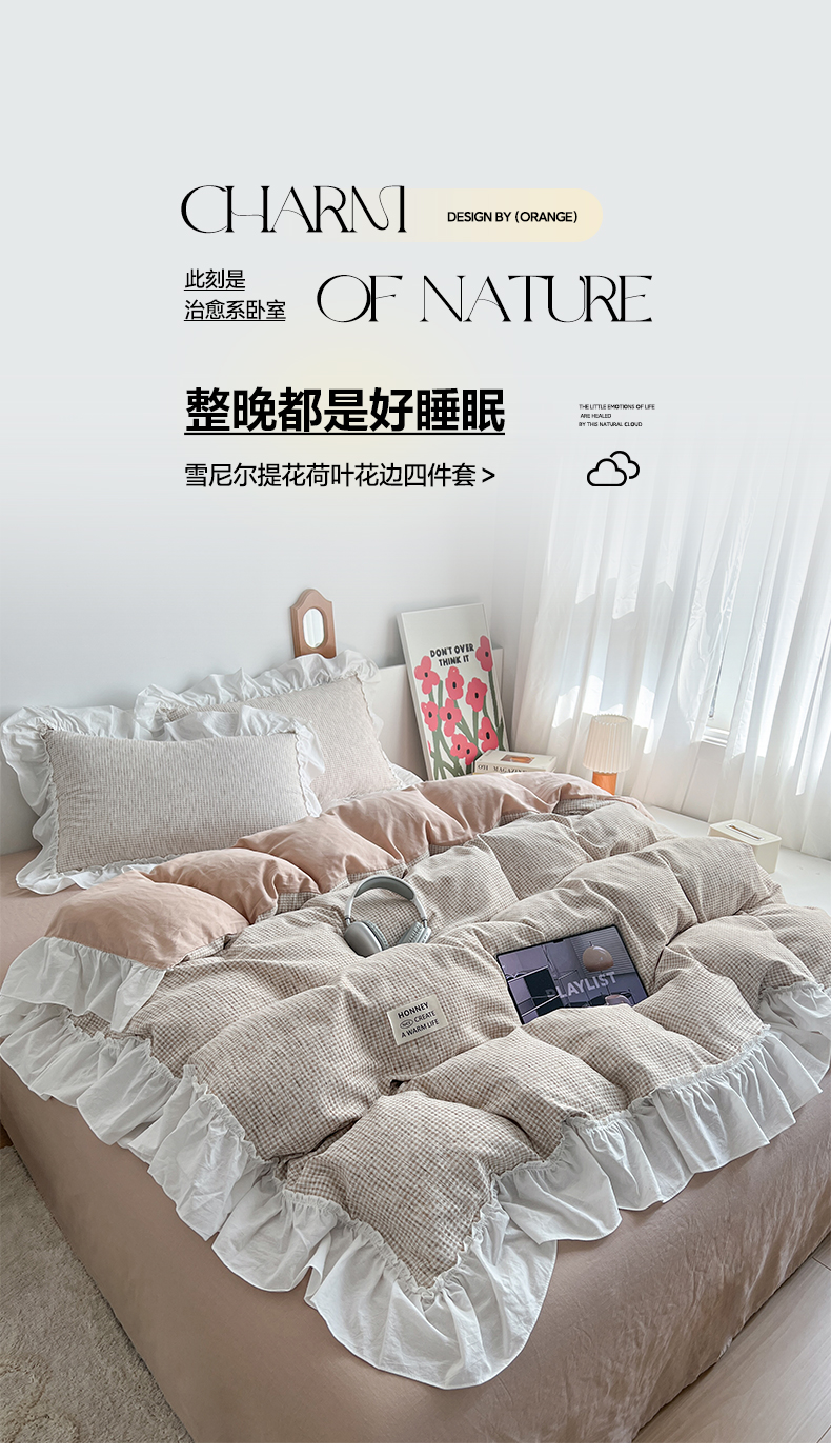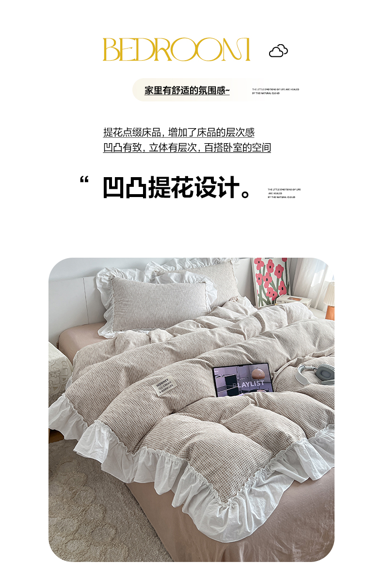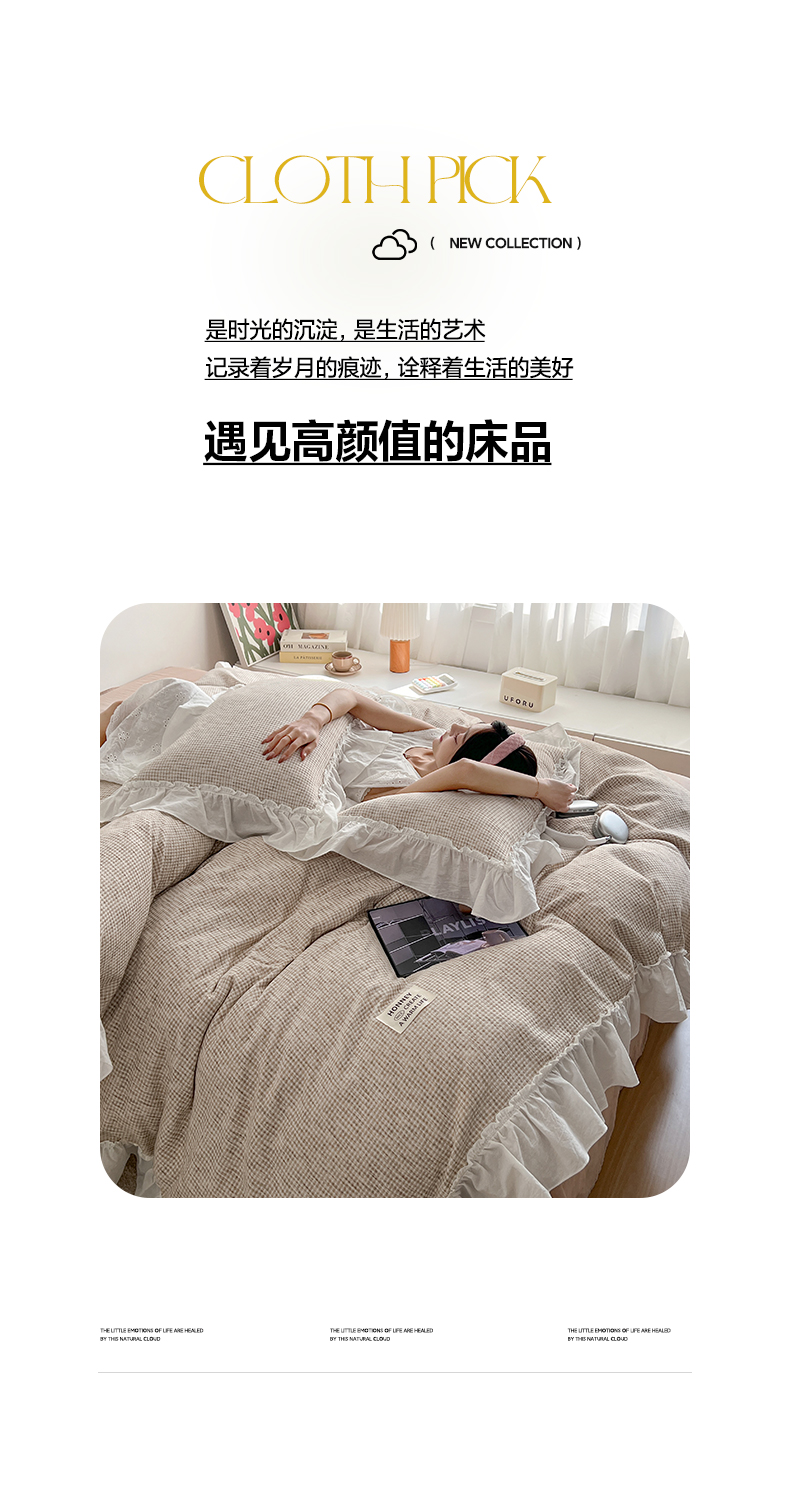 当前位置: 91家纺网 > 商品网购 > 床品套件 > 四件套 > 其它四件套 > 晨曦家纺 2026新款荷叶花边雪尼尔提花四件套可水洗棉四件套少女风 奶茶华夫