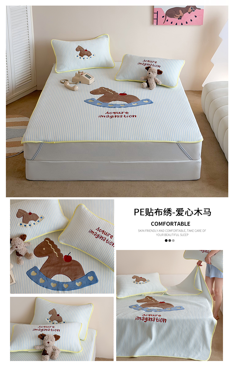 (总)桃子家居 2026新款A类PE凉感卡通贴布绣高端工艺空调软席床席床笠凉席三件套,组合图,PE贴布绣-爱心木马,PE贴布绣-番茄仙女兔,PE贴布绣-酷酷猫,PE贴布绣-苹果小狗,PE贴布绣-清新熊