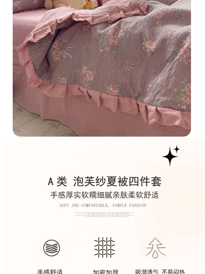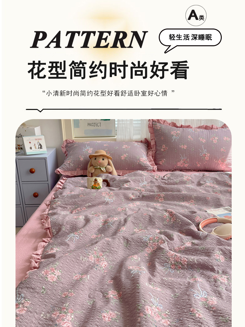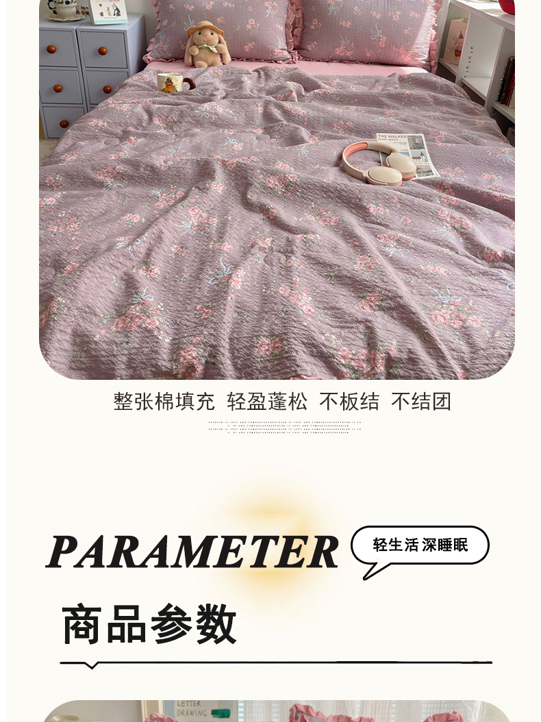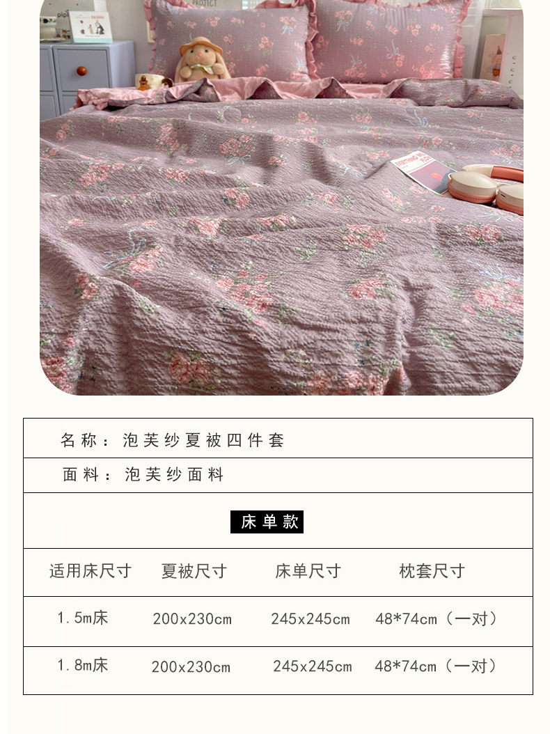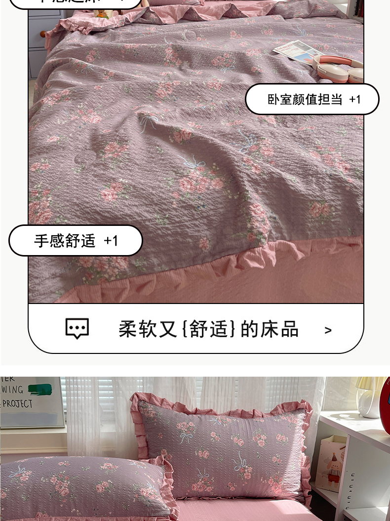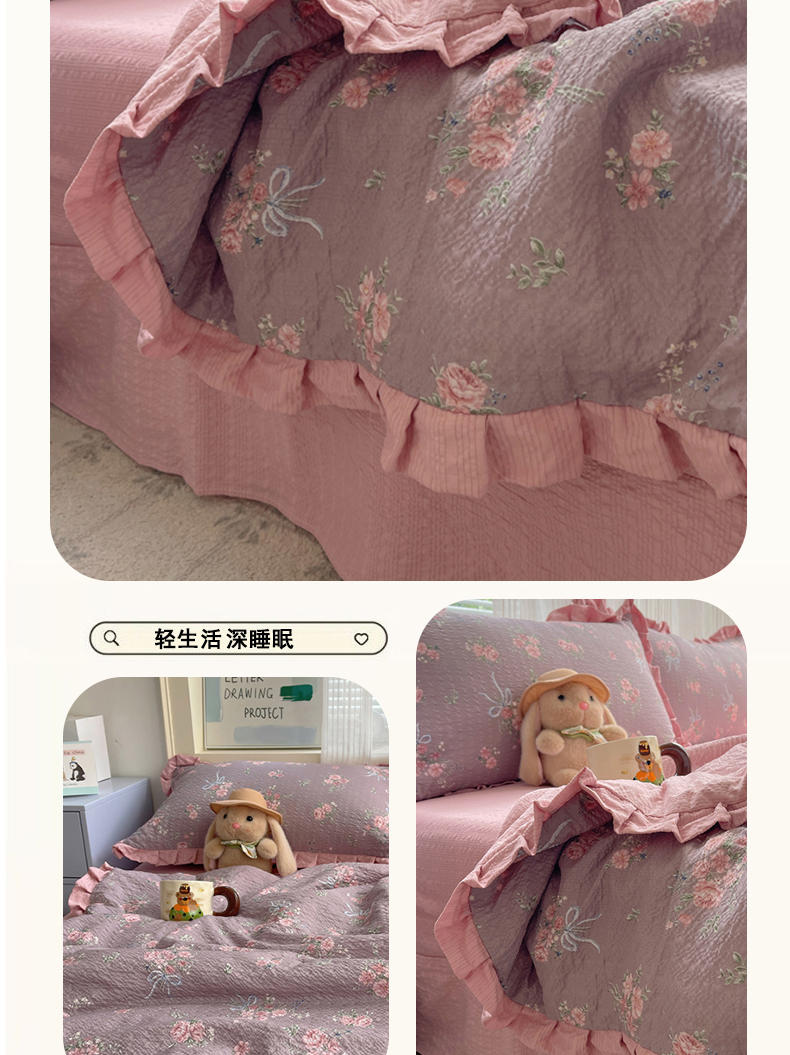 (总)迪梦姿家纺 2026新款高克重泡芙纱泡泡纱床盖款四件套系列,紫雾花蝶集,灰樱桃,春日甜桃心米,纯宅熊,猫咪集粉,躲猫猫,花野兔眠,旧街星星,莓系花伐,描线小猫咖,木马小花团,浅沙花影黄,浅沙花影蓝,田园兔,甜喵块块,甜心咖絮,甜心木马卷,兔仔花田,小兔裙边,星野蝴蝶结,悦悦小兔,只闻花香