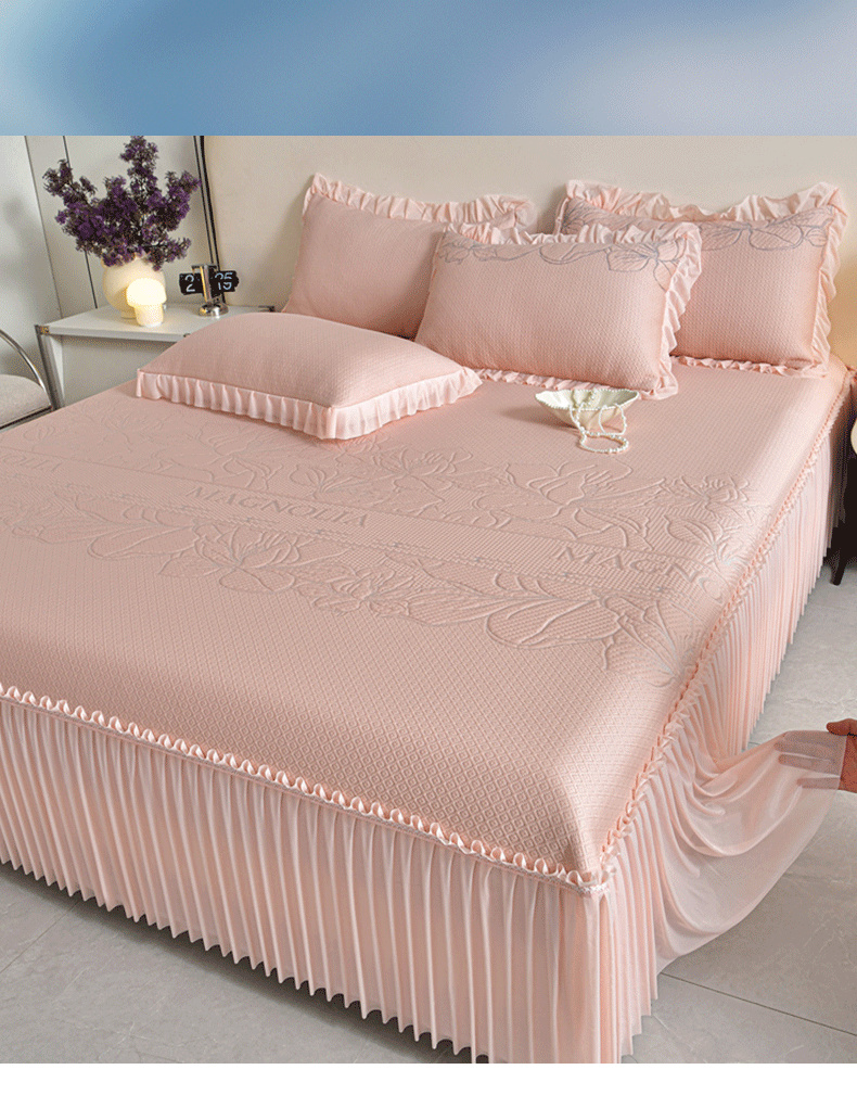 (总)畅畅家纺 2026新款锦氨夏被PE凉感豆豆凉席绣花三明治复合床裙三件套四件套,格韵-粉-床裙款,格韵-灰-床裙款,格韵-蓝-床裙款,格韵-绿-床裙款
