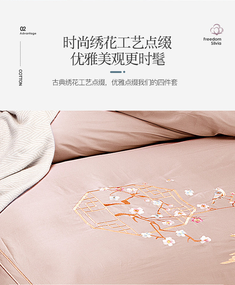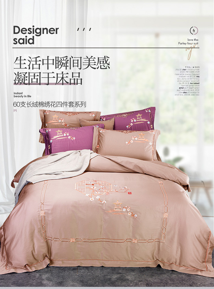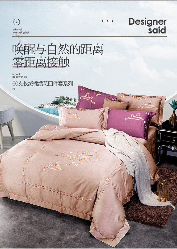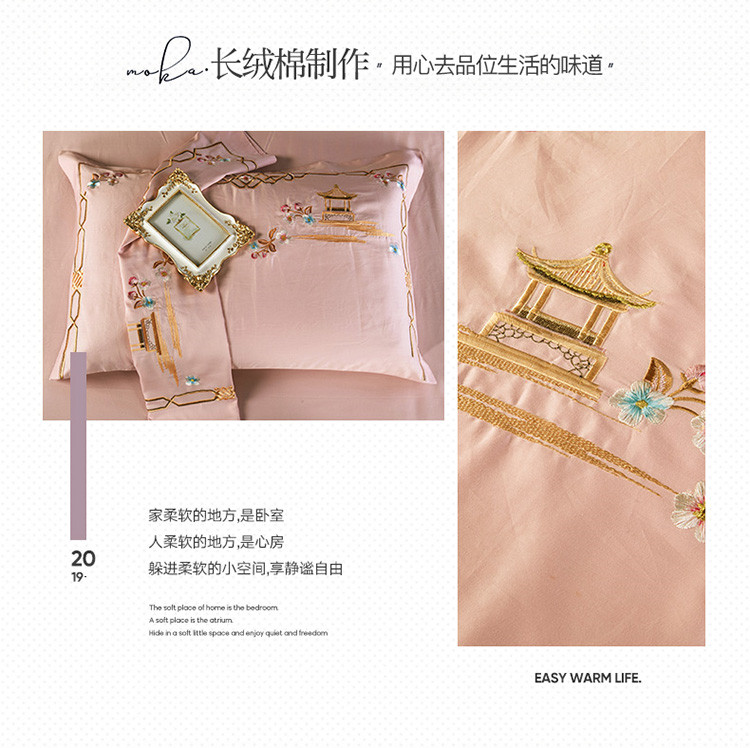 雲归梦 2019新款60S长绒棉绣花四件套 庭院深深-淡玫粉