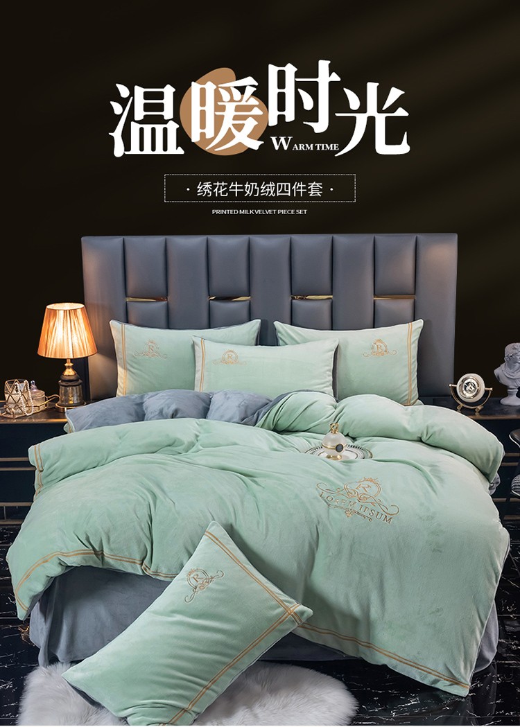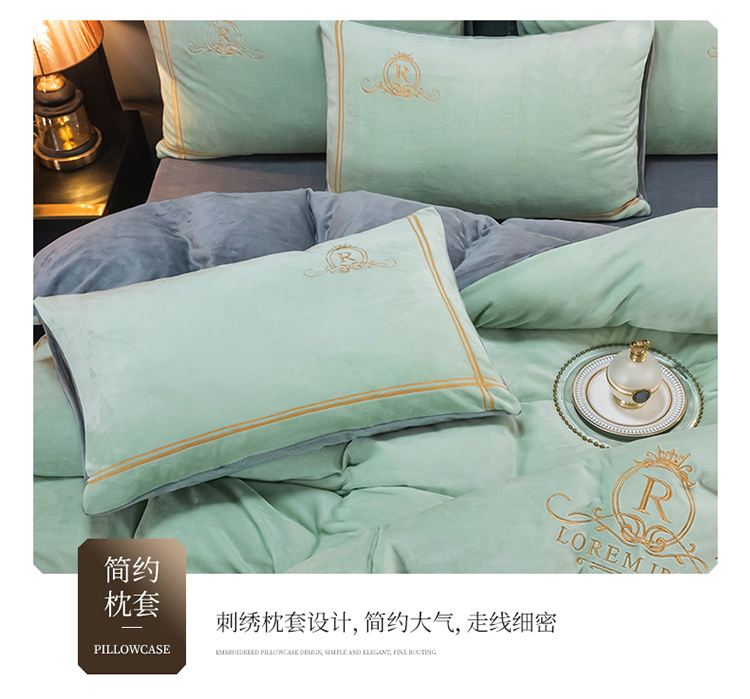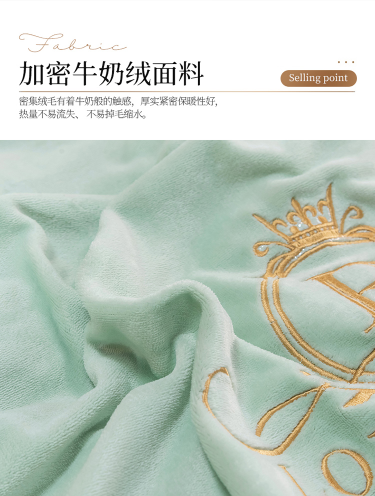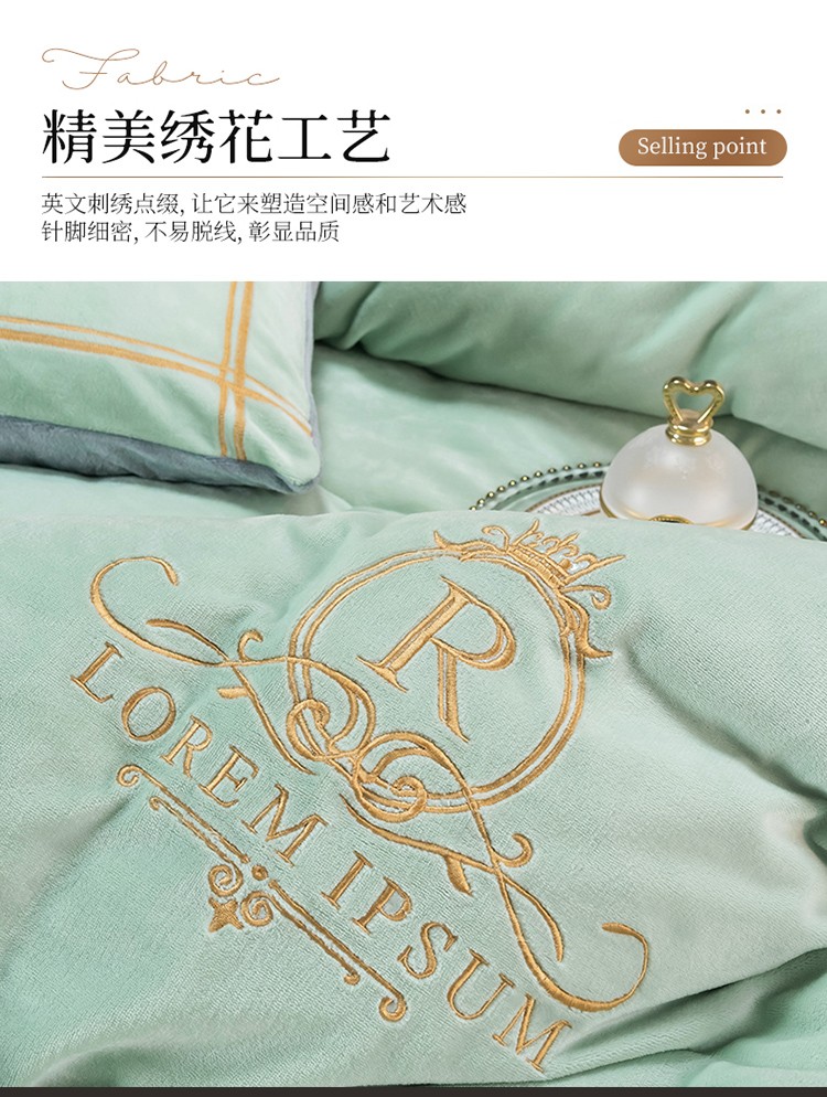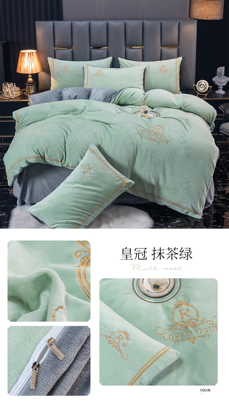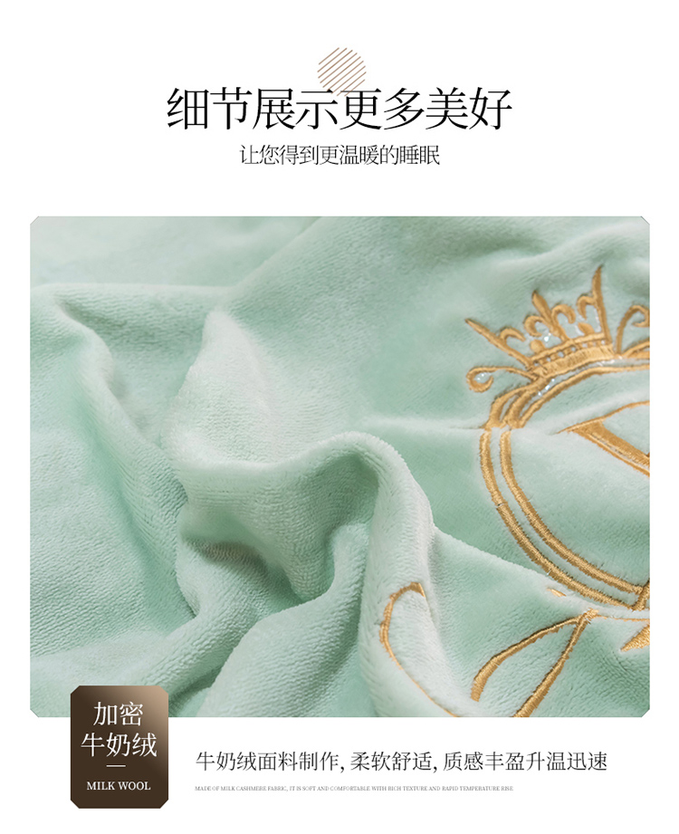 芃成家纺 2021新款牛奶绒绣花四件套 皇冠 抹茶绿