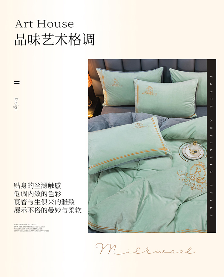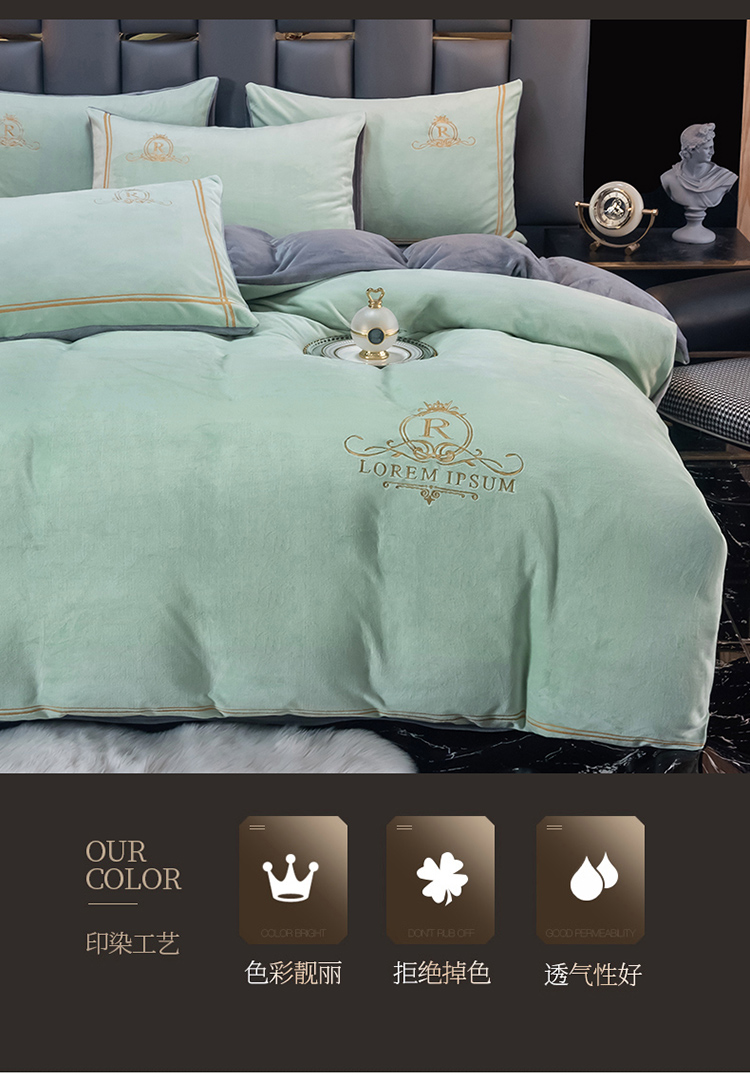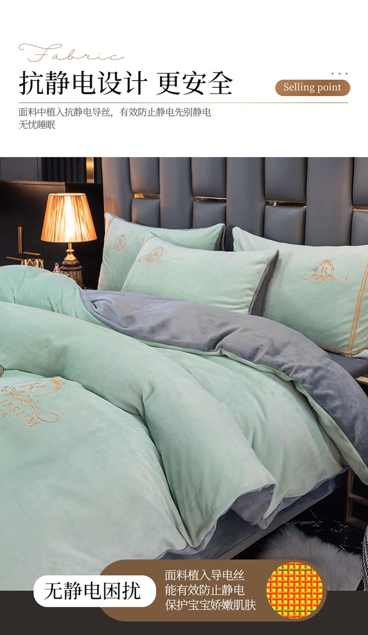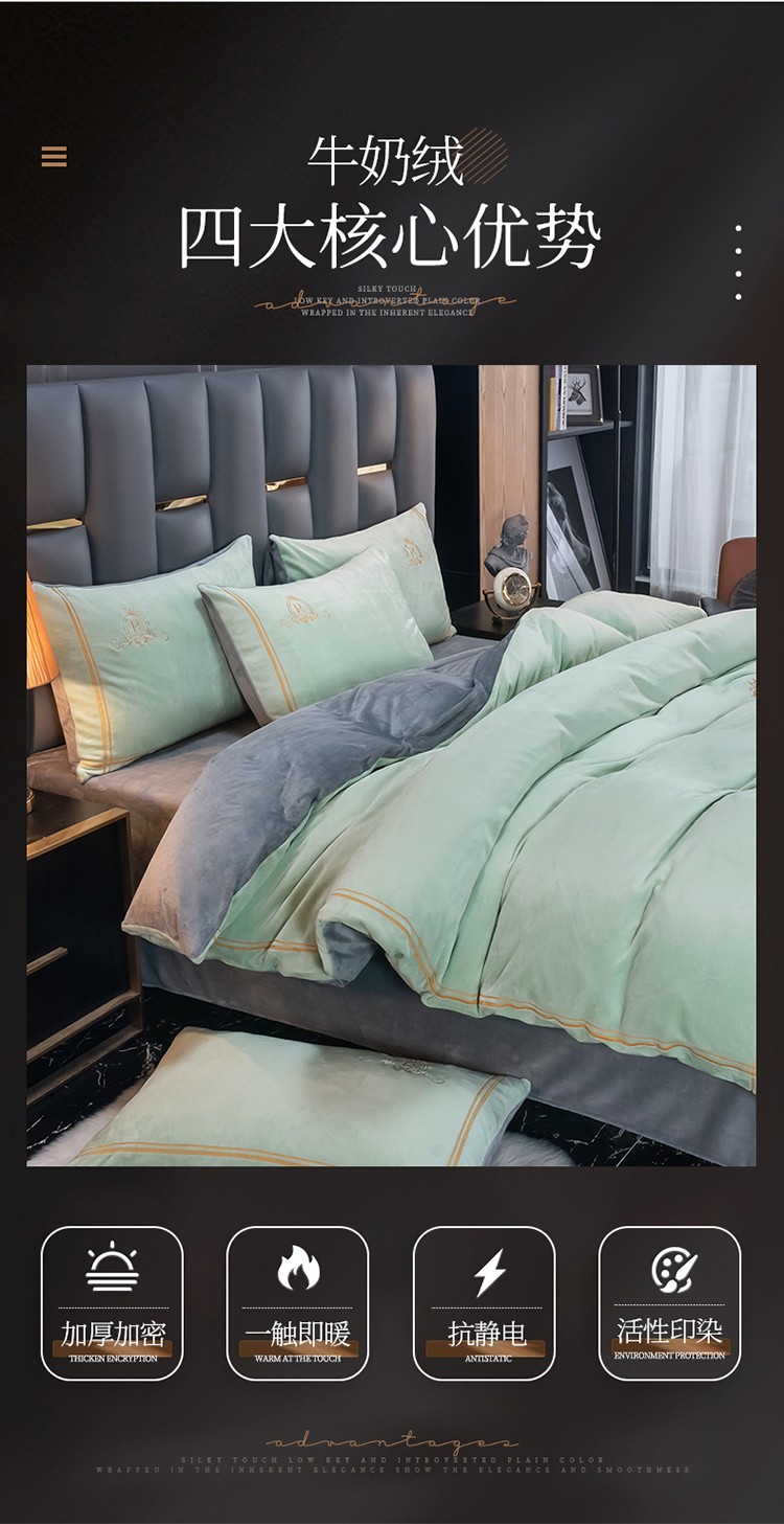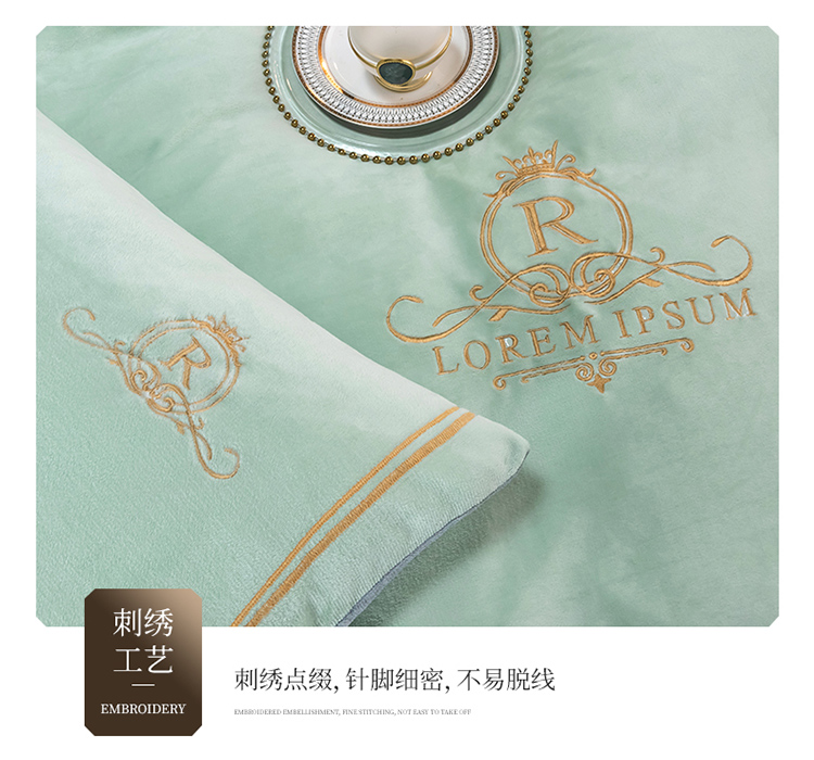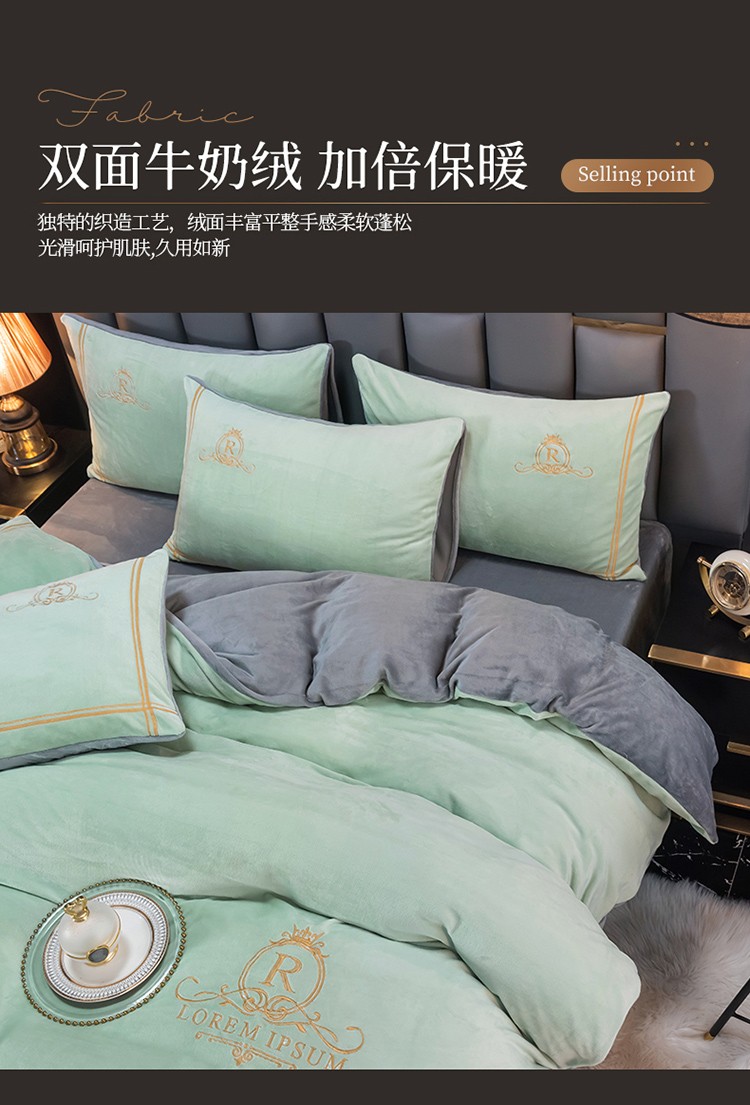 芃成家纺 2021新款牛奶绒绣花四件套 皇冠 抹茶绿