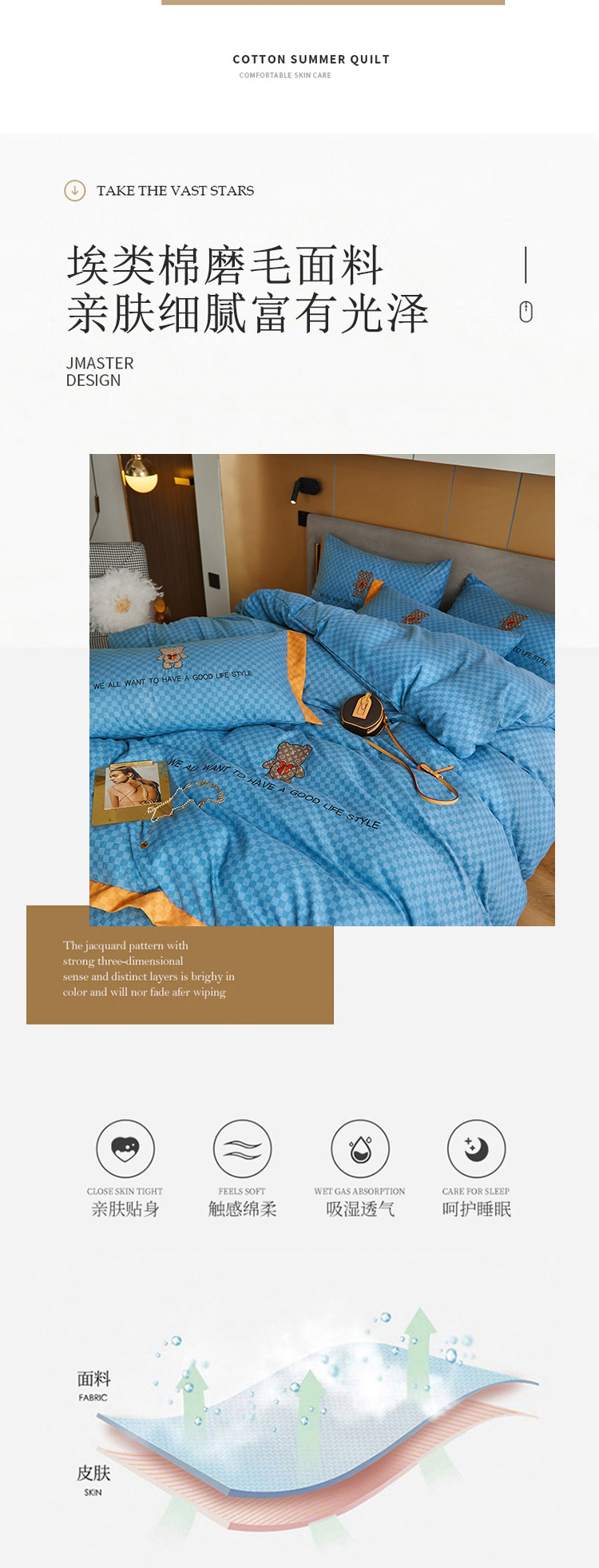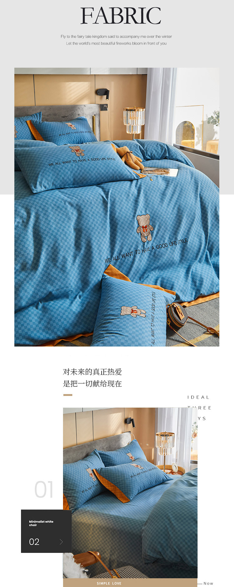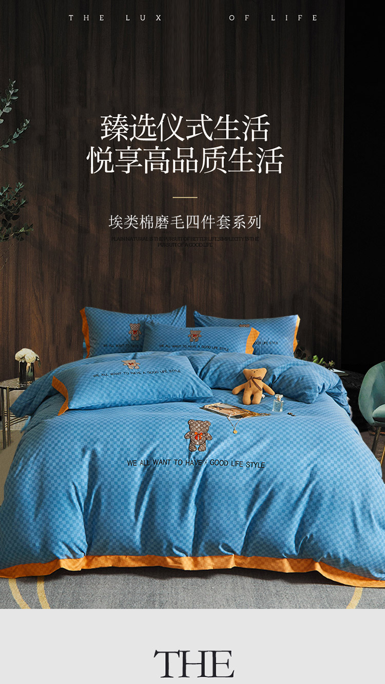 凡客 2021秋冬新款埃类棉刺绣磨毛四件套-熊 轻奢熊-宾利蓝
