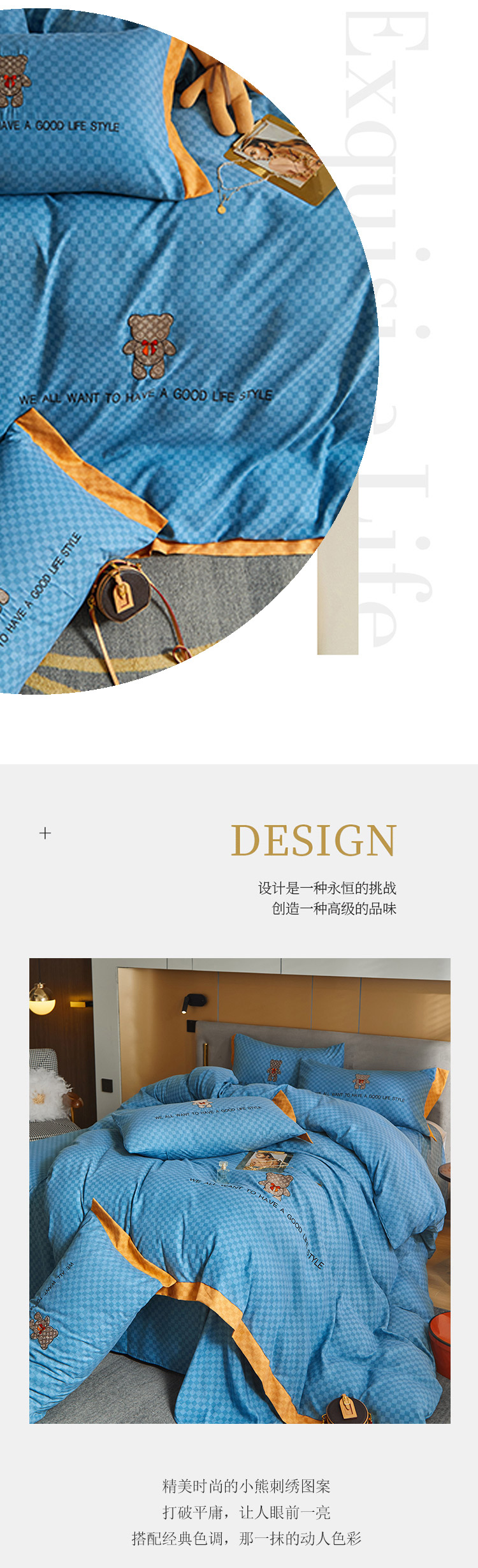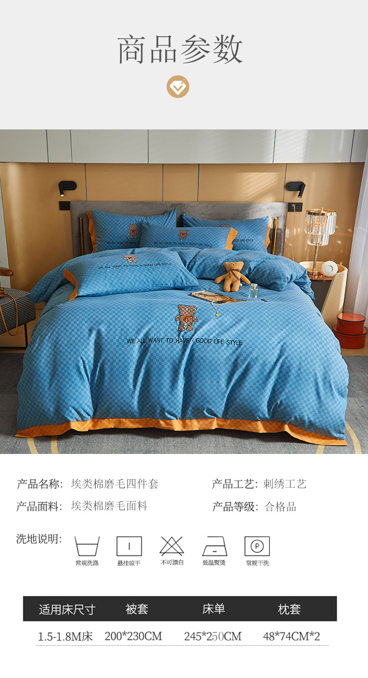 商品名称:凡客 2021秋冬新款埃类棉刺绣磨毛四件套-熊 轻奢熊-宾利蓝