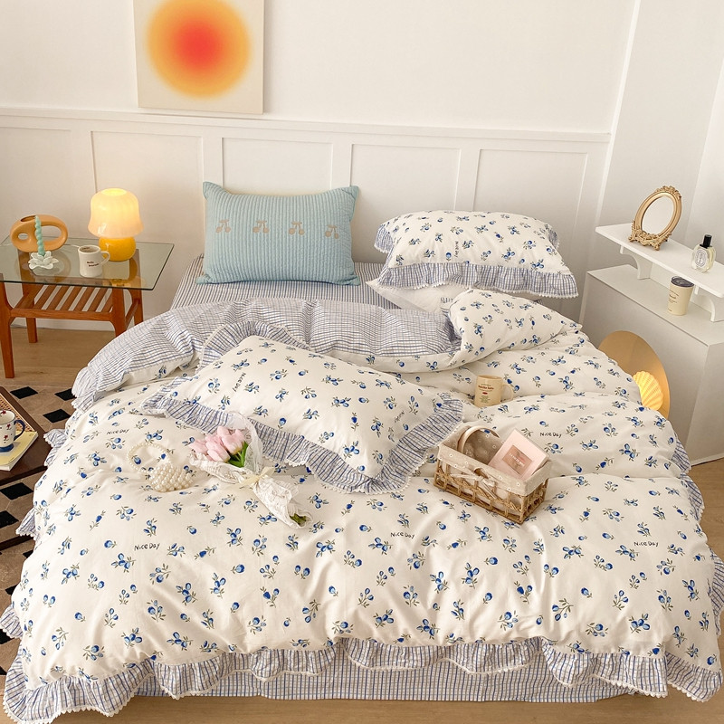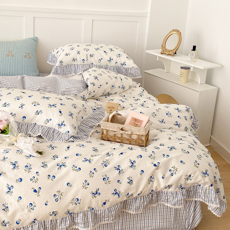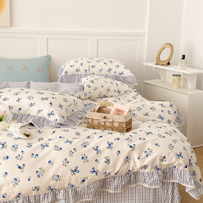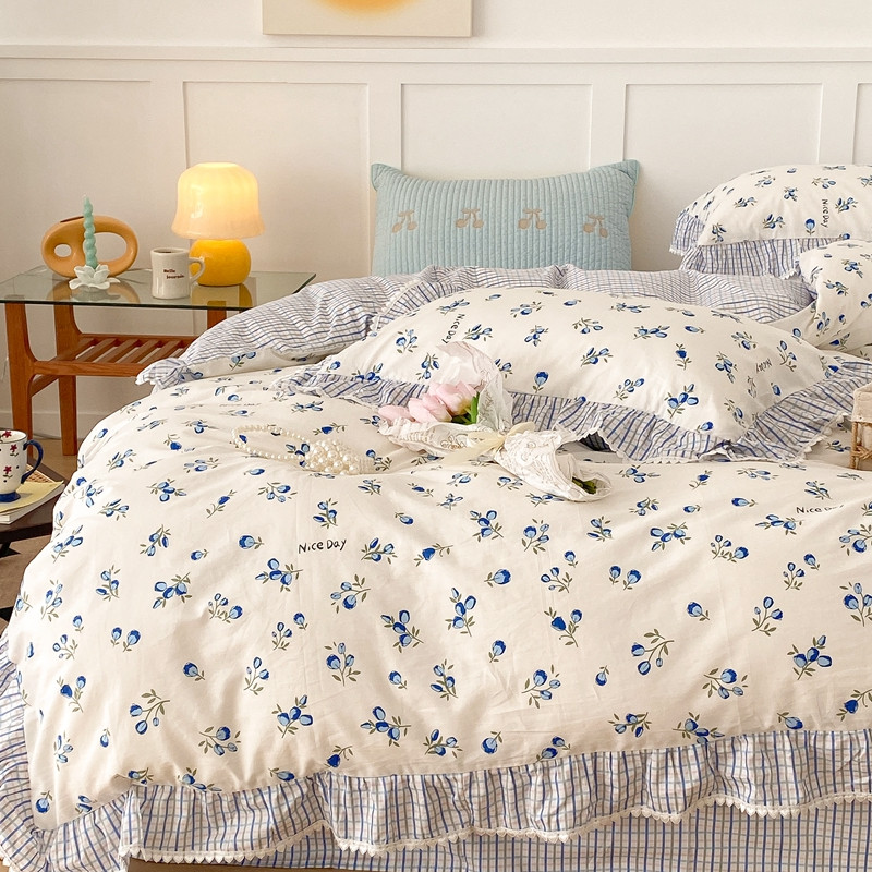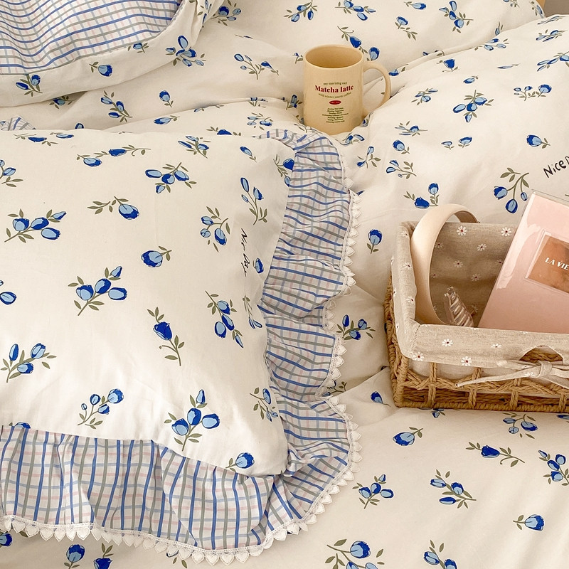 商品名称:昔可家纺 2022新款全棉格子花边款四件套 蓝色郁金香