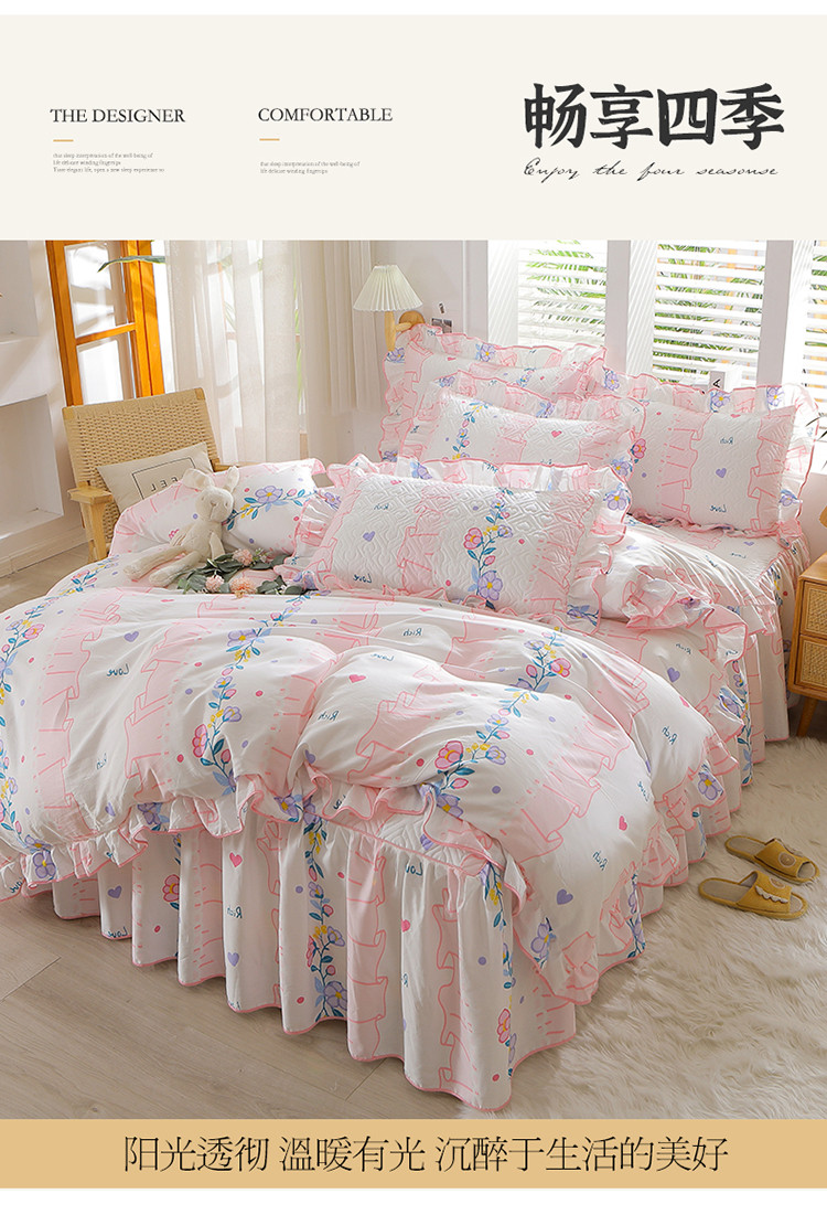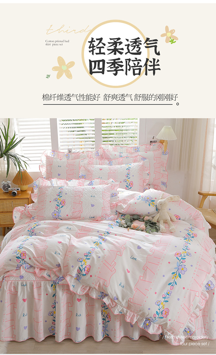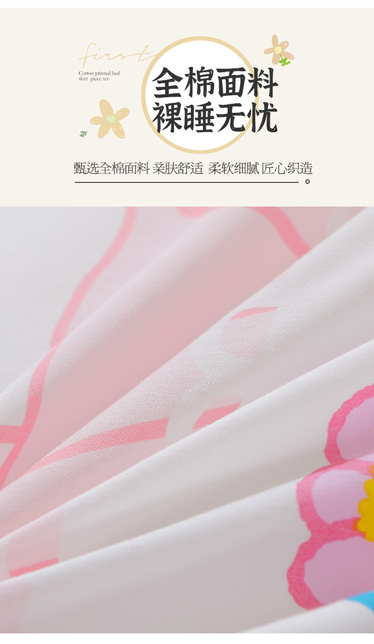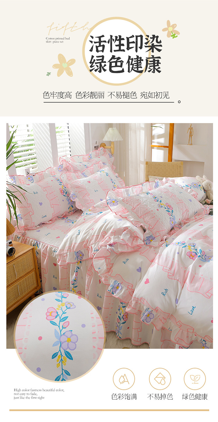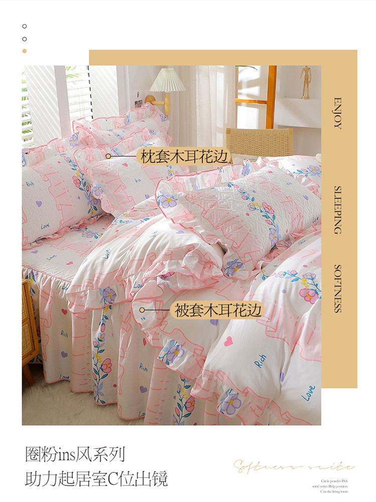 当前位置: 91家纺网 > 商品网购 > 床品套件 > 四件套 > 全棉普通四件套 > 宜凡家纺 2023新款全棉印花花边床裙四件套 千寻