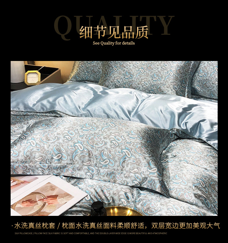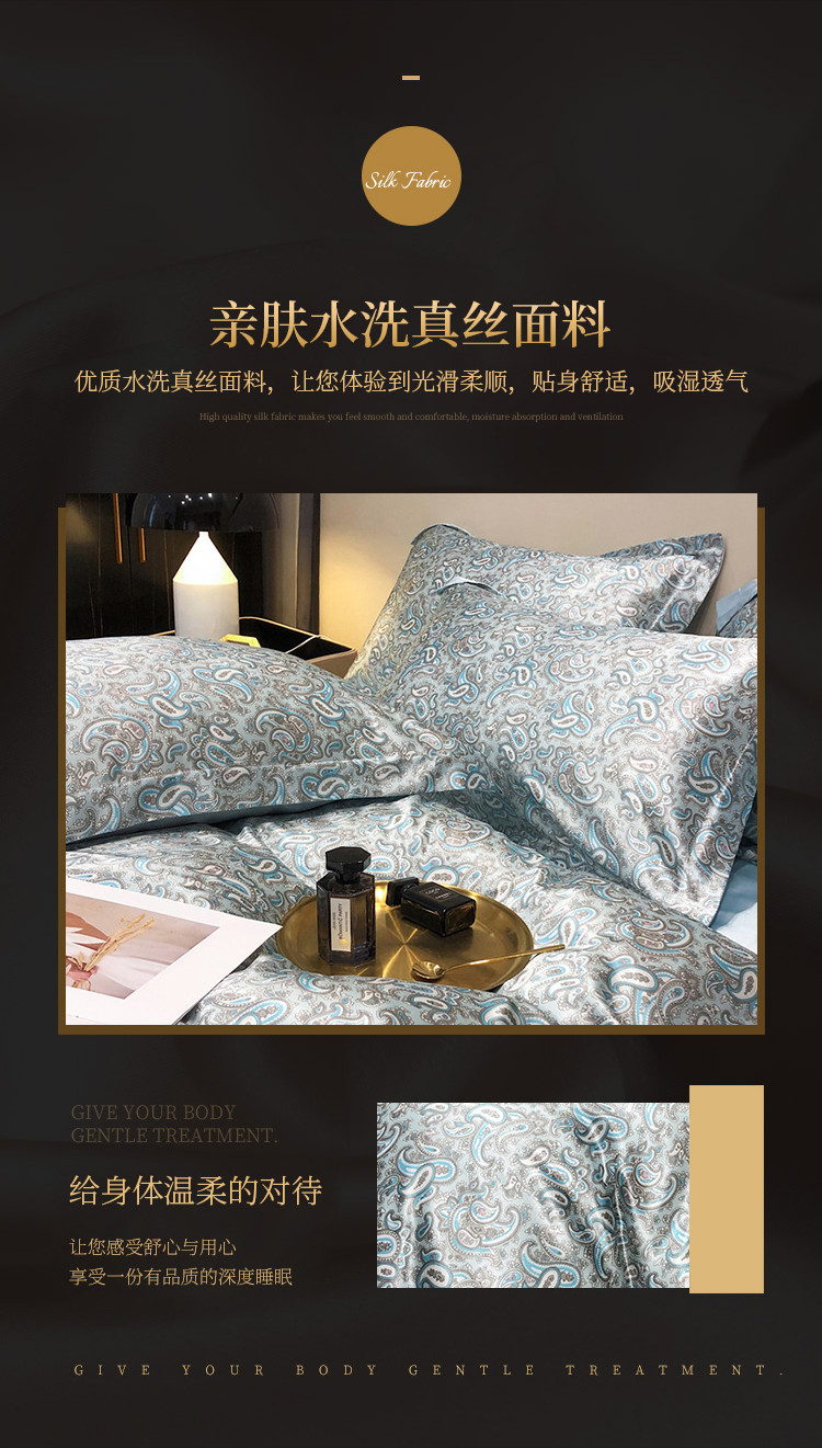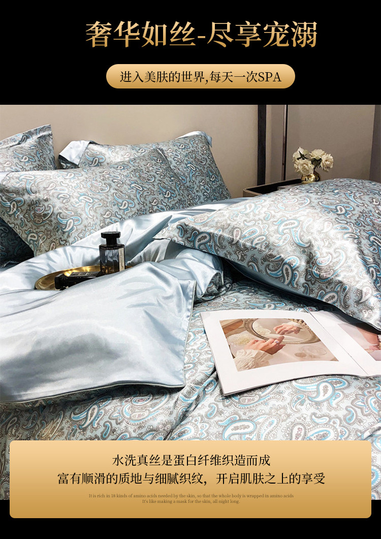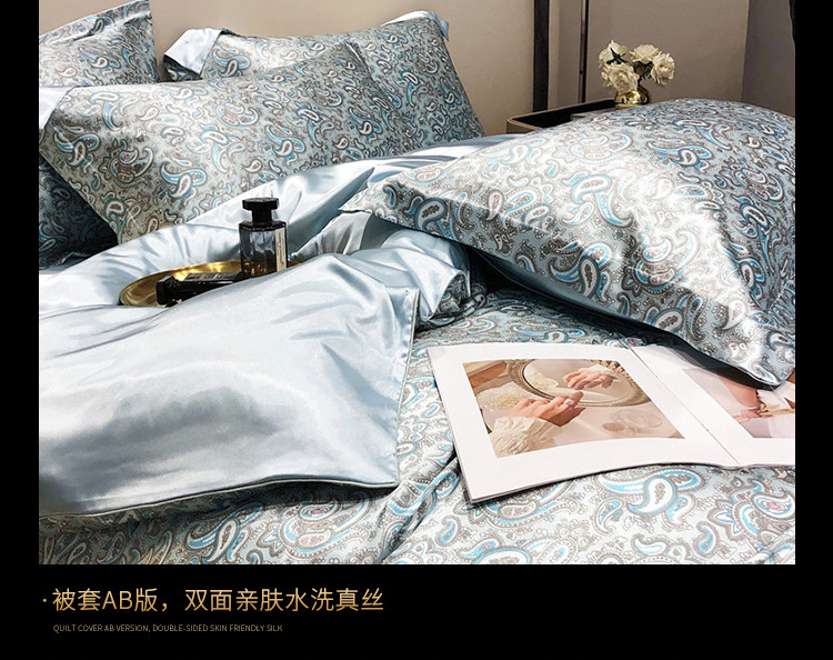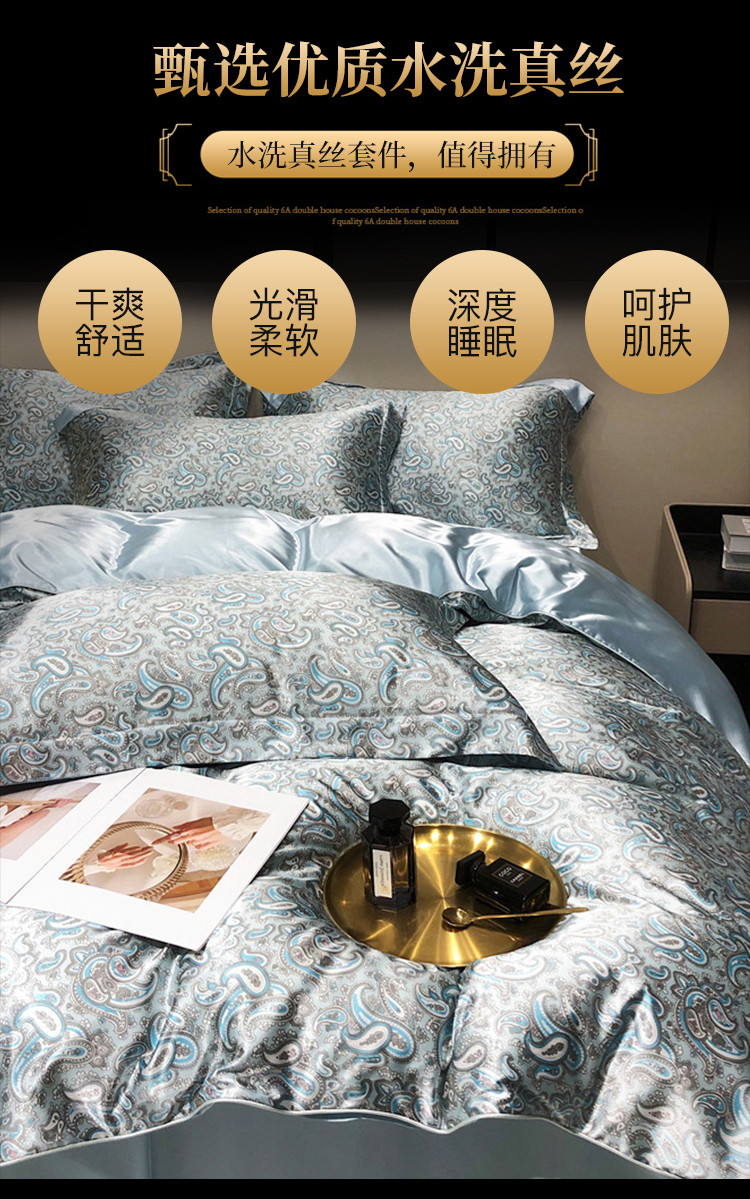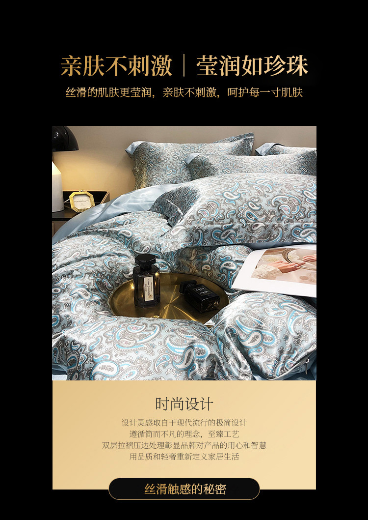 黄鹂鸟 2025新款高端轻奢丝滑裸睡丝绸数码印花水洗真丝天丝四件套系列 -风格一 腰果蓝