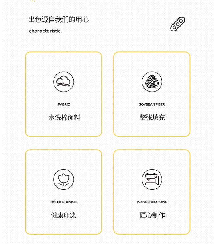 • 填充纤维种类: 大豆蛋白改性聚酯纤维
