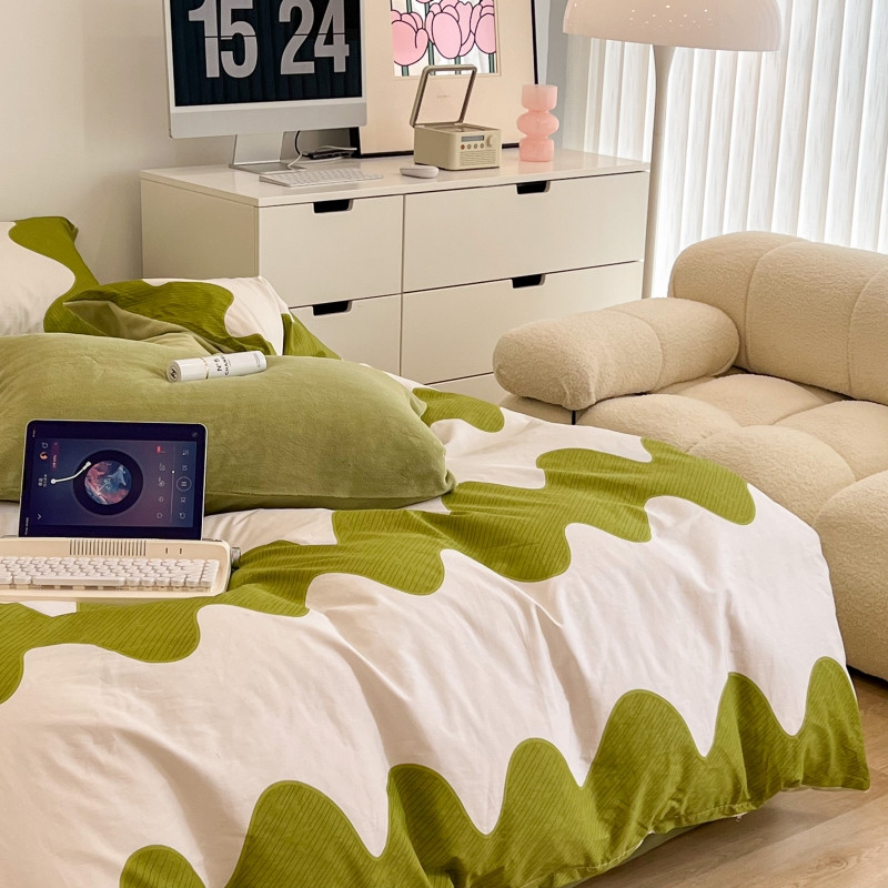 商品名称:昔可 2022新款梦幻公主风系列棉加绒印花四件套 绿波纹