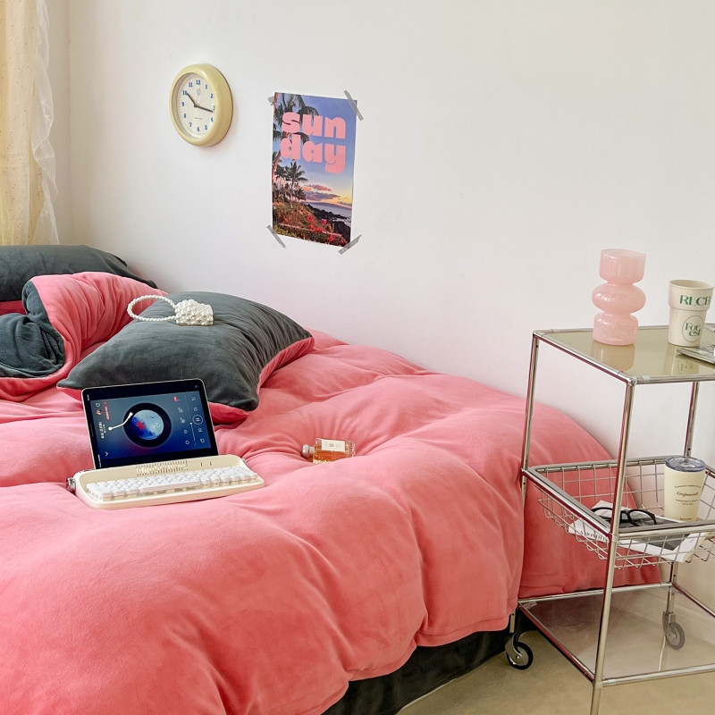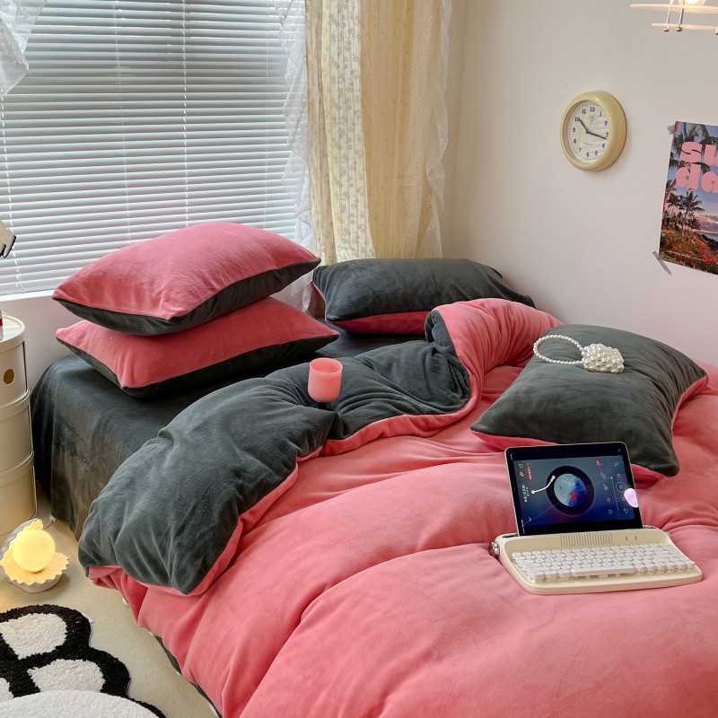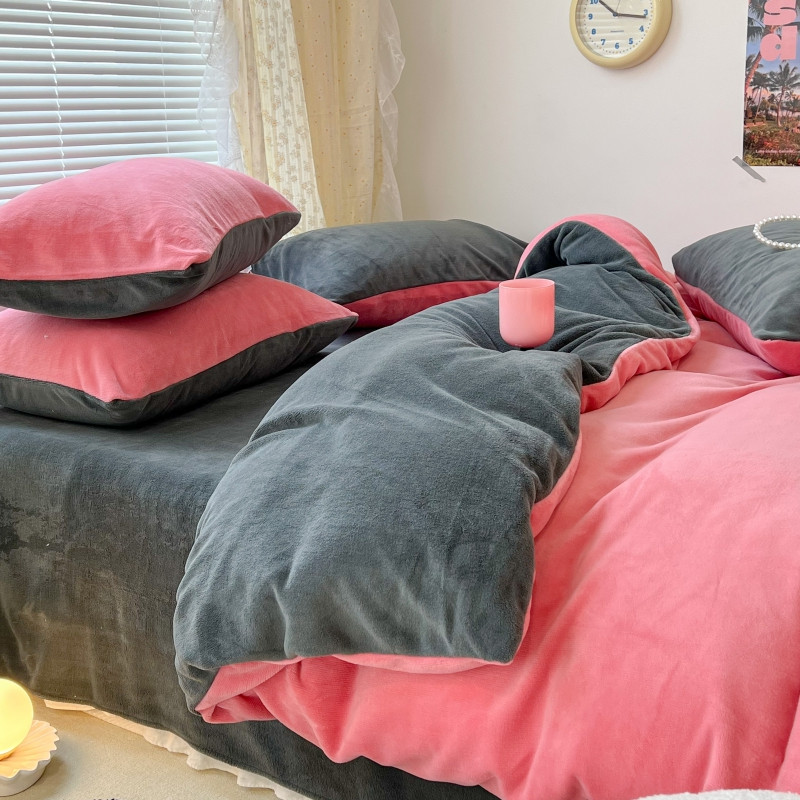 昔可 2022新款奶油双拼系列牛奶绒四件套 树莓红拼深灰