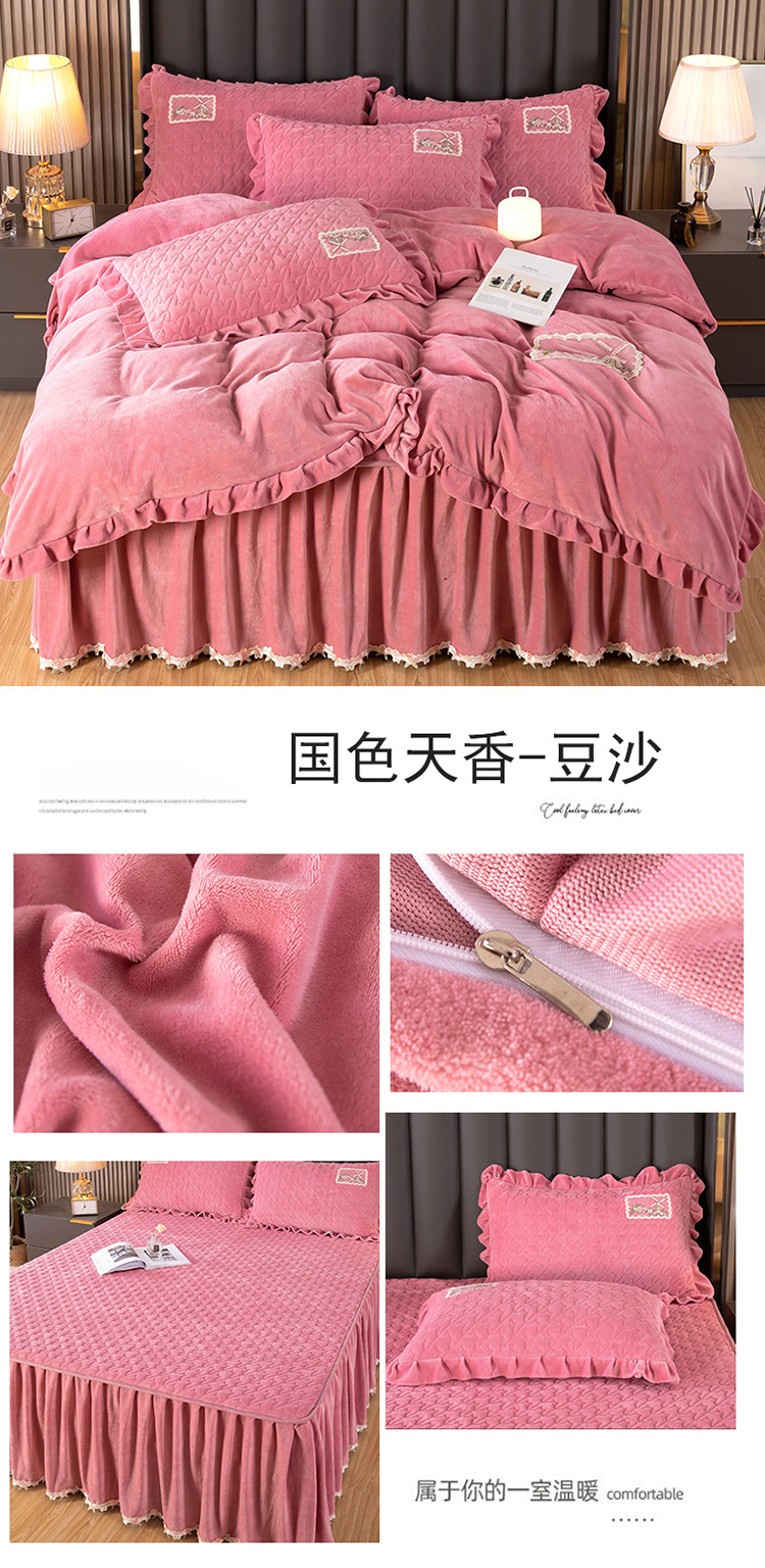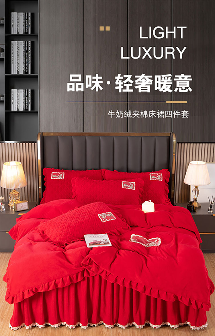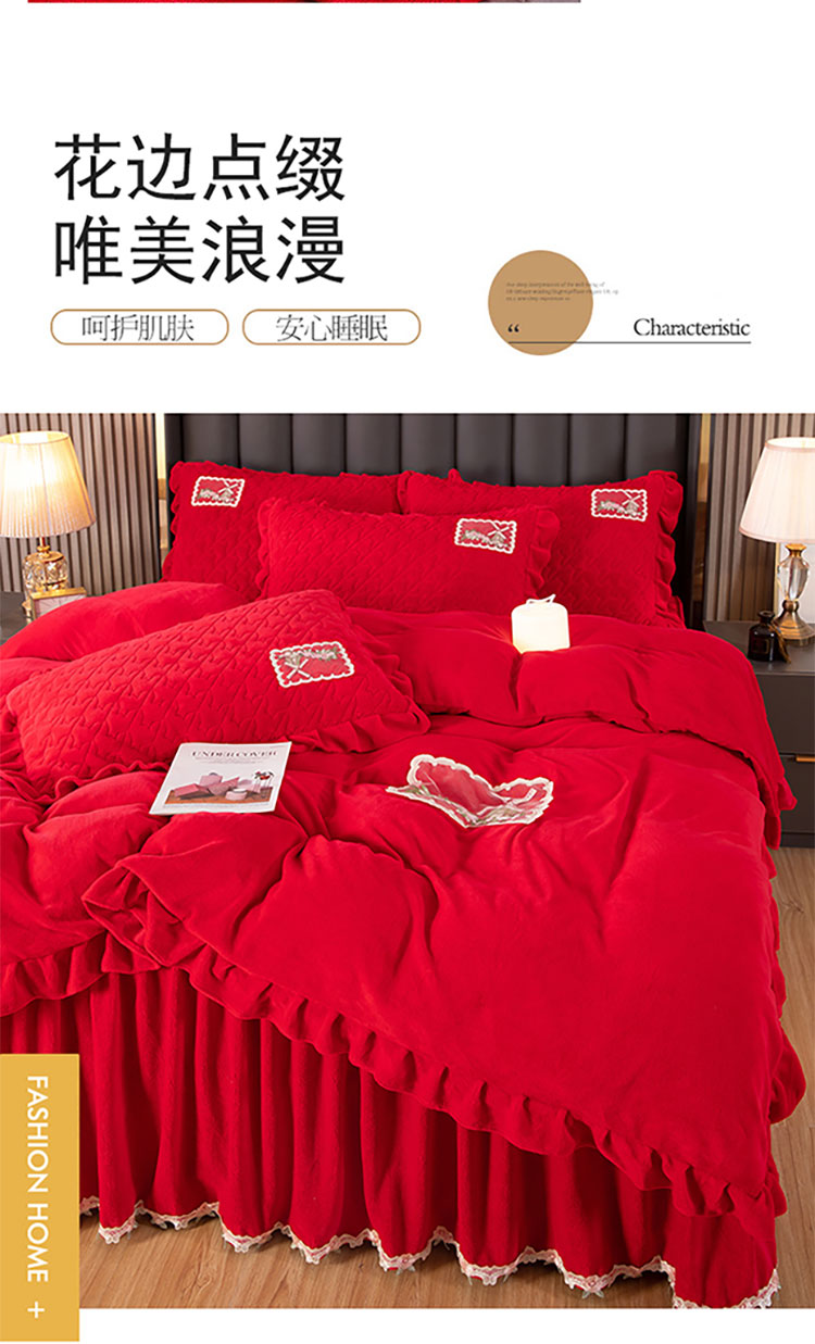 当前位置: 91家纺网 > 商品网购 > 床品套件 > 四件套 > 牛奶绒四件套 > 高克重牛奶绒四件套夹棉法莱荷叶边床裙加厚水晶韩版纯色绣花被套