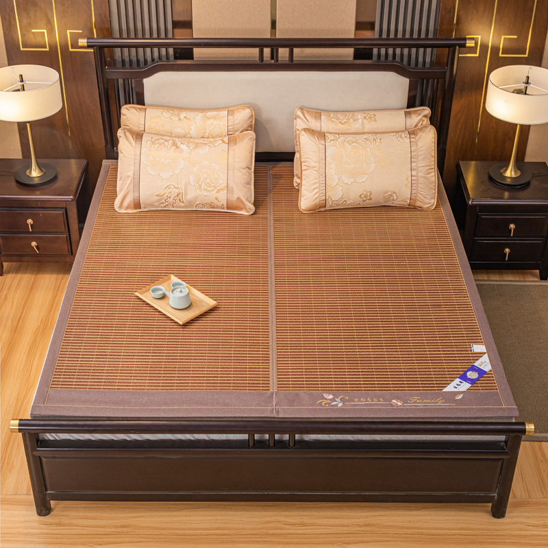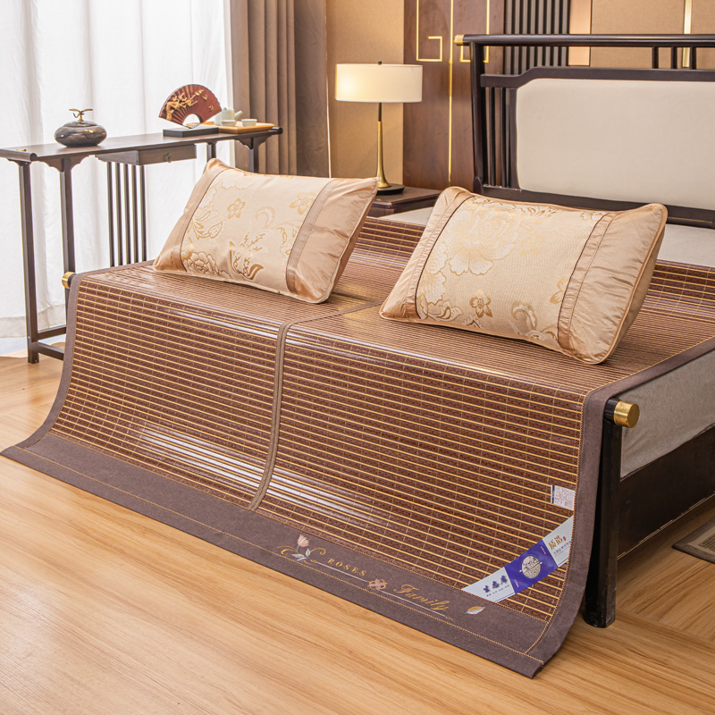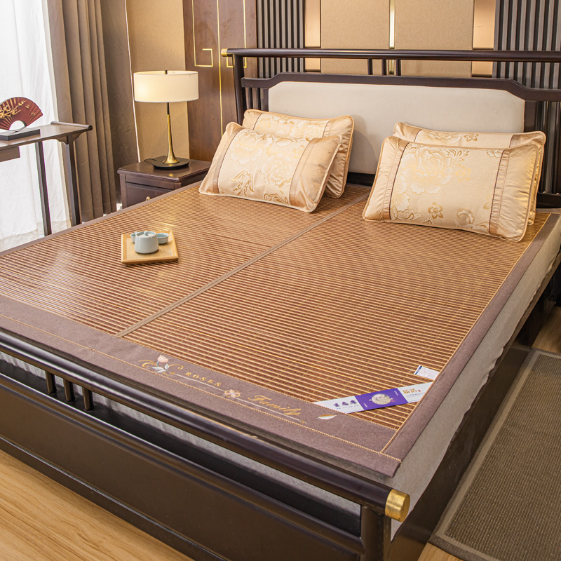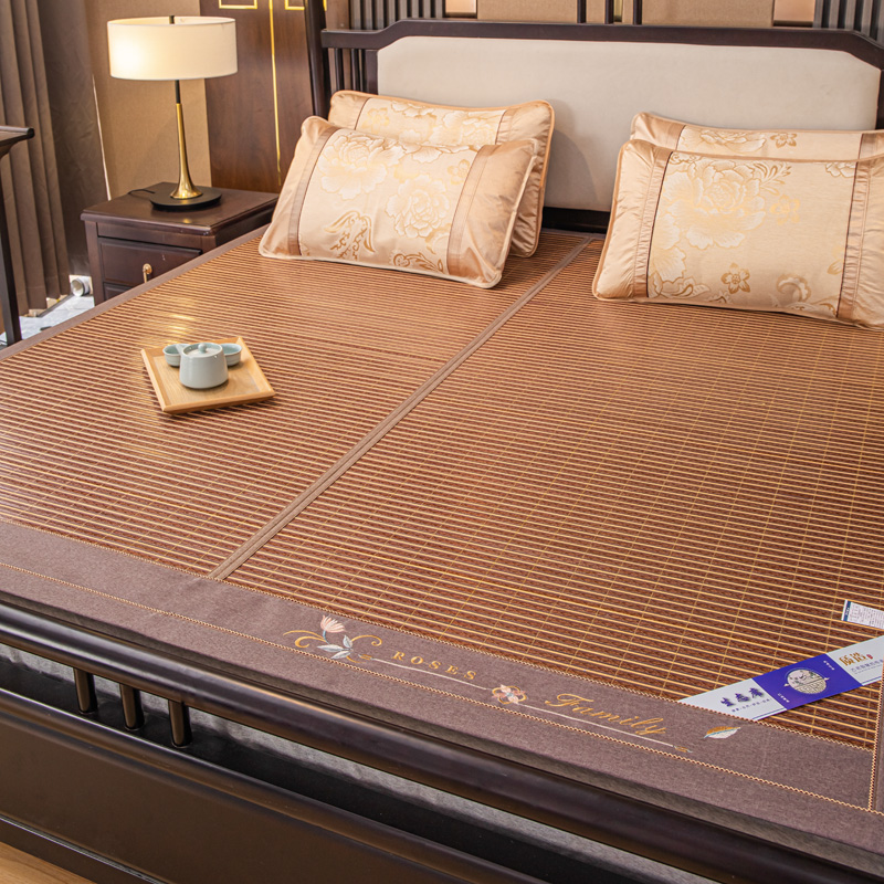 (总)新月家纺 2022新款冰藤席绣花款凉席套件,艾草 金色,艾草 咖色
