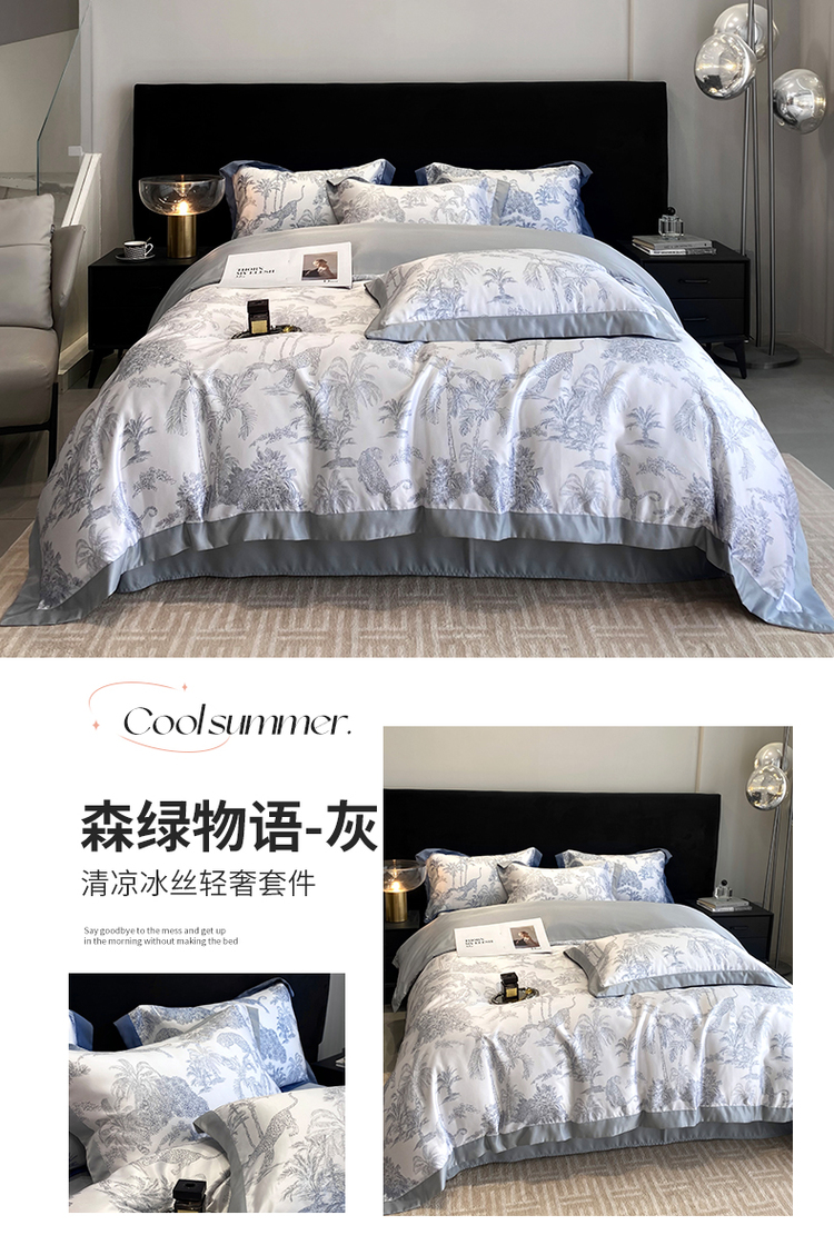 当前位置: 91家纺网 > 商品网购 > 床品套件 > 四件套 > 水洗真丝四件套 > 优悦 2023新款水洗真丝轻奢印花款四件套 森绿物语-灰