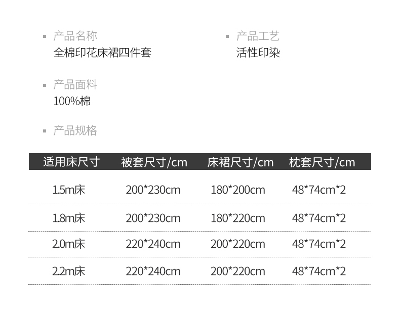 2*2.2m床裙四件套(床裙200*220 被套200*230+枕套一对) | ¥255.00 |