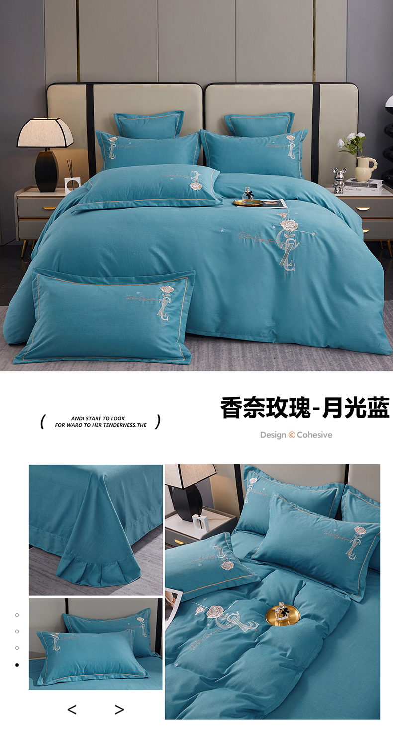 馨雅家纺 2025新款全棉绣花四件套系列 香奈玫瑰-月光蓝