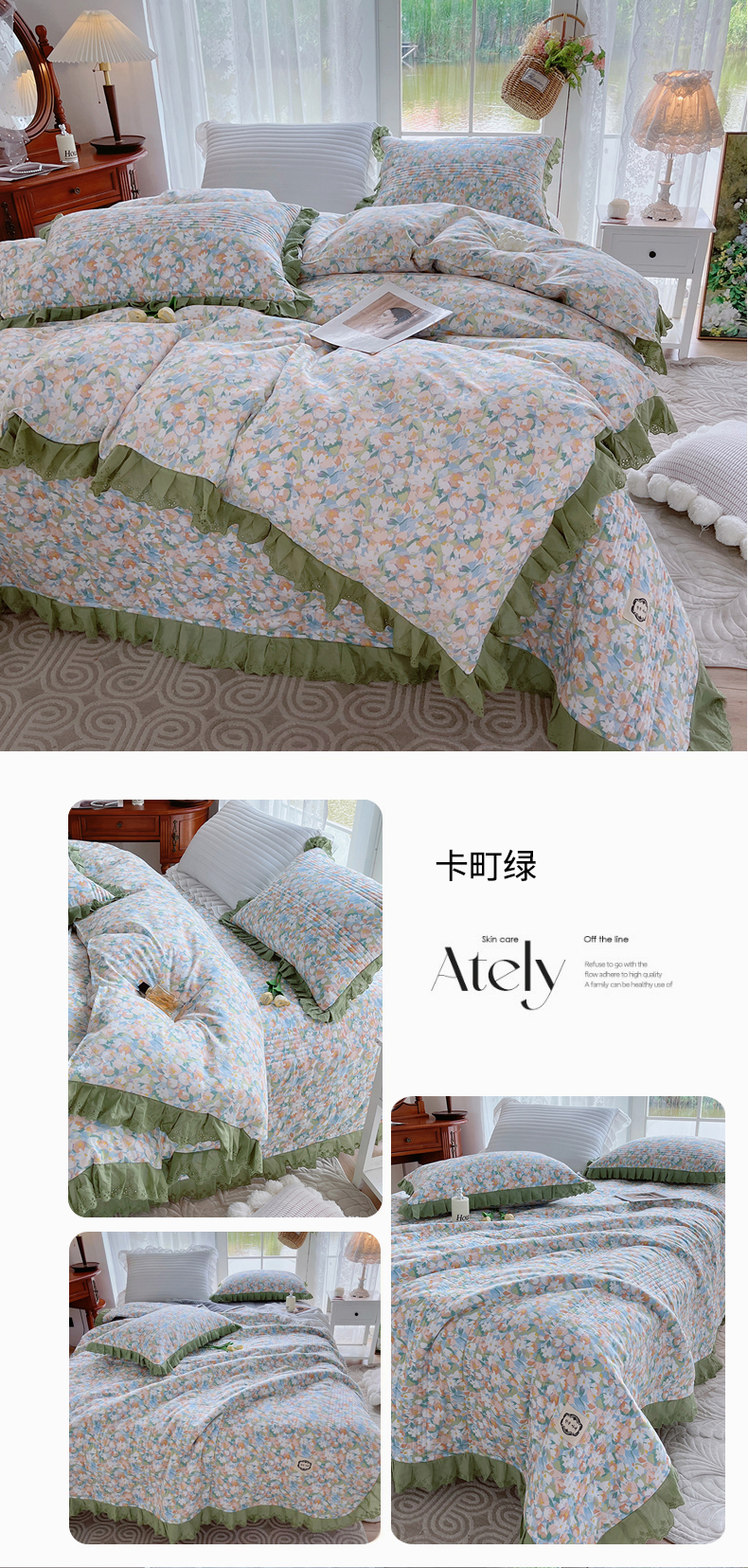 当前位置: 91家纺网 > 商品网购 > 床品套件 > 四件套 > 全棉普通四件套 > 菊上家纺 2023秋冬新品法式花边全棉床盖四件套 卡町绿