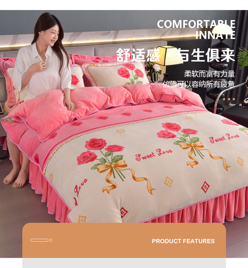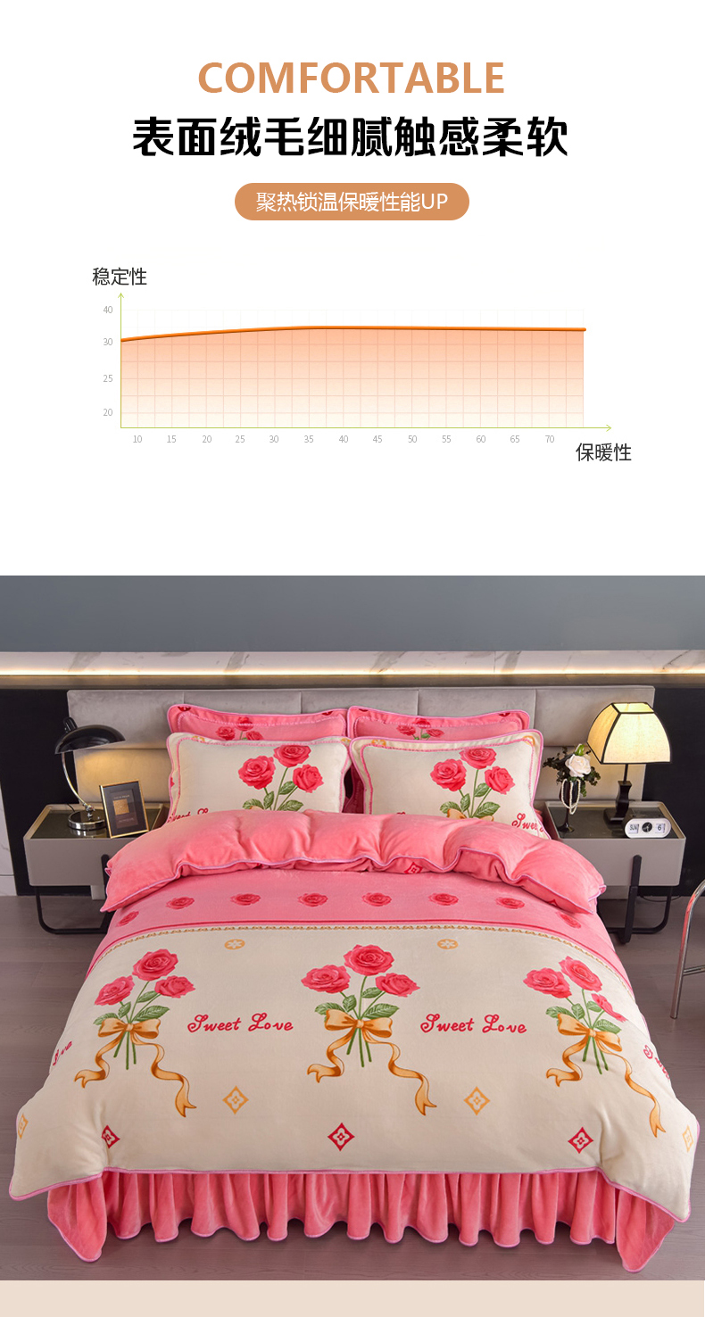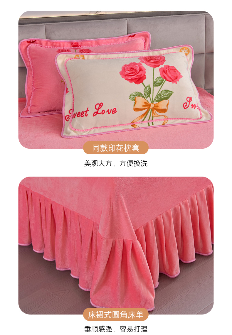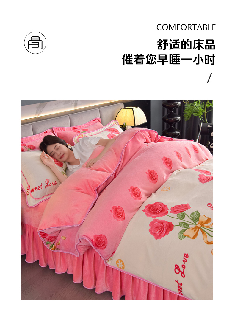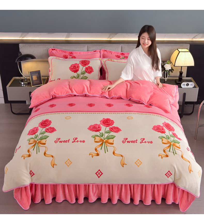 商品名称:锦铭源2025年7斤加厚印花牛奶绒四件套水晶法莱金貂绒床裙款粉玫瑰