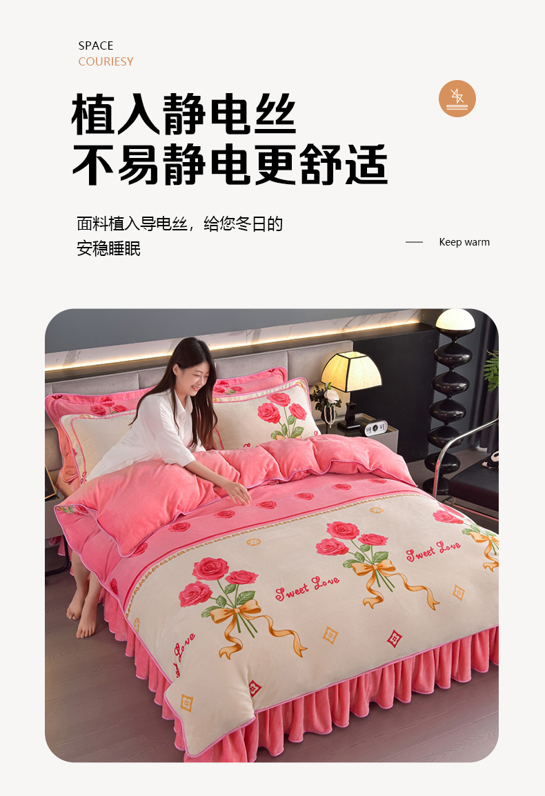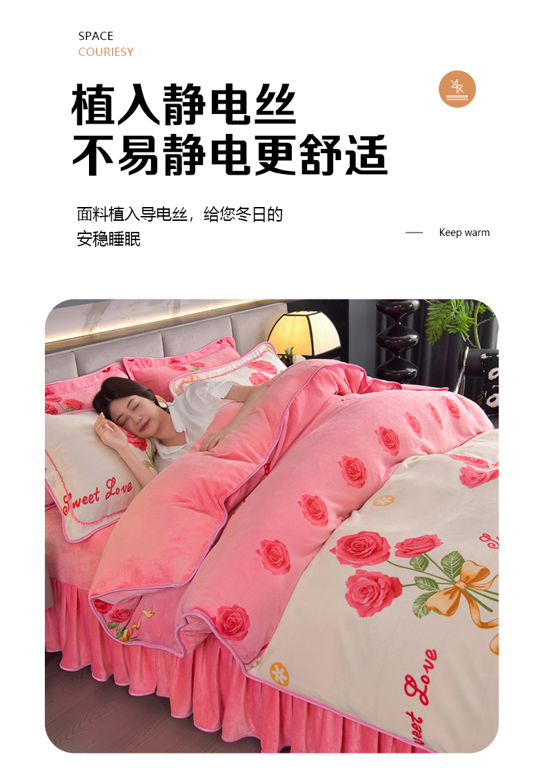 锦铭源2025直播印花7斤牛奶绒金貂水晶法莱珊瑚绒四件套床裙款花恋,花恋